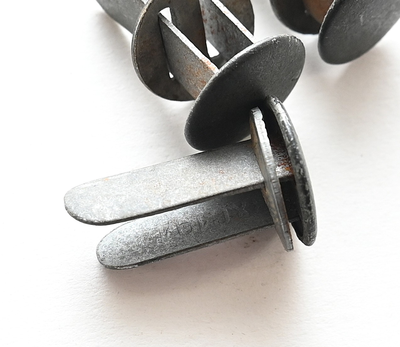 The rivets show overall normal signs of storage wear. All original paint is present. All 3 are marked with the same maker 'SC' and dated '1944'. Each rivet has a washer.