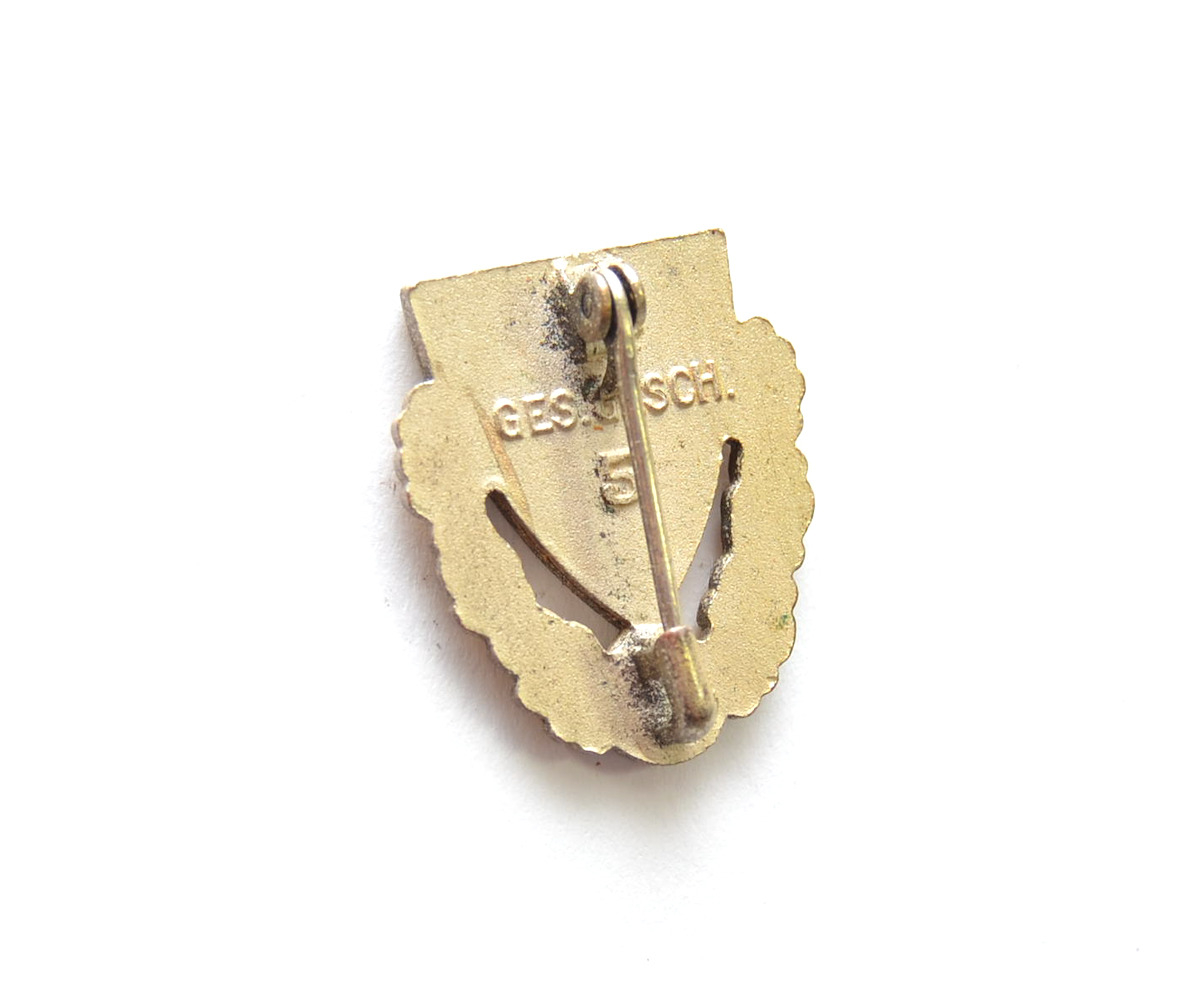 The overall condition of the pin is excellent. No enamel damages. Complete with working pin on the back. Marked with 'Ges.Gesch' and the number '5'.