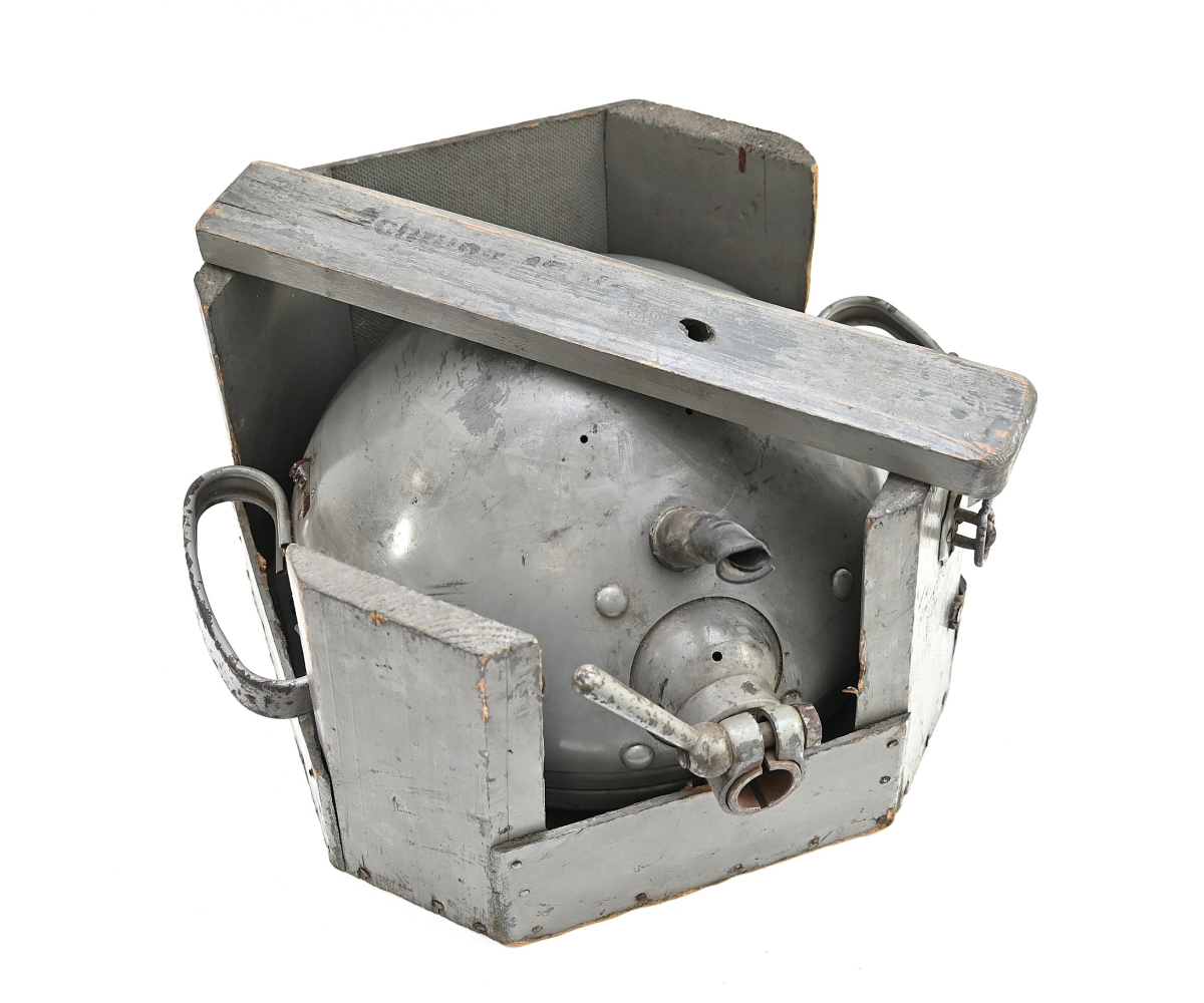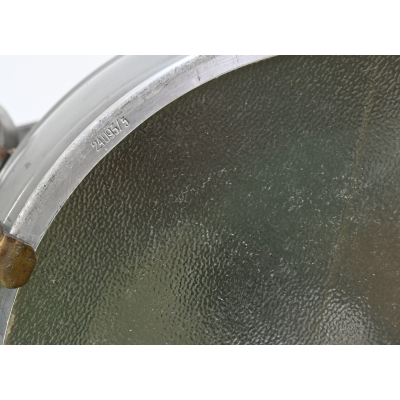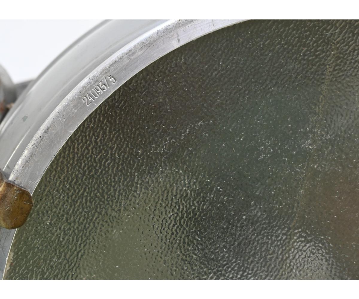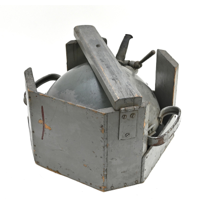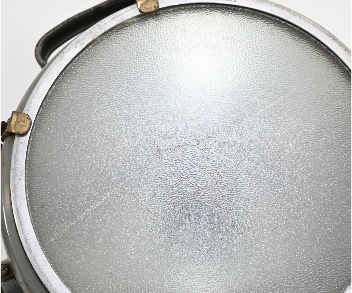 The light shows overall normal signs of wear. It contains all of its period paint. A wooden transport crate was build for it in the same color. We got it with the story it came from the storage of an airfield, but looking at the color it may also resembles the Kriegsmarine?!