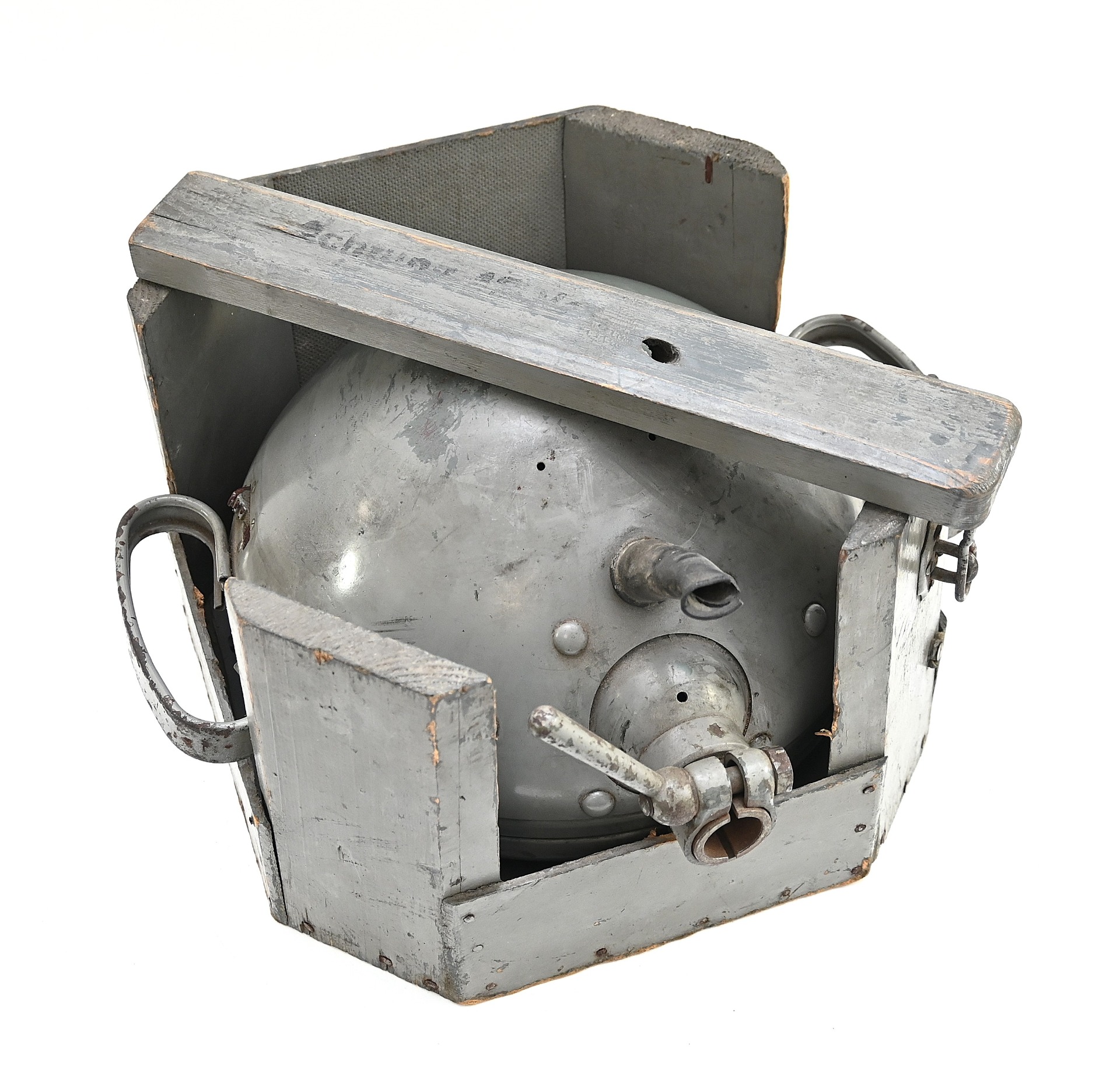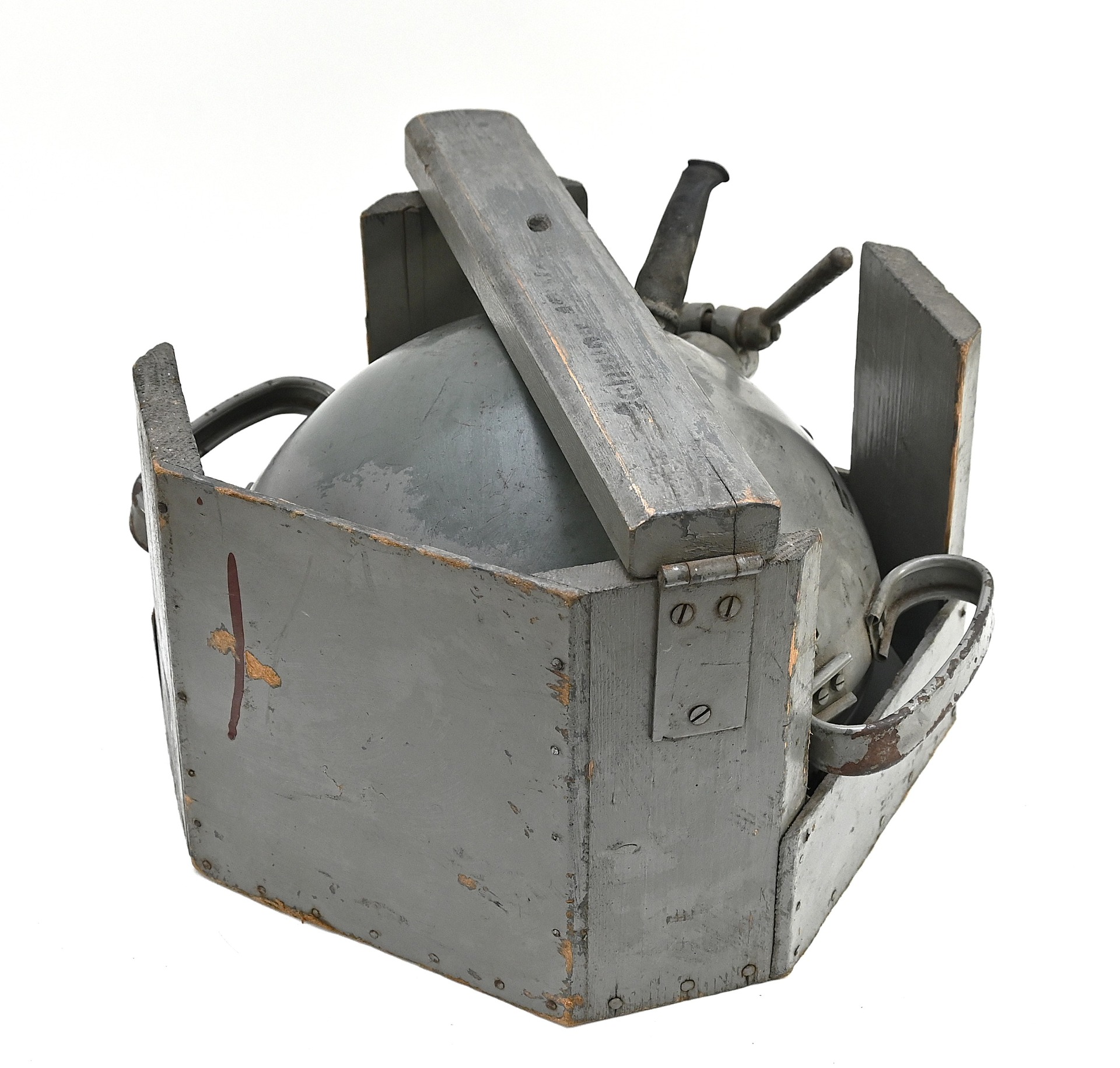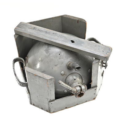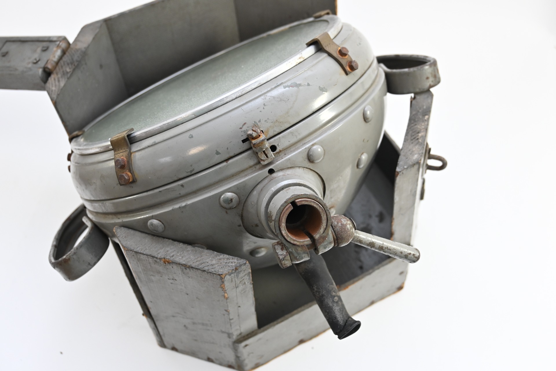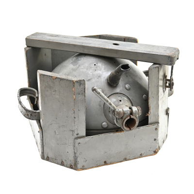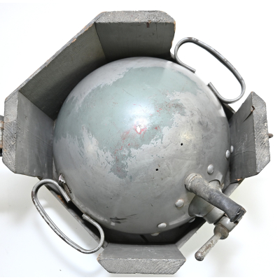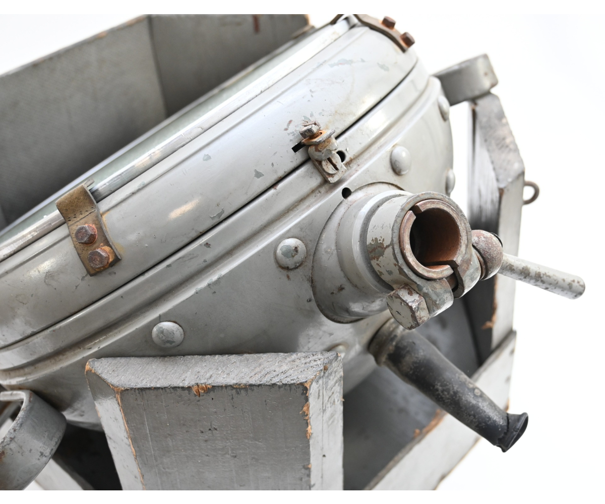 The light shows overall normal signs of wear. It contains all of its period paint. A wooden transport crate was build for it in the same color. We got it with the story it came from the storage of an airfield, but looking at the color it may also resembles the Kriegsmarine?!