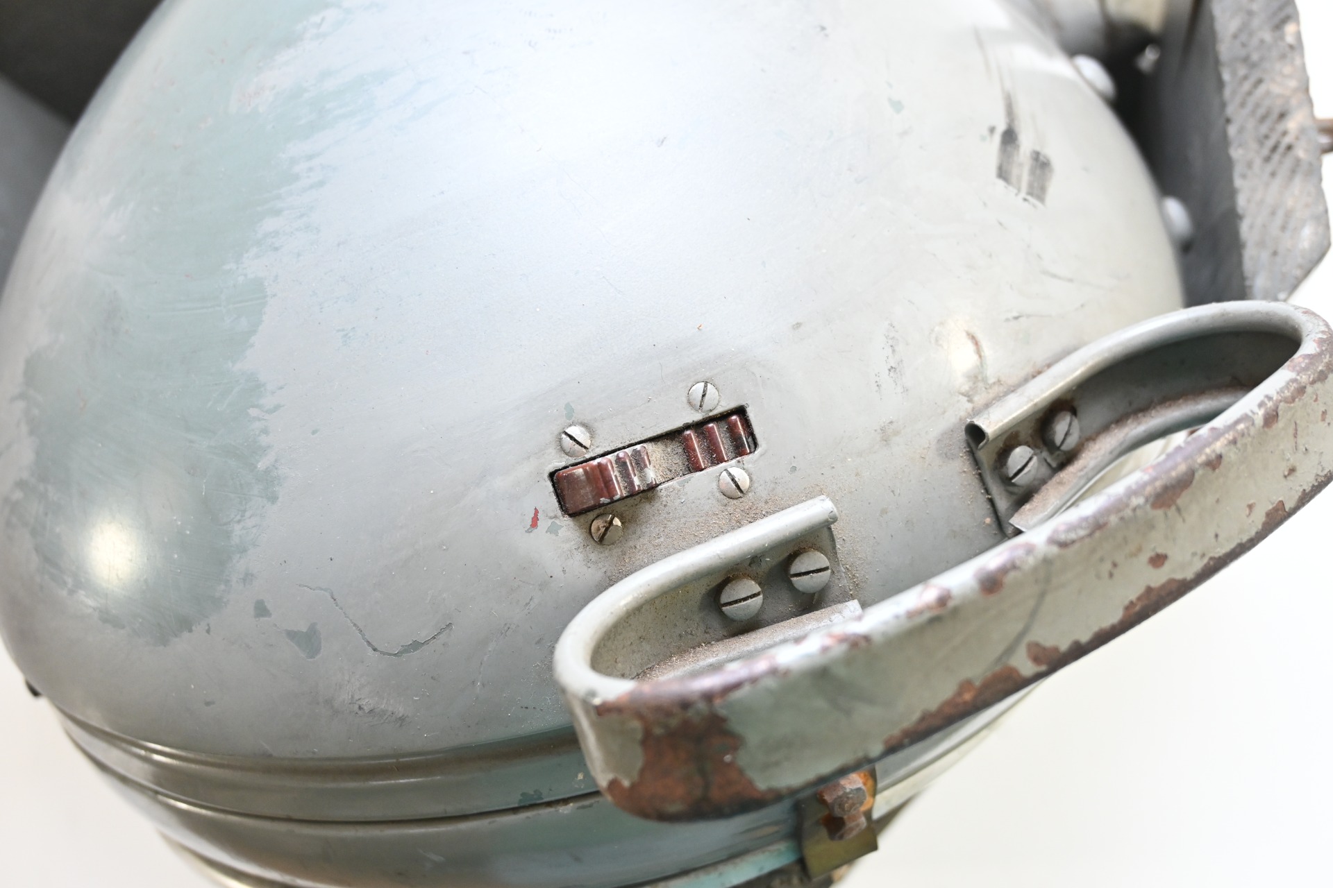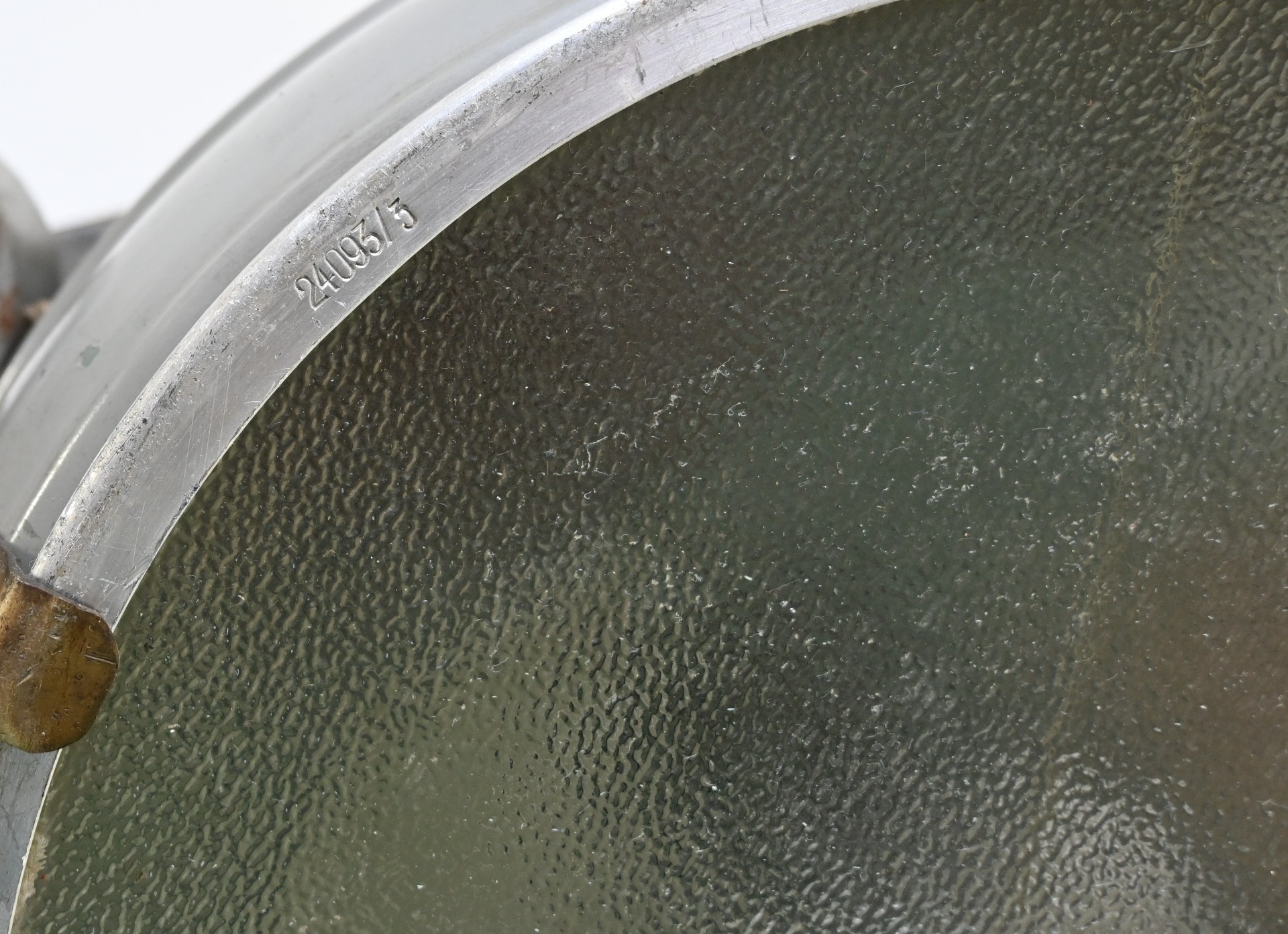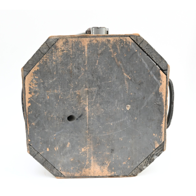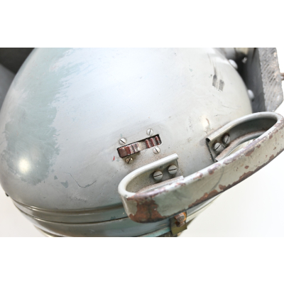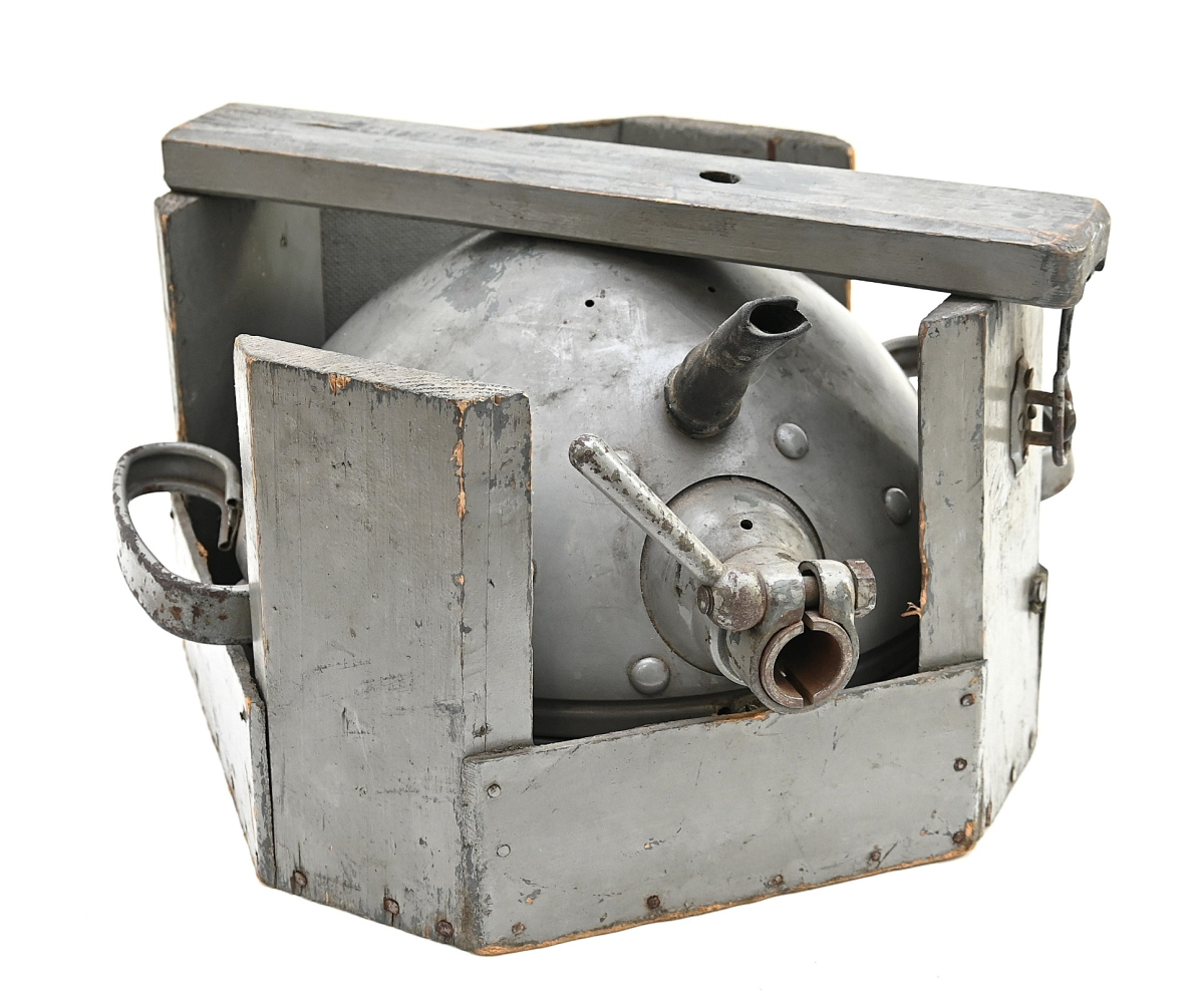 The light shows overall normal signs of wear. It contains all of its period paint. A wooden transport crate was build for it in the same color. We got it with the story it came from the storage of an airfield, but looking at the color it may also resembles the Kriegsmarine?!