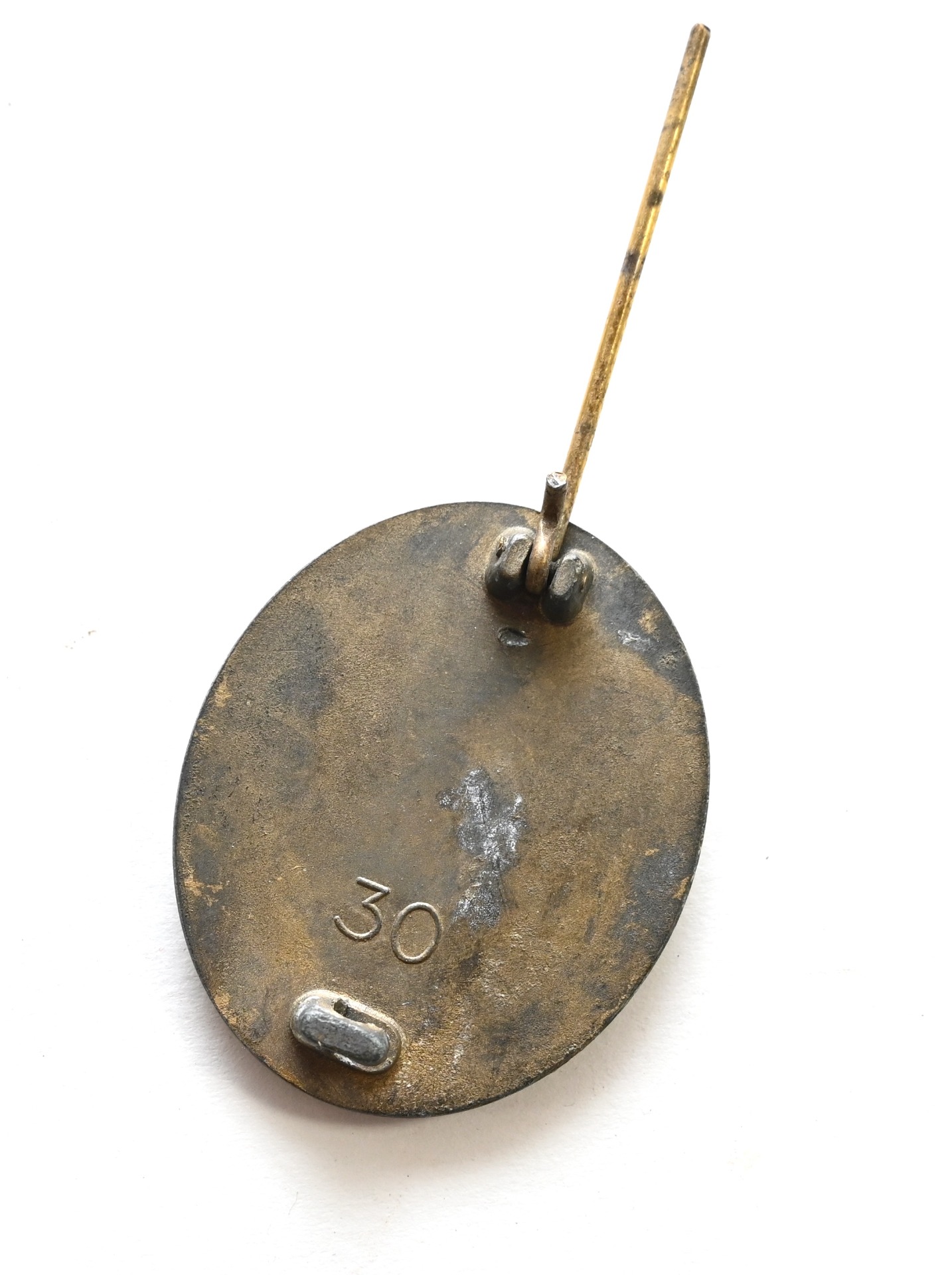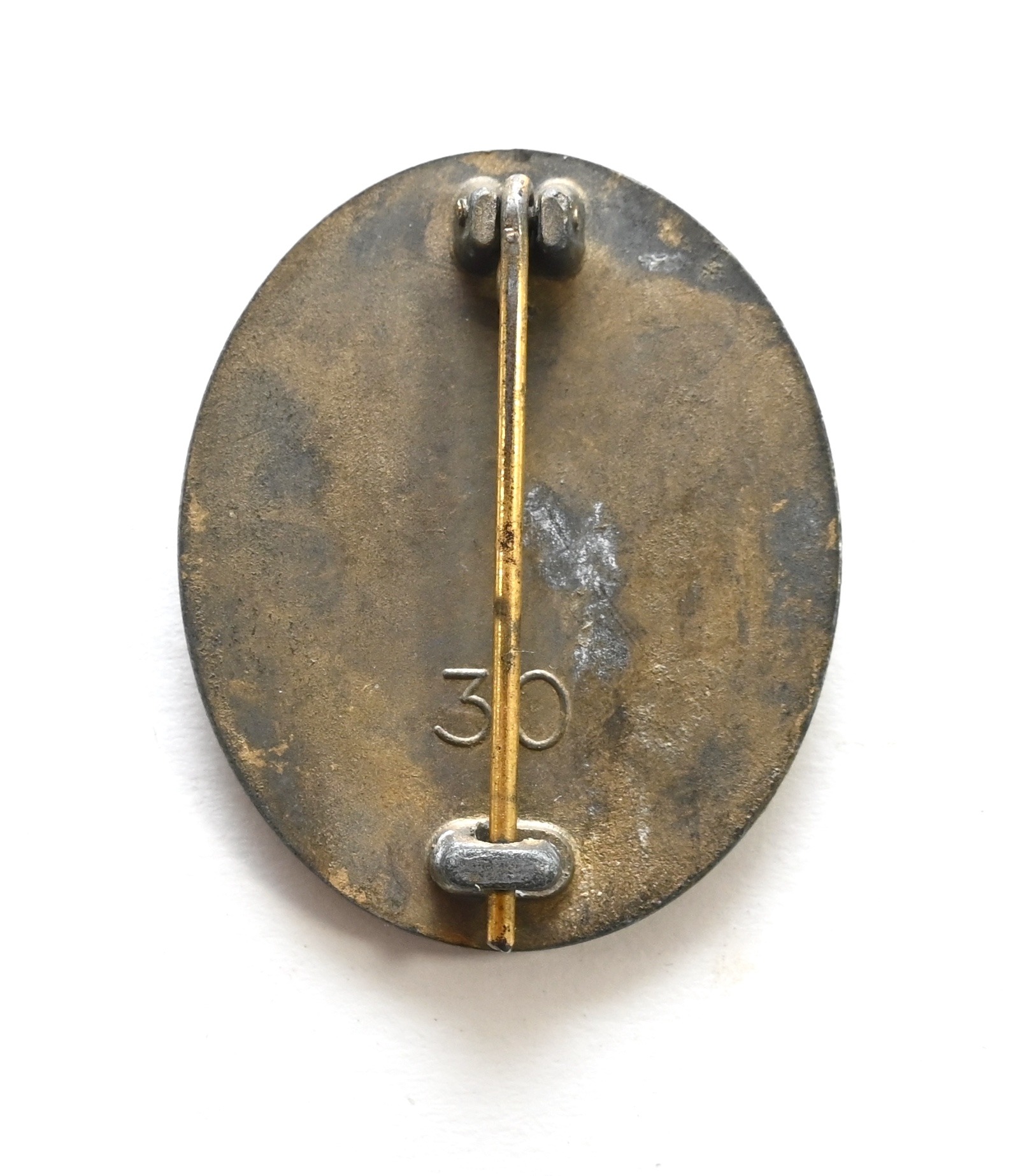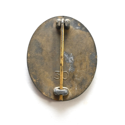 The overall condition of the wound badge is used but very good. Still contains a lot of its golden finish. The medal is marked on the back with '30' which indicates it was produced by 'Hauptmunzampt' from 'Wien'.
