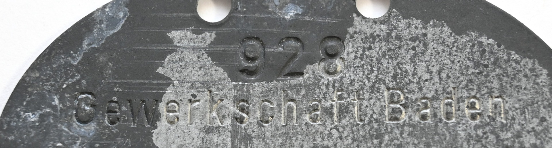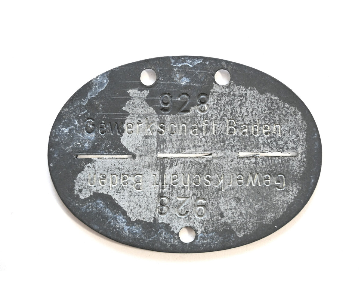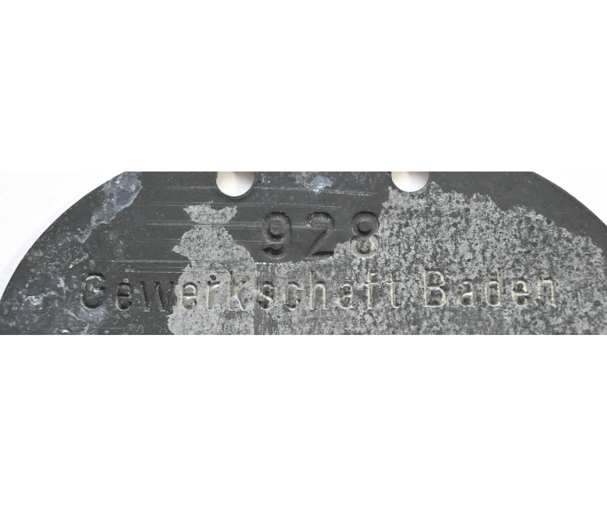 The tag or 'Erkennungsmarke' shows overall normal signs of wear. It belonged to a member/worker who works at the Baden trade union or 'Gewerkschaft Baden'. This was the potash salt mine in Buggingen which had 3 shafts, Baden, Markgraf and Heitersheim.