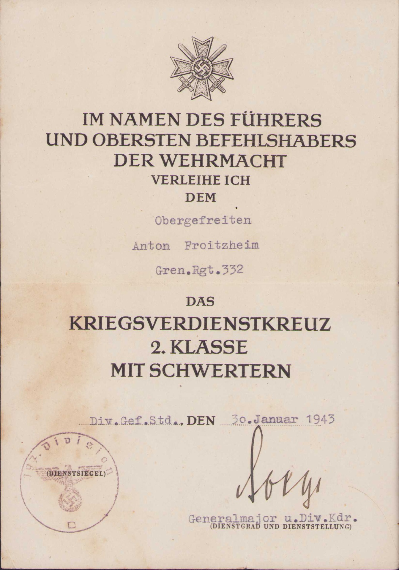 The document shows overall normal signs of wear. It's named to Obergefeiten Anton Froitzheim who served within Grenadier Regiment 332. This regiment was formed in December 1939 as Infanterie Regiment 332. It was part of the 197.Infanterie-Division.