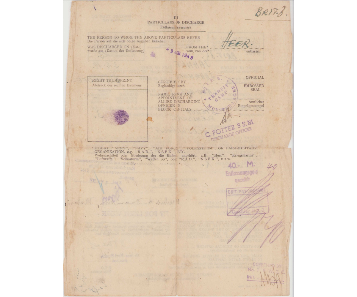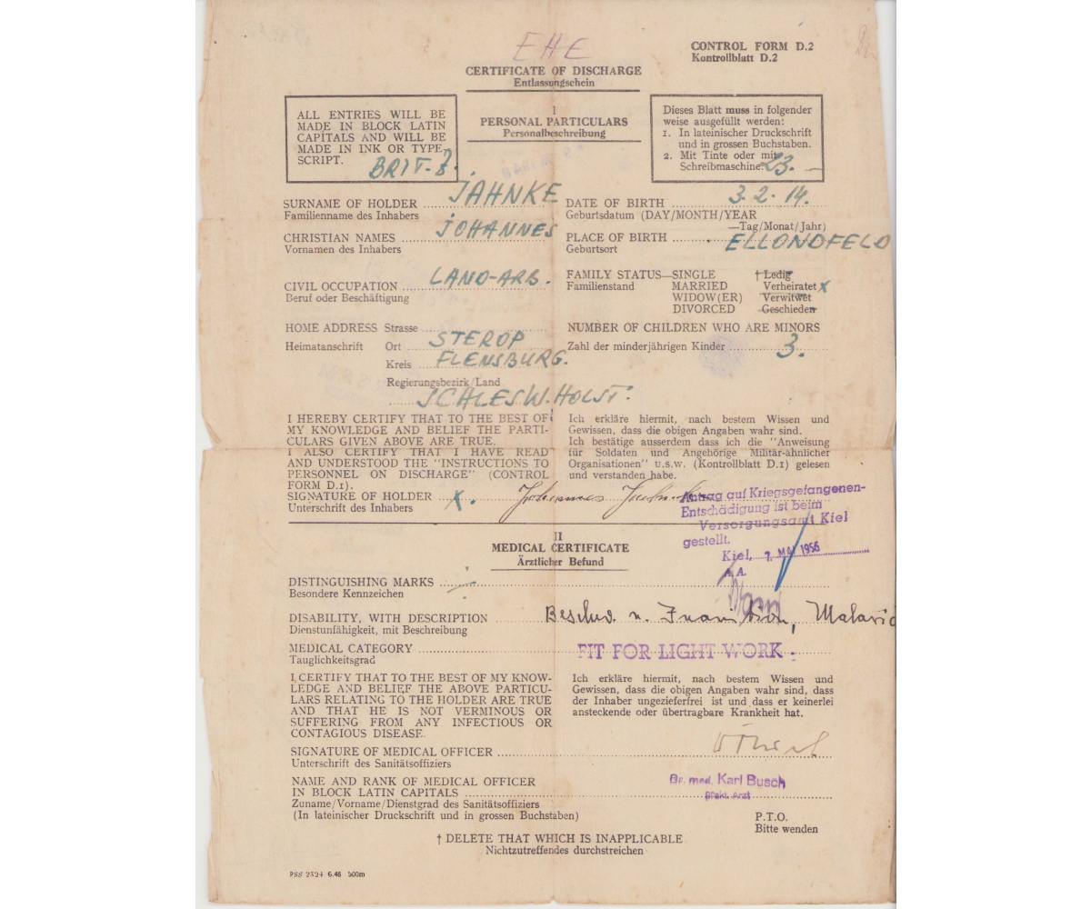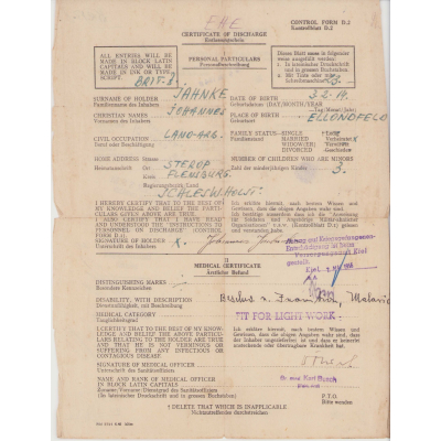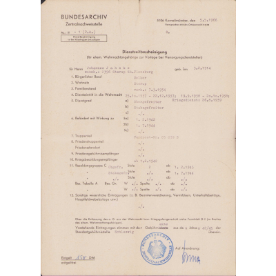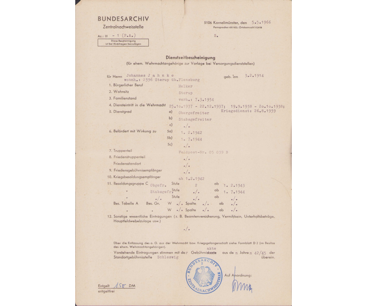 Johannes survivd the war, hence the Certificate of Discharge document. There is also a document from the Bundesarchiv called a 'length of service designation'. It shows a lot of interesting details of Johannes during his time as a soldier.
