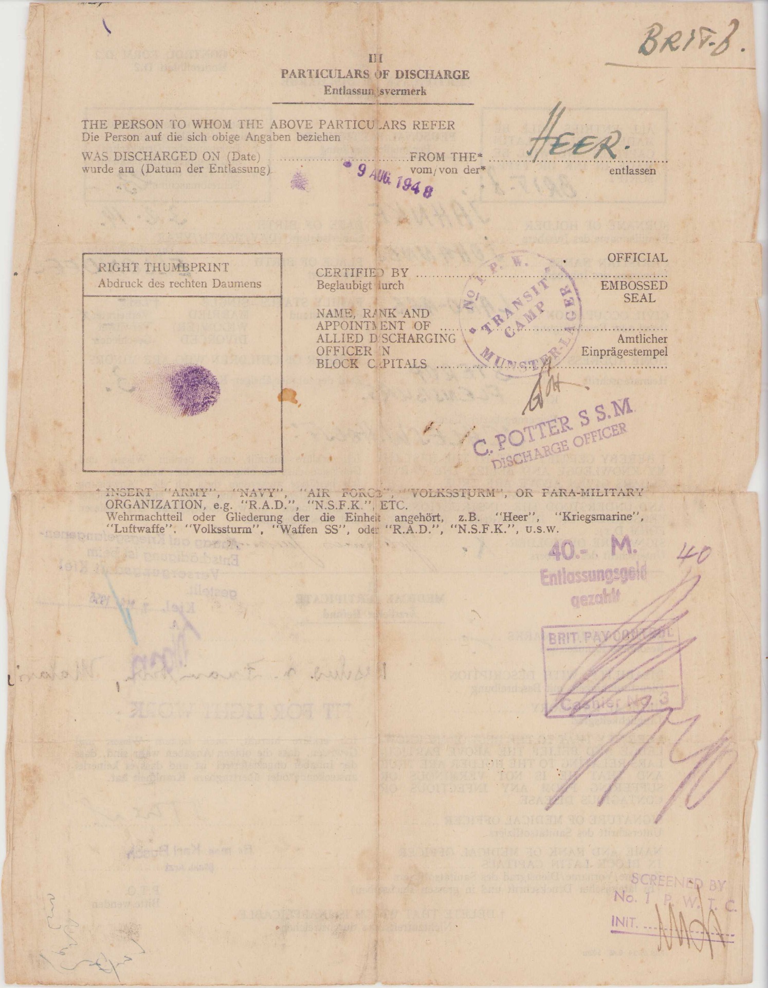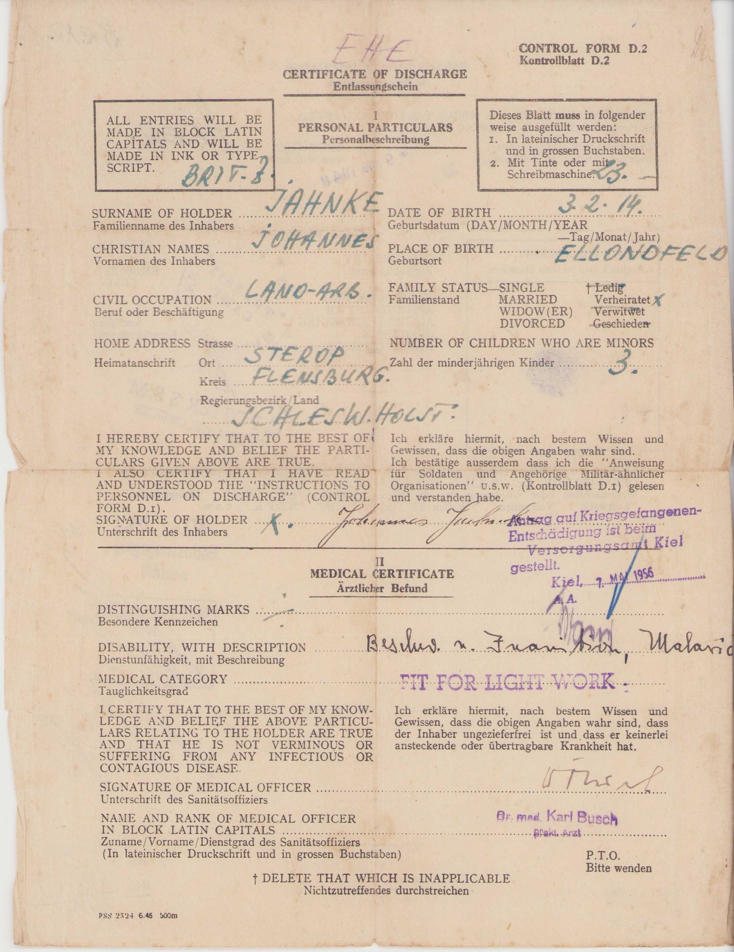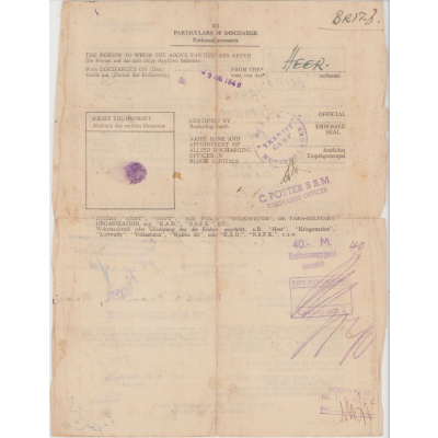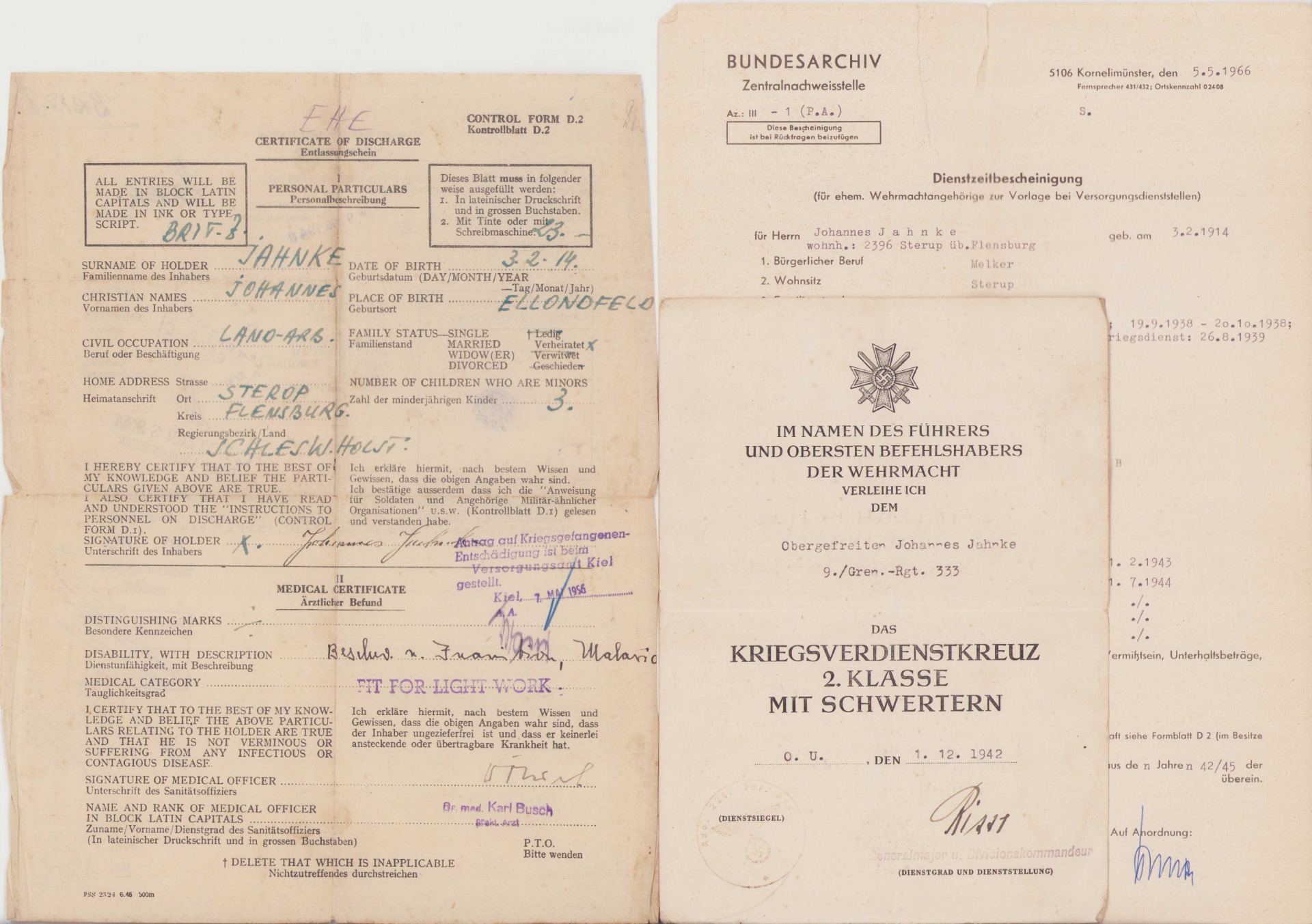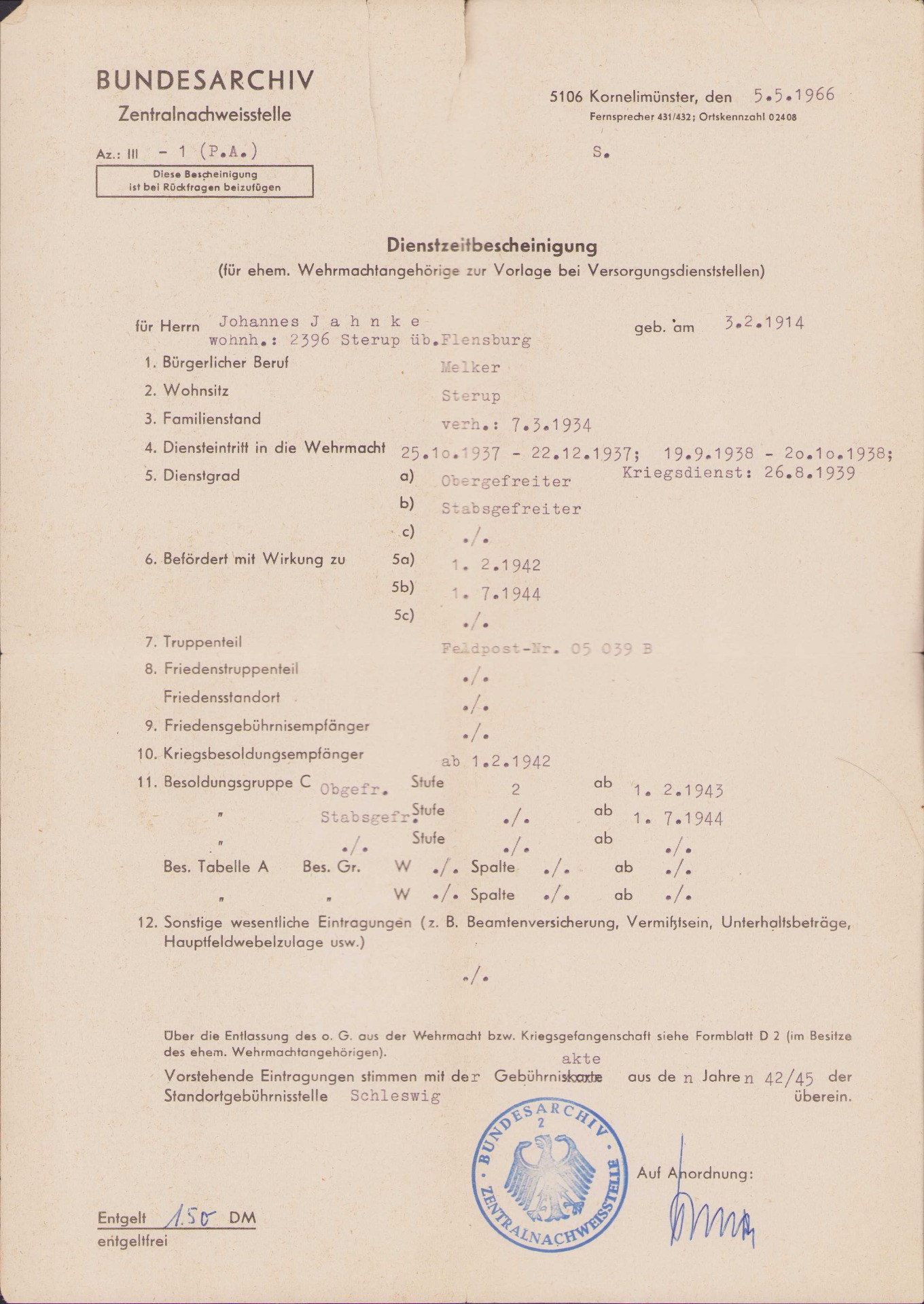 Johannes survivd the war, hence the Certificate of Discharge document. There is also a document from the Bundesarchiv called a 'length of service designation'. It shows a lot of interesting details of Johannes during his time as a soldier.