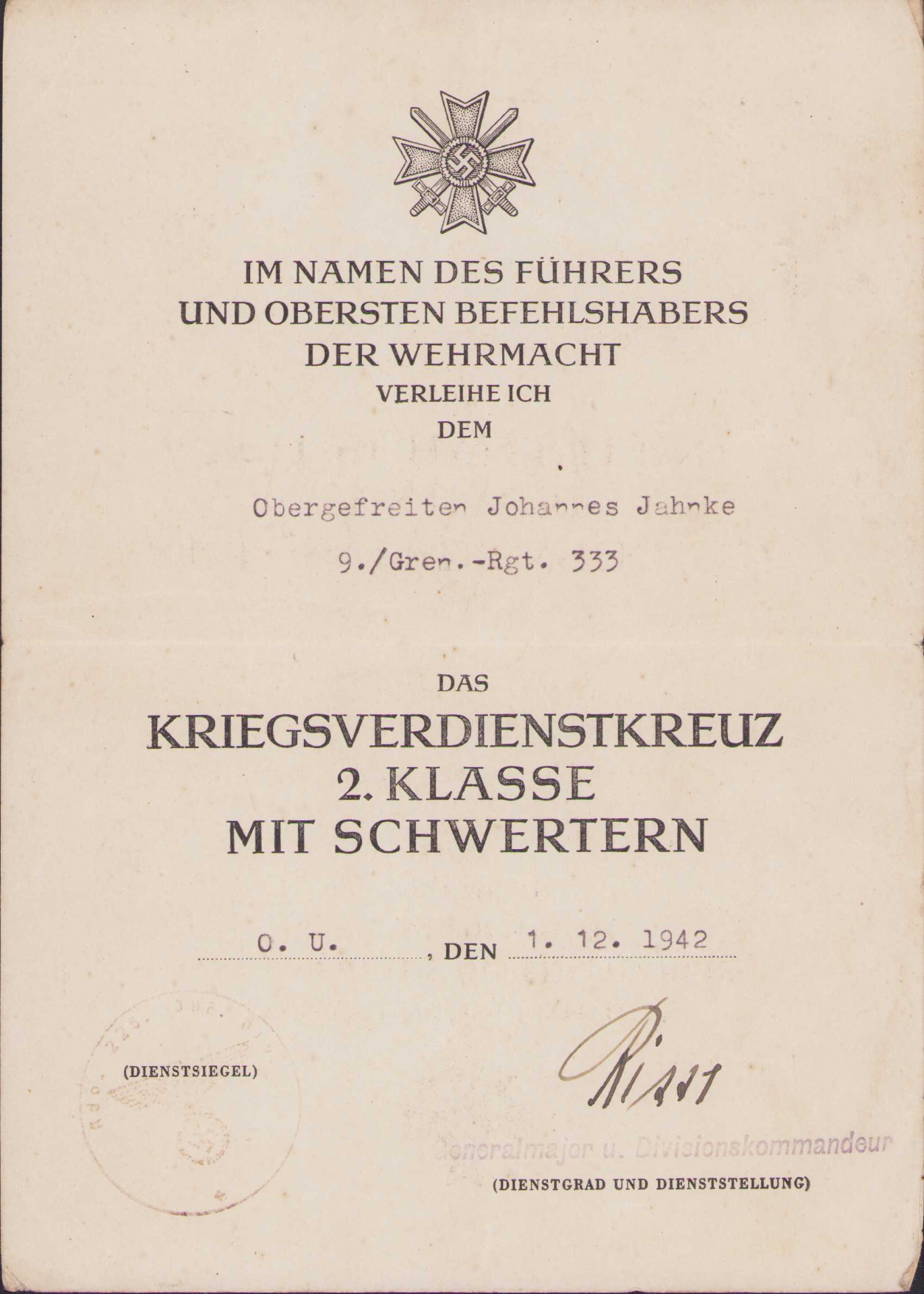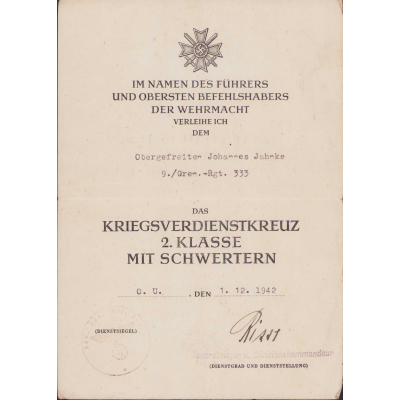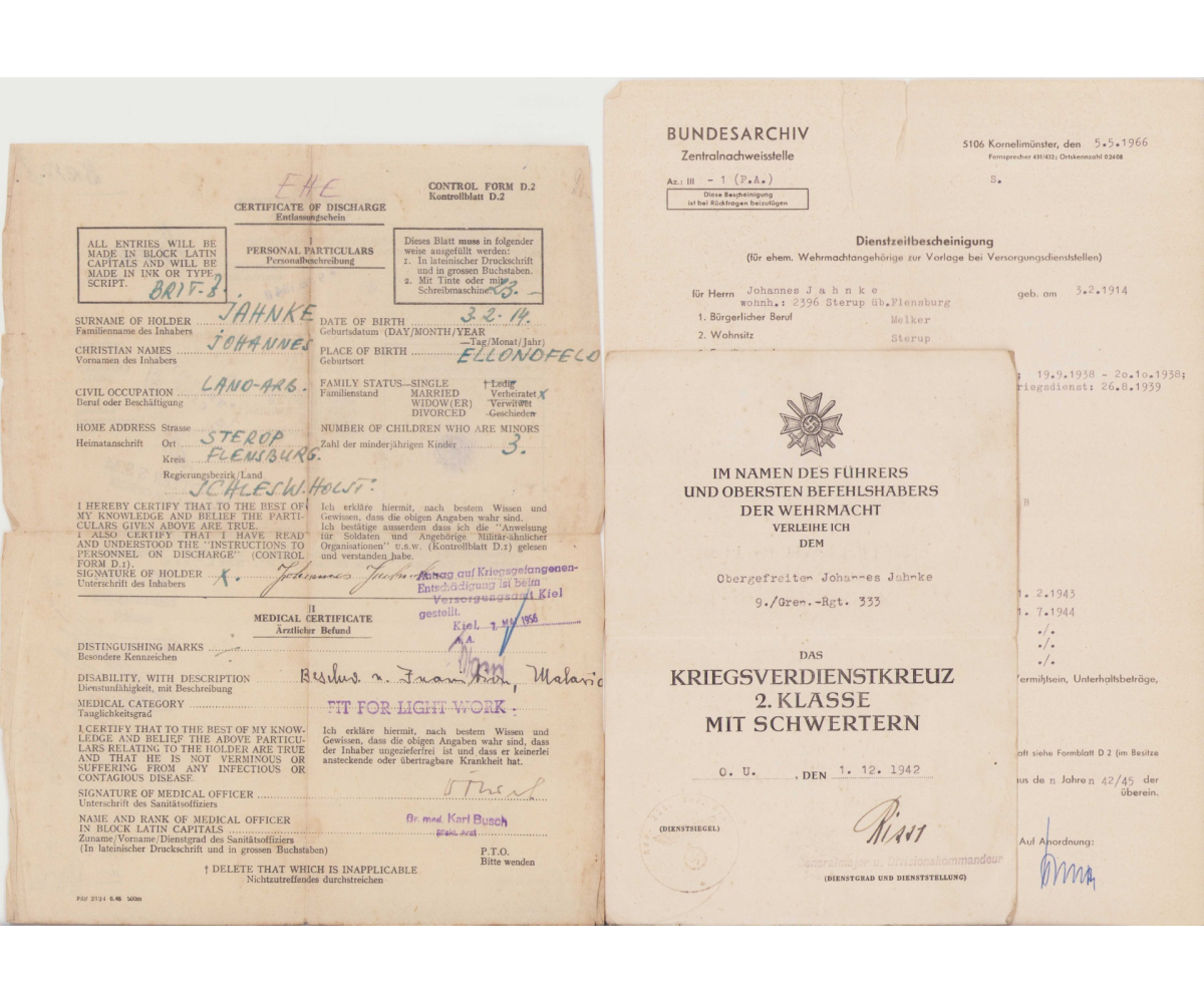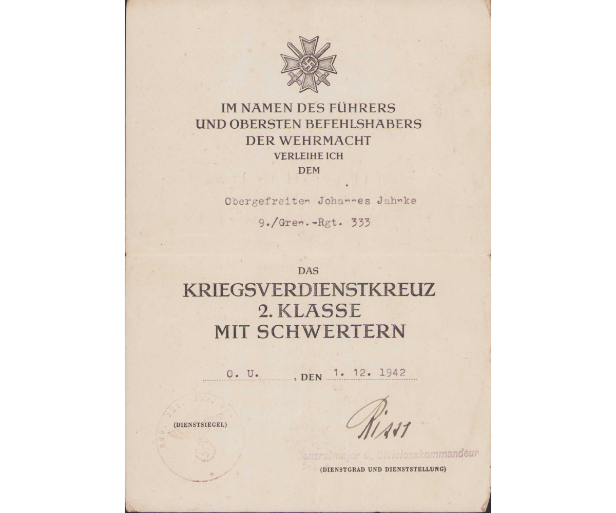 All document show overall normal signs of wear. They belonged to Obergefreiten Johannes Jahnke served in the 9.Kompanie Grenadier Regiment 333. This regiment was formed in late August 1939 as Infanterie Regiment 3333 and was part of the 225.Infanterie-Division. In October 1942 the regiment was renamed into Grenadier Regiment 333. In Russia it operated in the areas of Wolchow, Leningrad, Demjansk, Wolchow, Narwa (Estonia) and later Kurland.