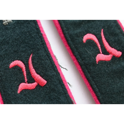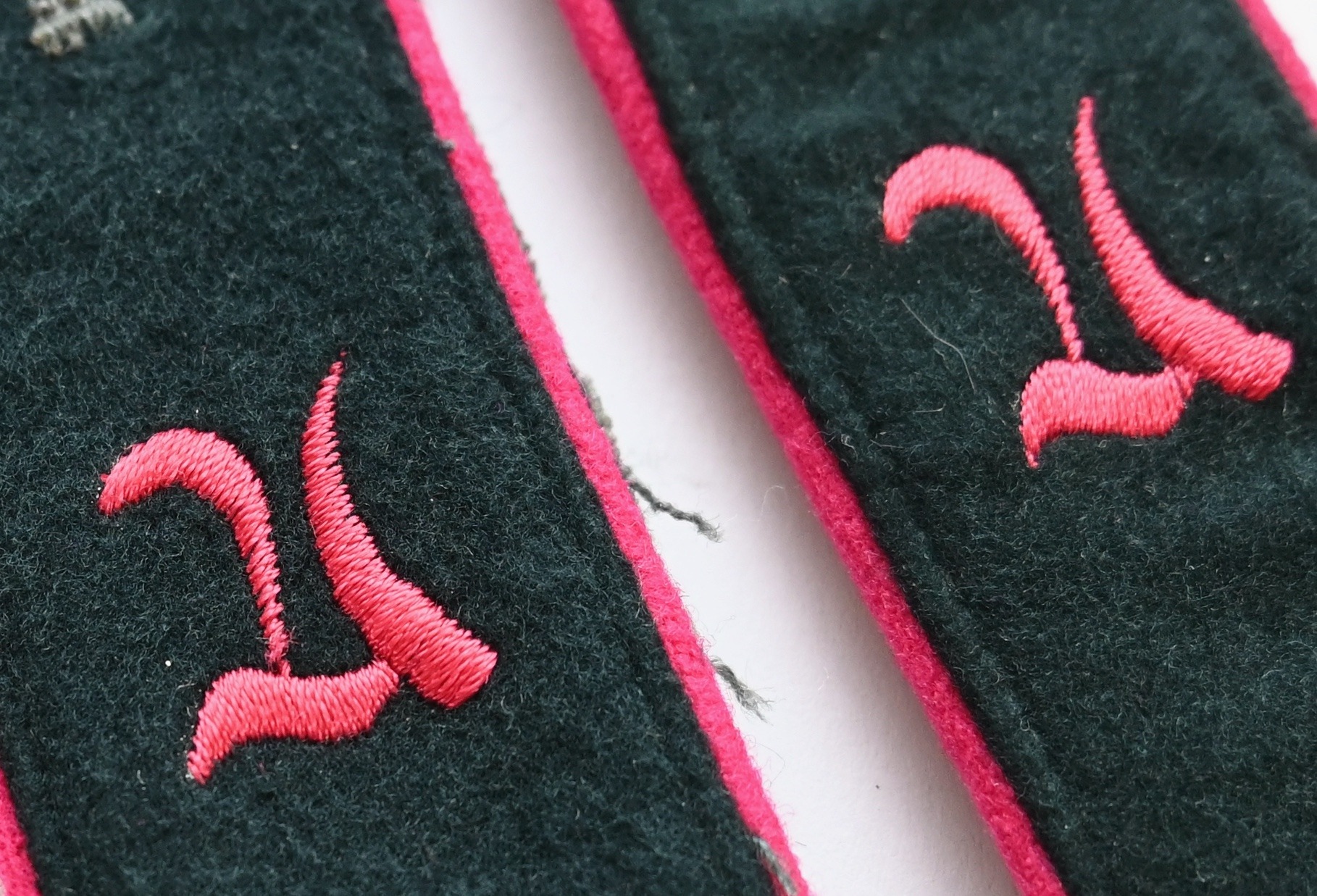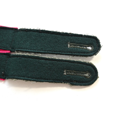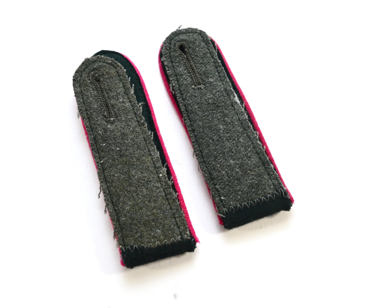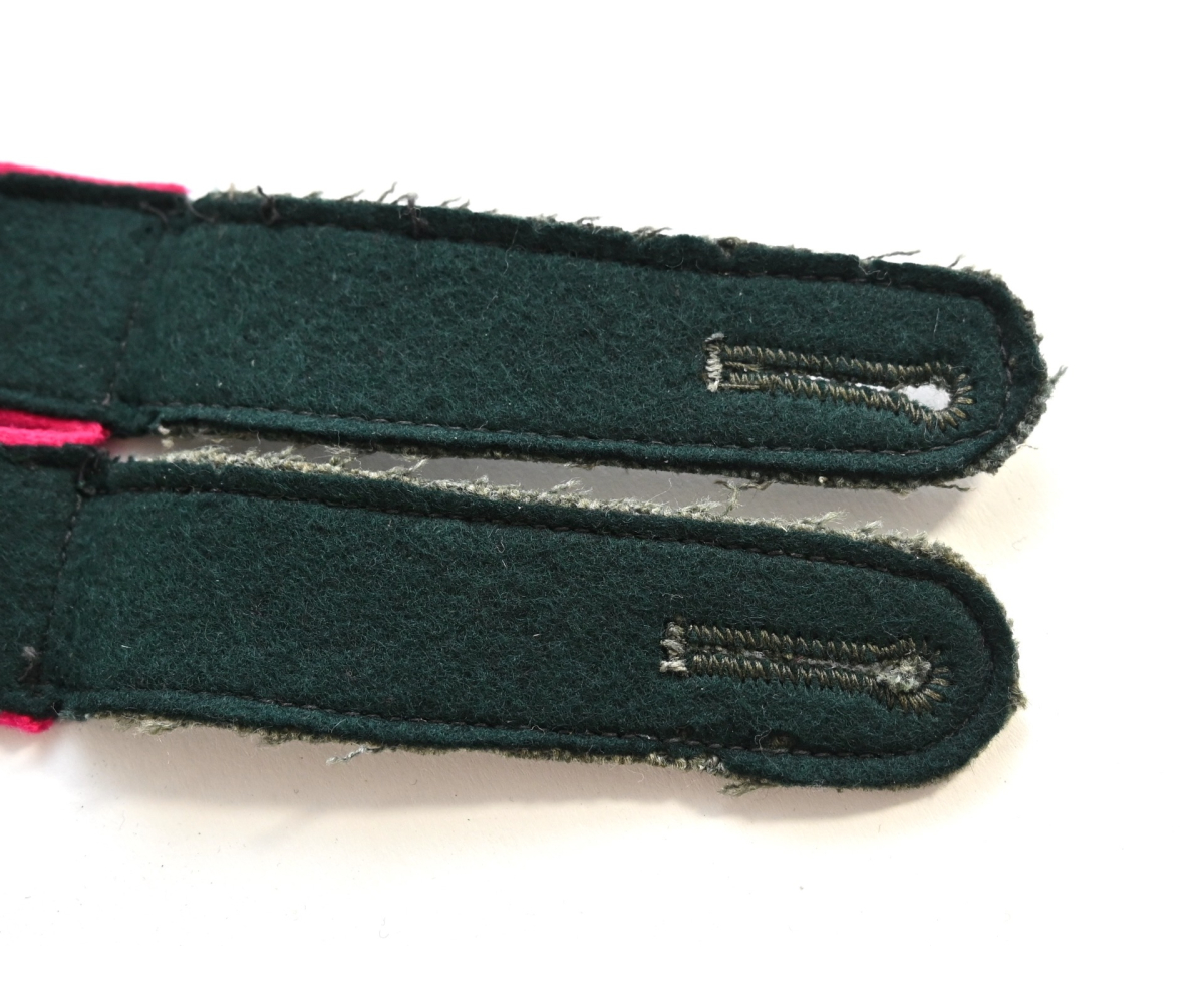 Both straps are in used but very good condition. Some very small mothing is visible but only on the back. The letter 'A' on both straps stands for 'Akademie'. The Crimson ('Karmesinrot') Branch Color (Waffenfarben) means that the straps belonged to a veterinarian. Both straps match in color and are approximately 11 cm long and 3.3 cm wide.