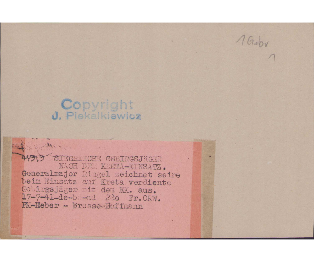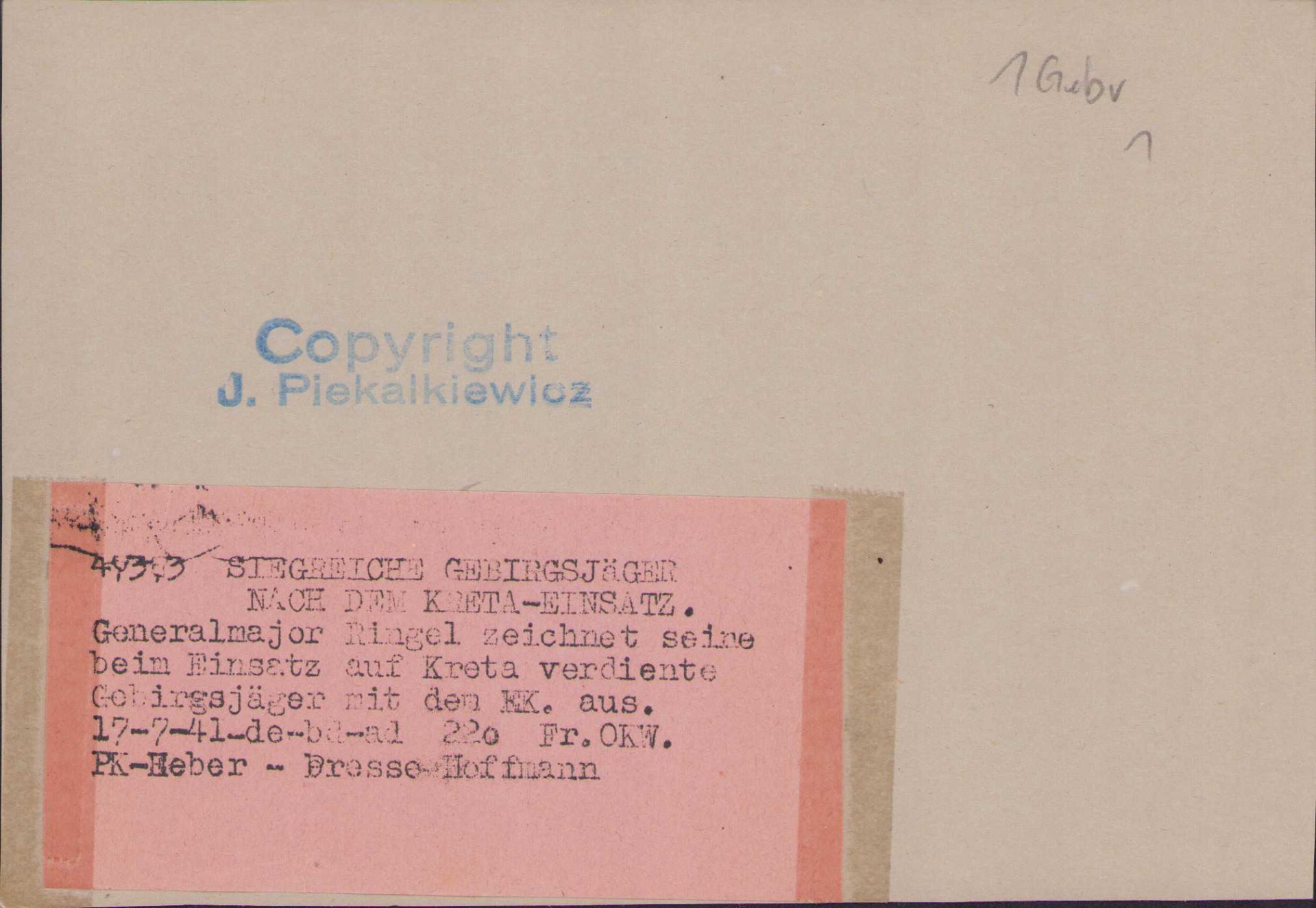 On the left we see General 'Papa' Ringel. The soldier in front of him is Oberfeldwebel Matthias Langmaier. At the moment the photo was taken Langmaier served in the 4.Kompanie Gebirgsjäger Regiment 85. He already earned the Eisernes Kreuz 2.Klasse, Verwundetenabzeichen and the Heeresbergführerabzeichen. An medal that was only awarded 380 times making it much rarer then a Ritterkreuz or Nahkampfspange in gold.