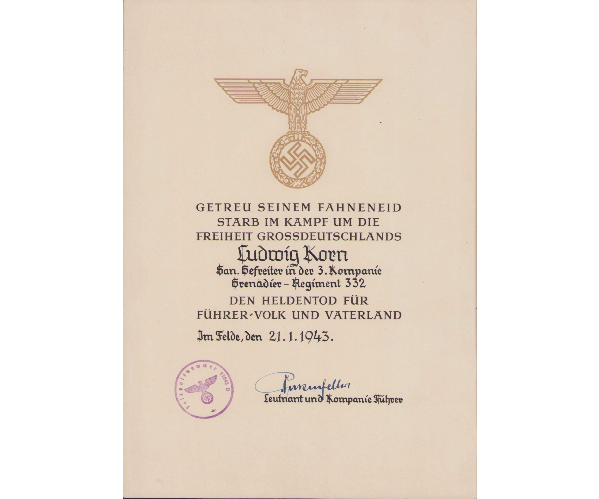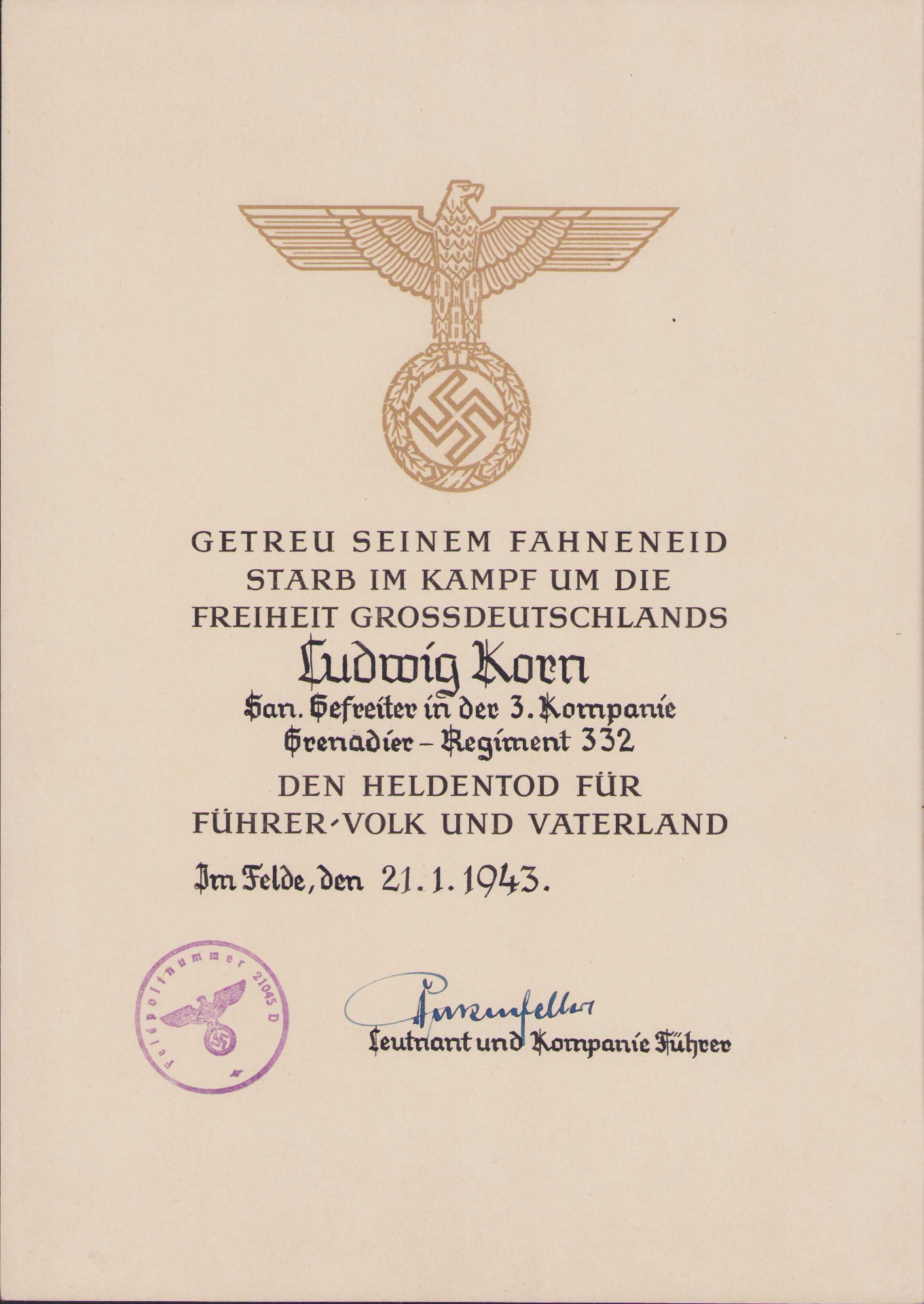 The commemorative document shows overall normal signs of wear. Sanitäts Gefreiter Ludwig Korn served in the 3.Kompanie Grenadier Regiment 332. This regiment was formed in December 1939 as Infanterie Regiment 332. It was part of the 197.Infanterie-Division.