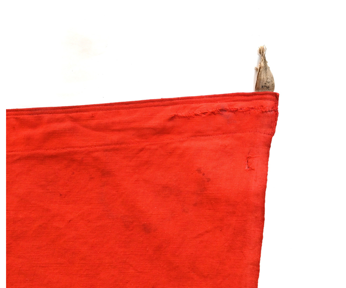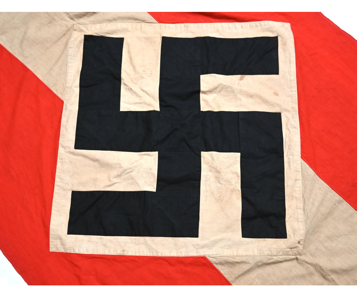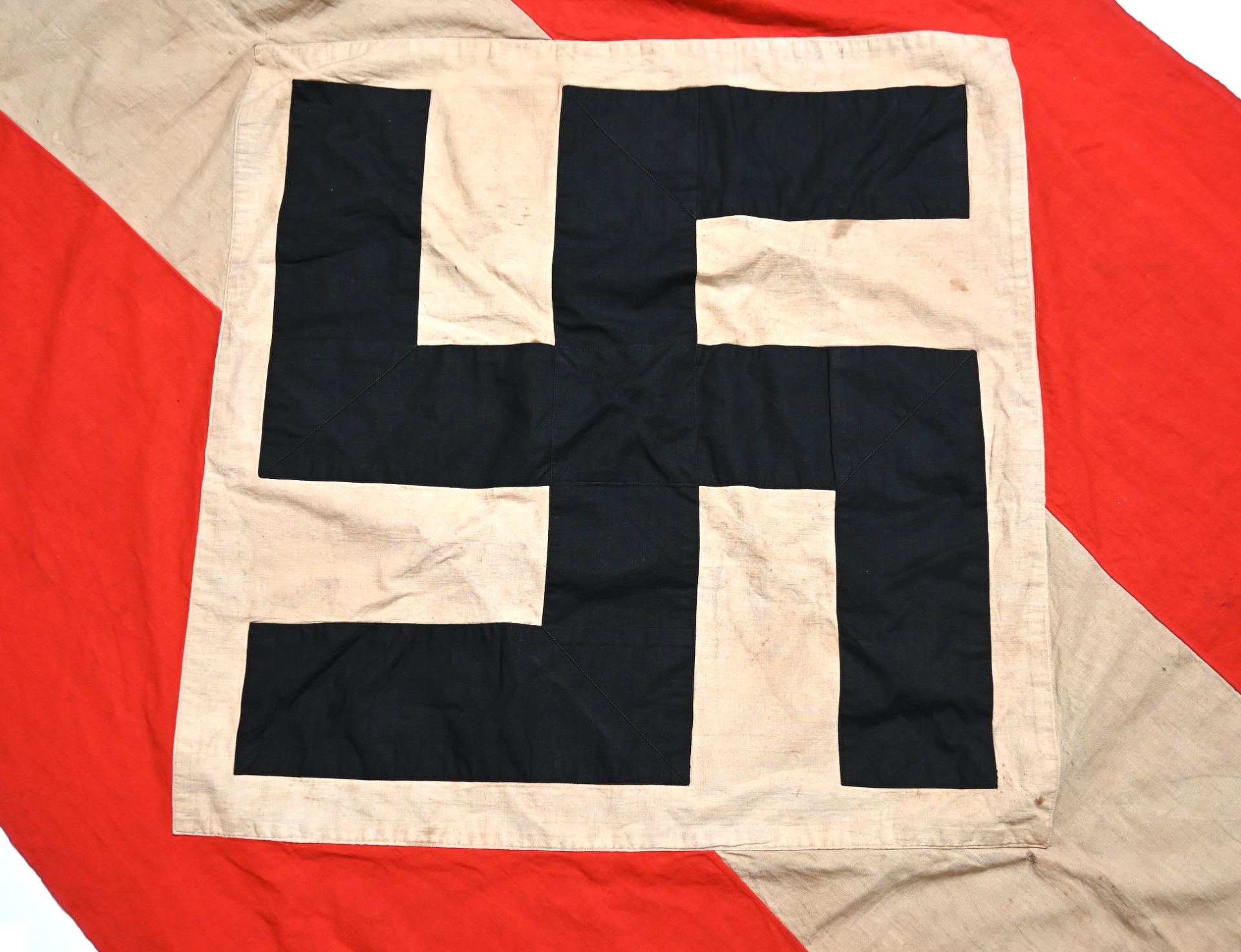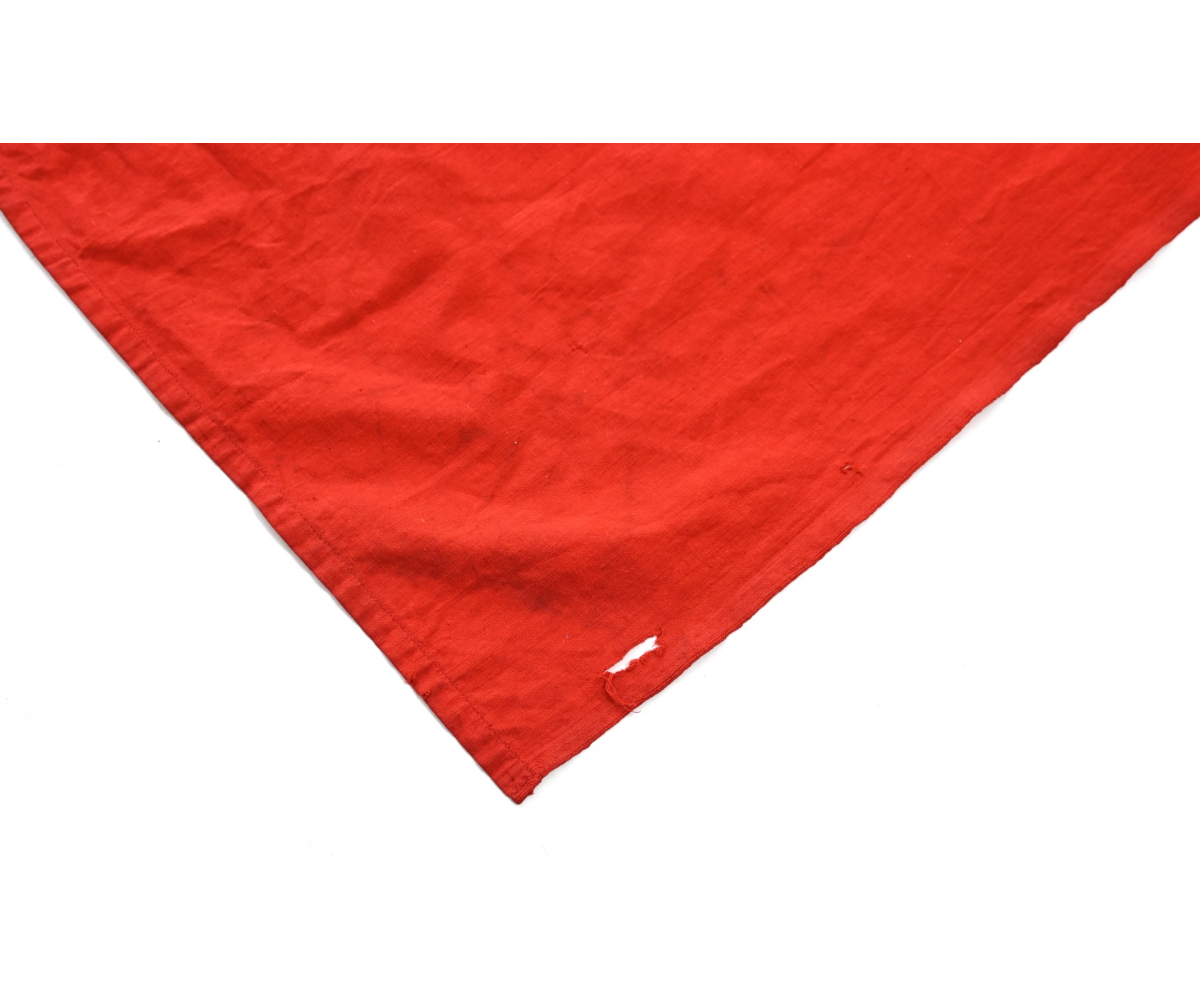 The banner shows overall normal signs of wear. The patina is lovely! It's a double sized piece. On 2 corners of the banner remnants of straps/strings are still present which where used to hang it on a podium or wall or such. The size of the flag is approx. 165cm x 115cm. Nice, not so easy to find flag and a decorative piece for in your collection room.