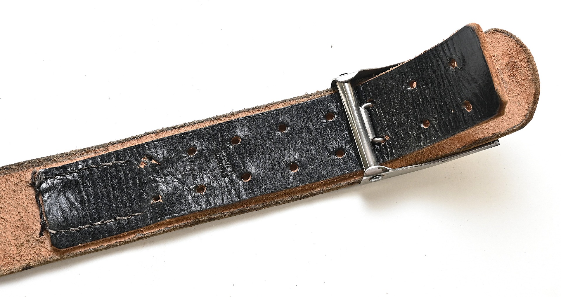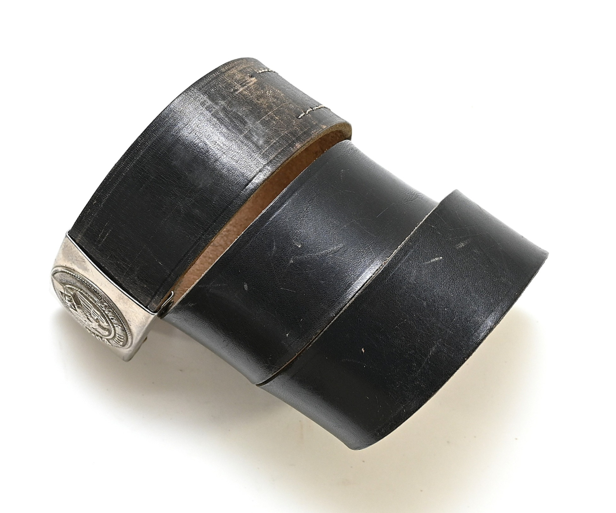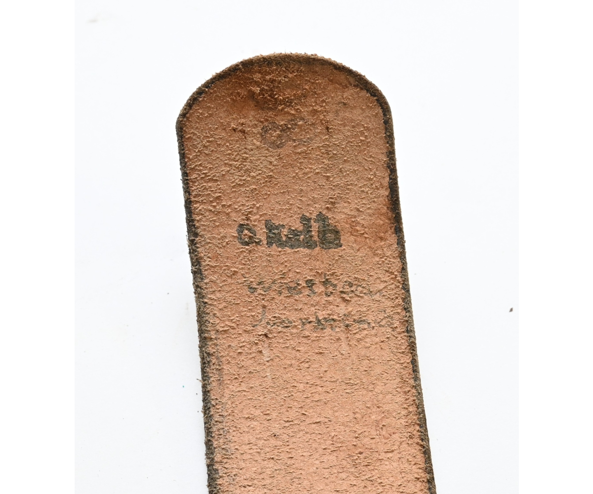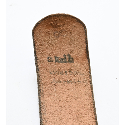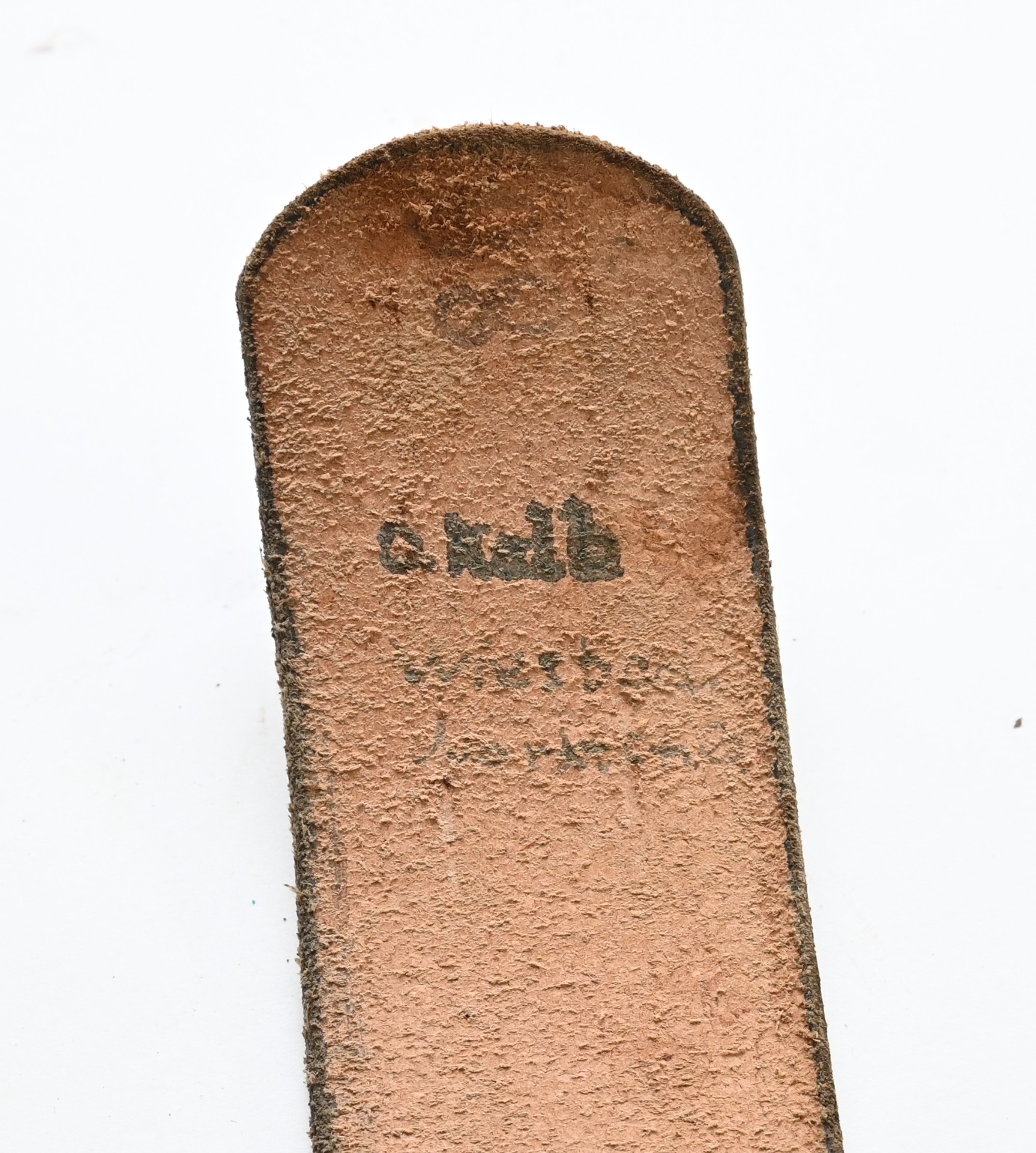 The set shows overall normal signs of wear. The leather belt is supple and solid. It has a length of approx 90cms and is marked 'Croupon L2/2359'. The buckle is a steel/silver plated variant and is nicely marked 'RZM M4/28' which indicates it was produced by Paulmann & Crone from Lüdenscheid.