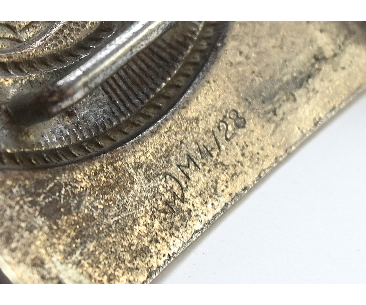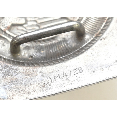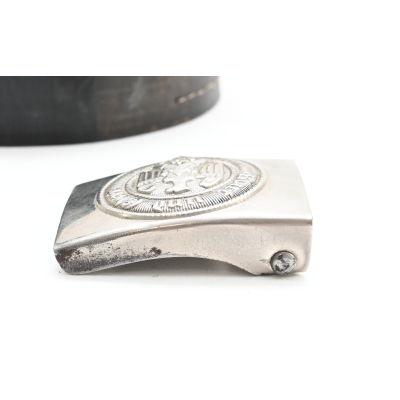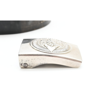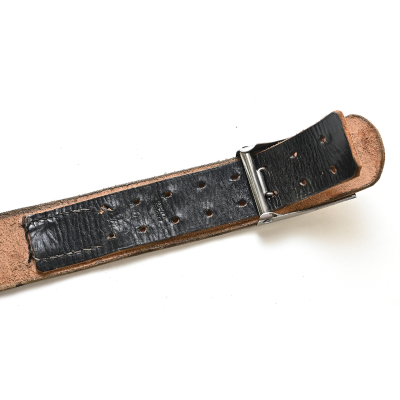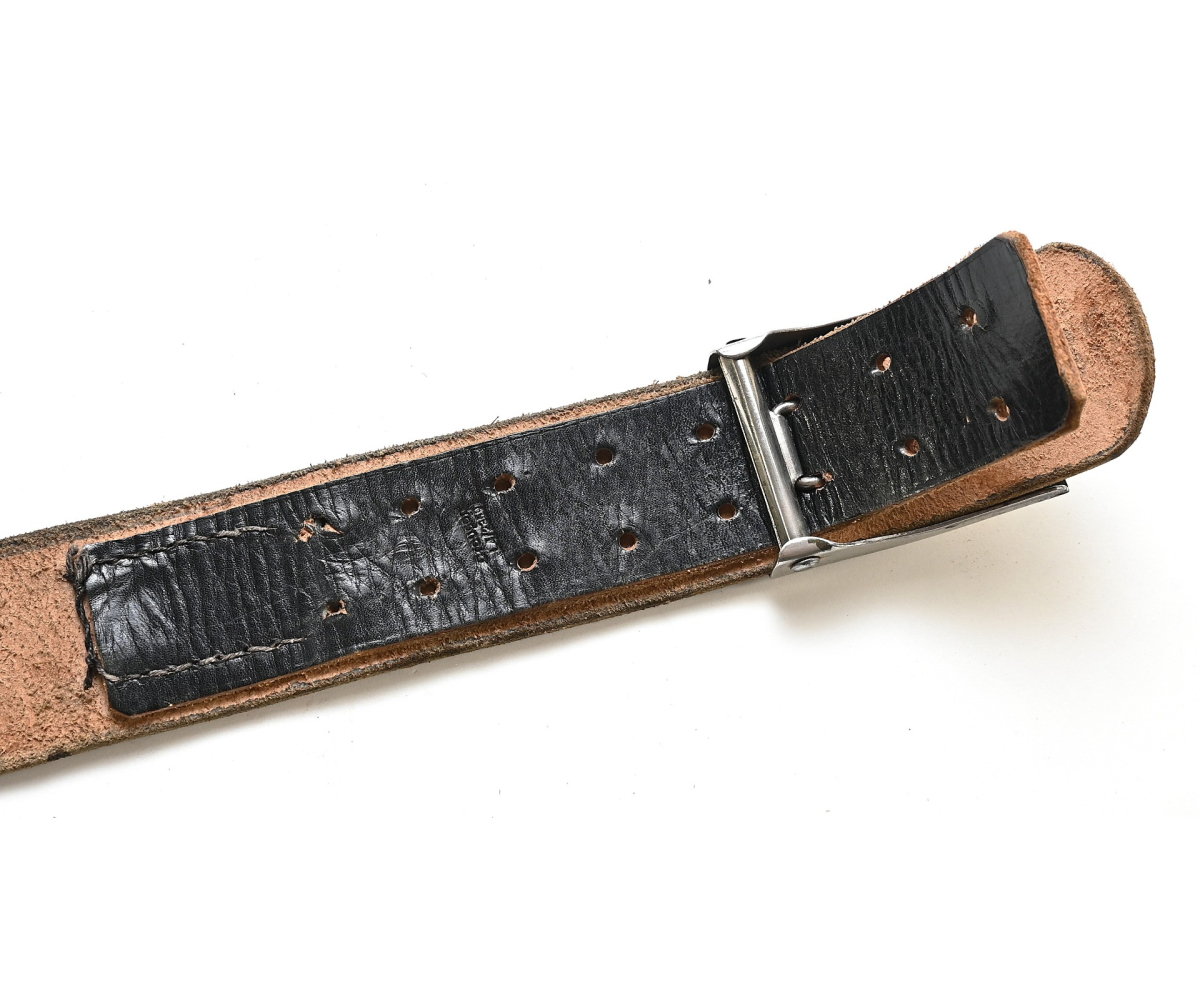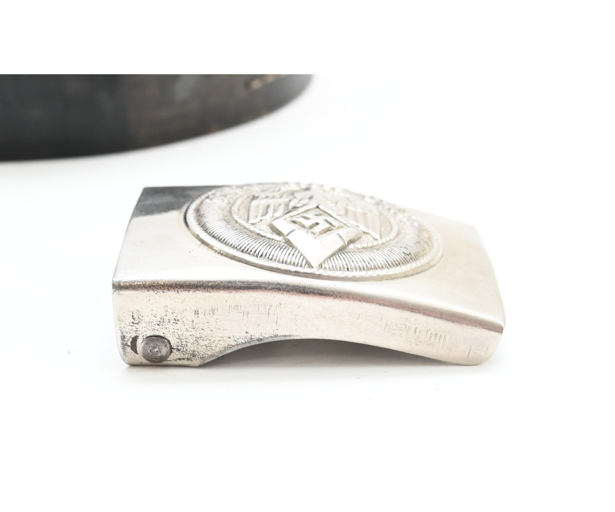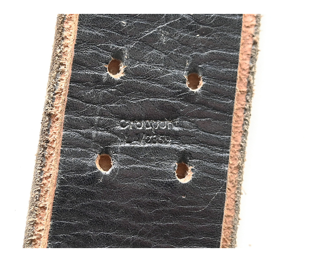 The set shows overall normal signs of wear. The leather belt is supple and solid. It has a length of approx 90cms and is marked 'Croupon L2/2359'. The buckle is a steel/silver plated variant and is nicely marked 'RZM M4/28' which indicates it was produced by Paulmann & Crone from Lüdenscheid.