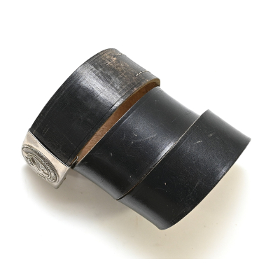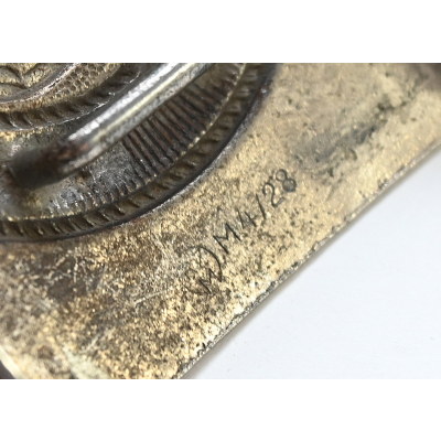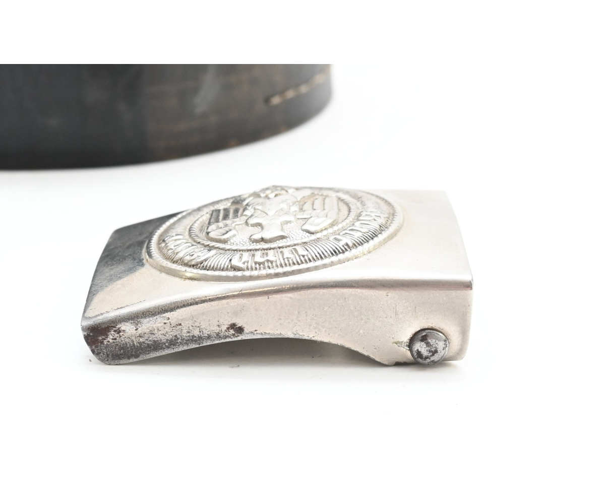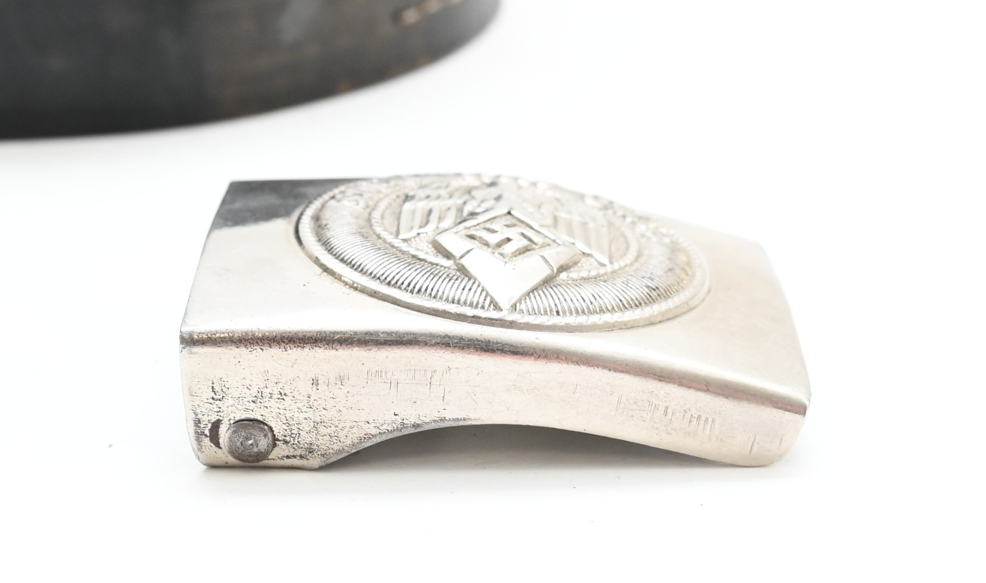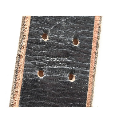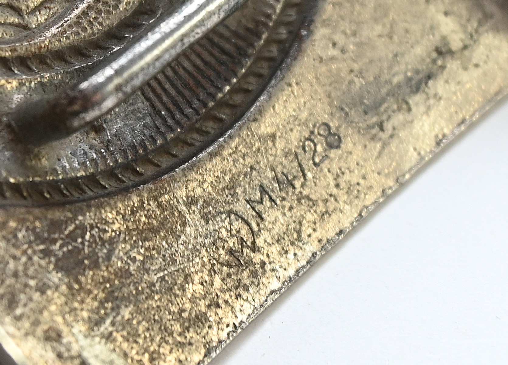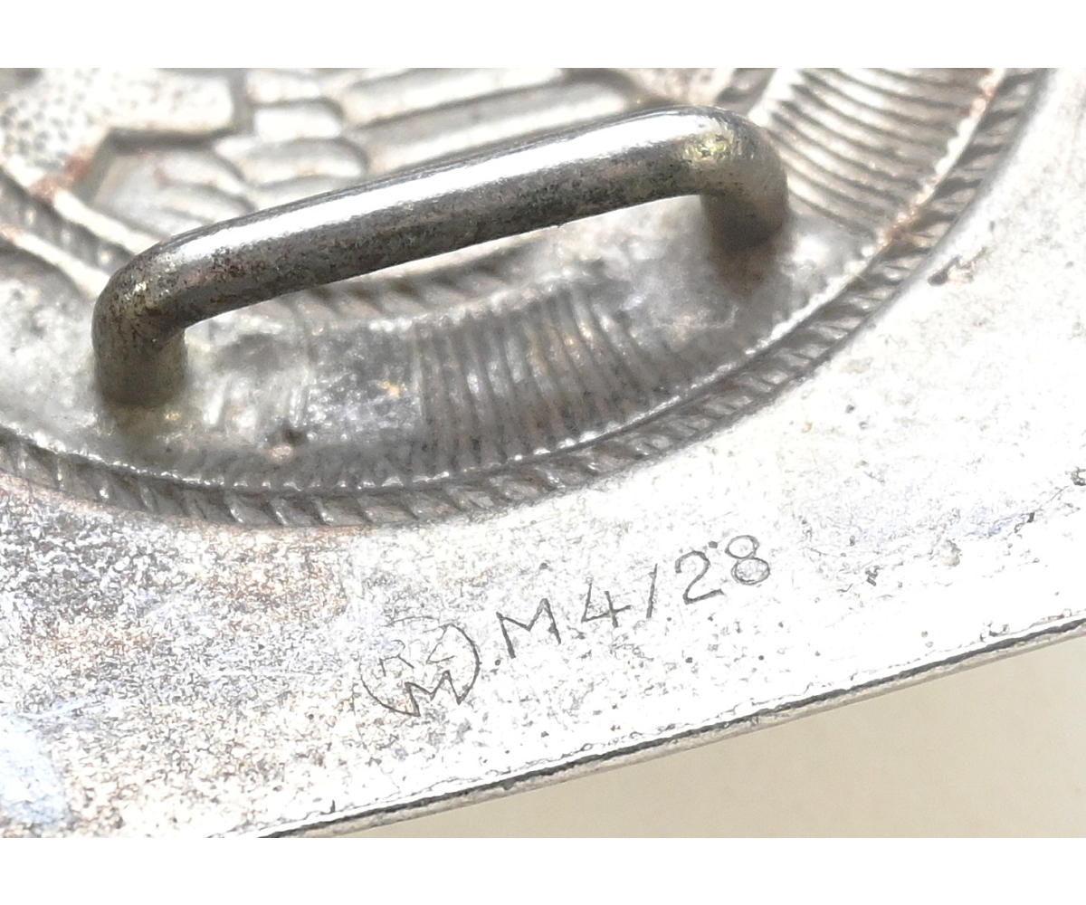 The set shows overall normal signs of wear. The leather belt is supple and solid. It has a length of approx 90cms and is marked 'Croupon L2/2359'. The buckle is a steel/silver plated variant and is nicely marked 'RZM M4/28' which indicates it was produced by Paulmann & Crone from Lüdenscheid.