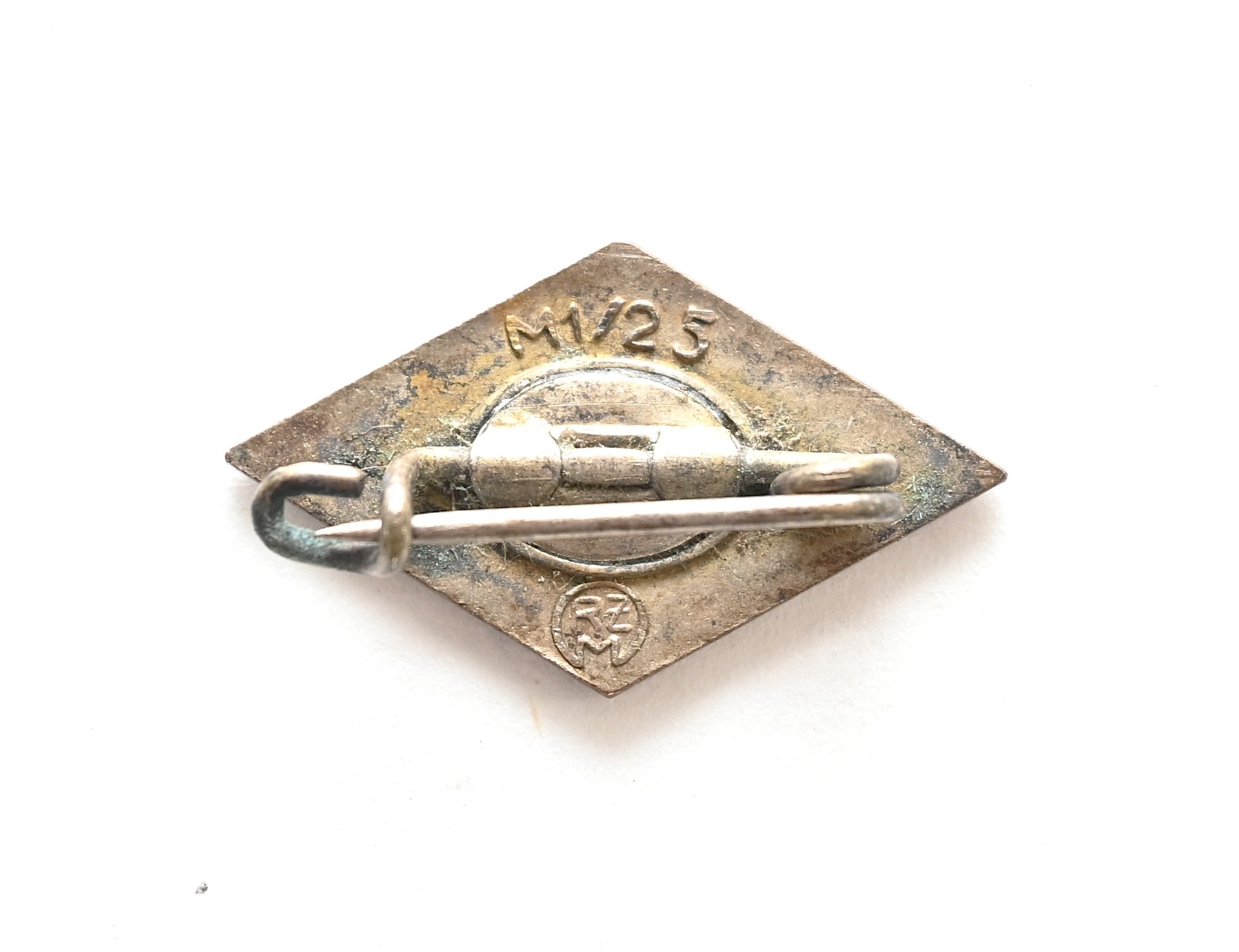 The pin shows overall normal signs of wear. Complete with pin on the back. 'RZM' and 'M1/25' marked which means it was produced by 'Rudolf Reiling' from 'Pforzheim'.