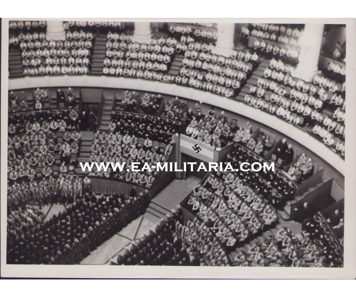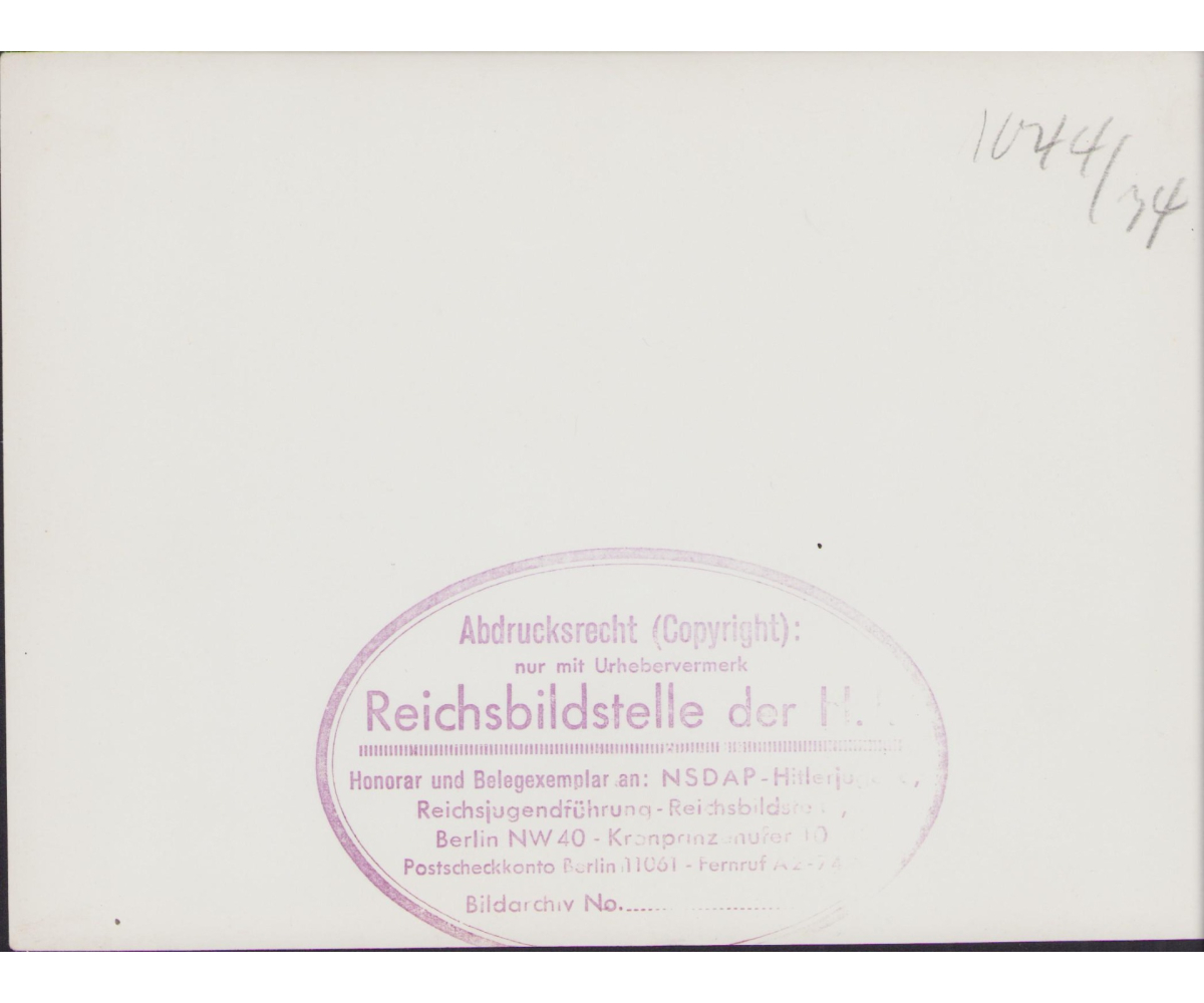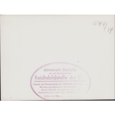 The photograph shows overall normal signs of storage wear. Taken during a rally/speech. Nicely marked with an 'Reichsbildstelle der H.J.' inkstamp.