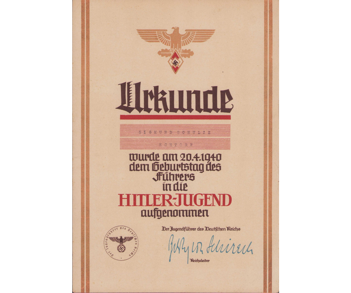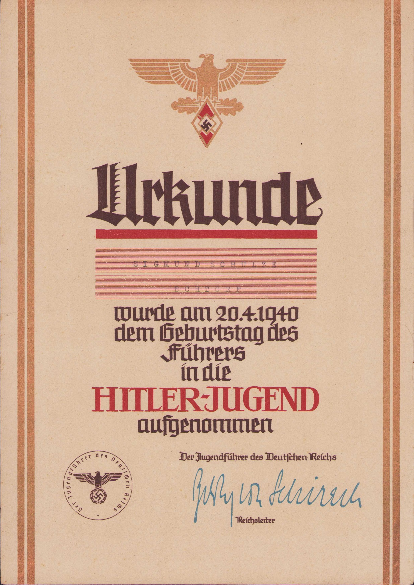 The document shows overall minor signs of wear. It was issued to Sigmund Schulze from Echtorf. The document says that Sigmund was accepted to join the Hitler-Jugend.