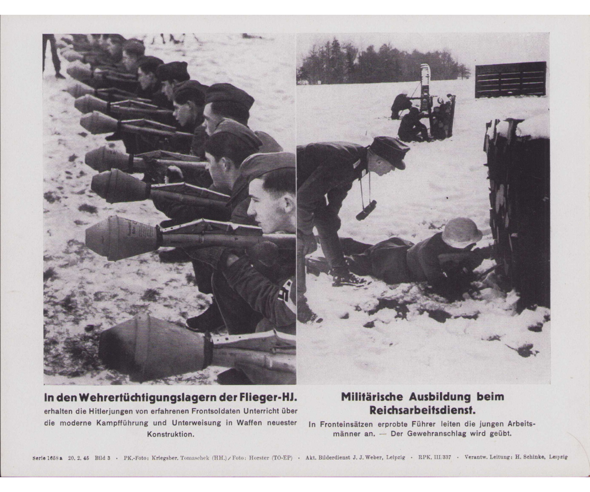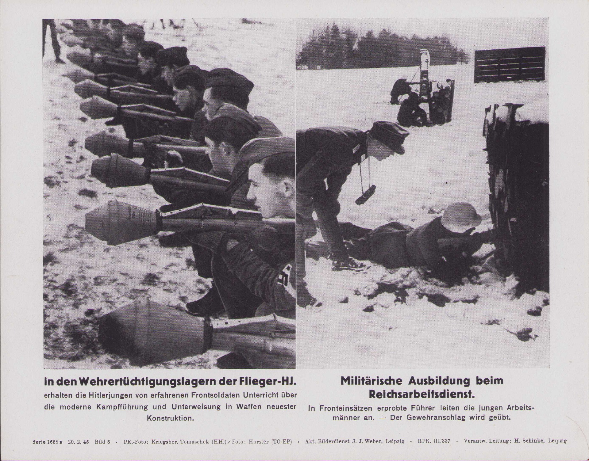 The photo shows overall normal signs of storage wear. It shows a group of HJ-Flieger boy laying next to eachother each holding a Panzerfaust. The right photo shows Reichsarbeits men getting combat training. Note the snow camouflaged helmet of the RAD man.
