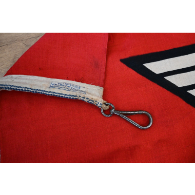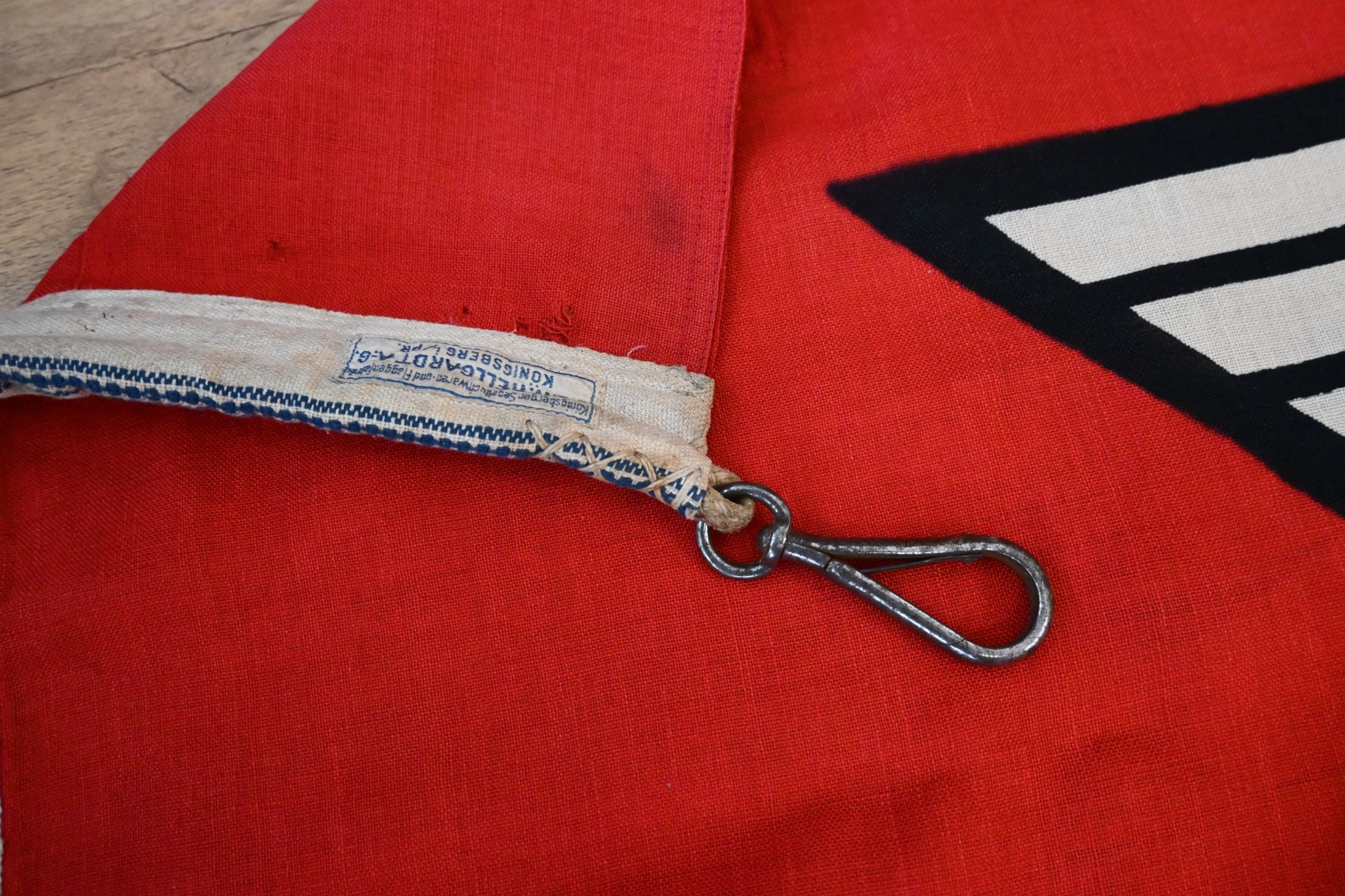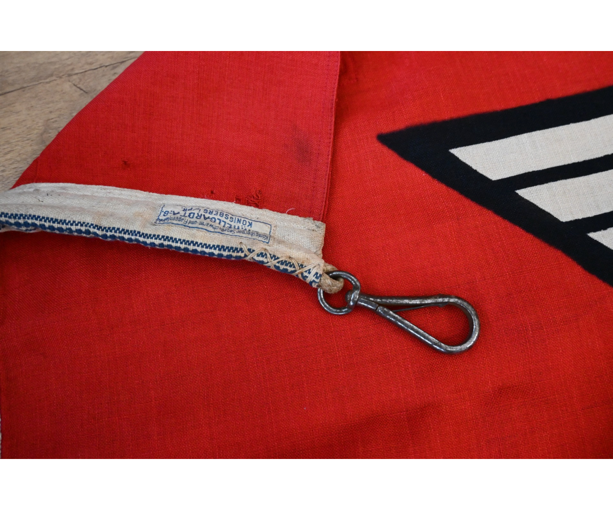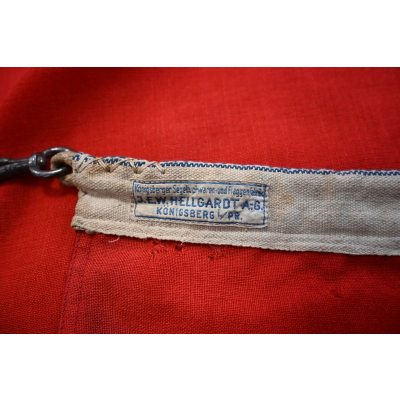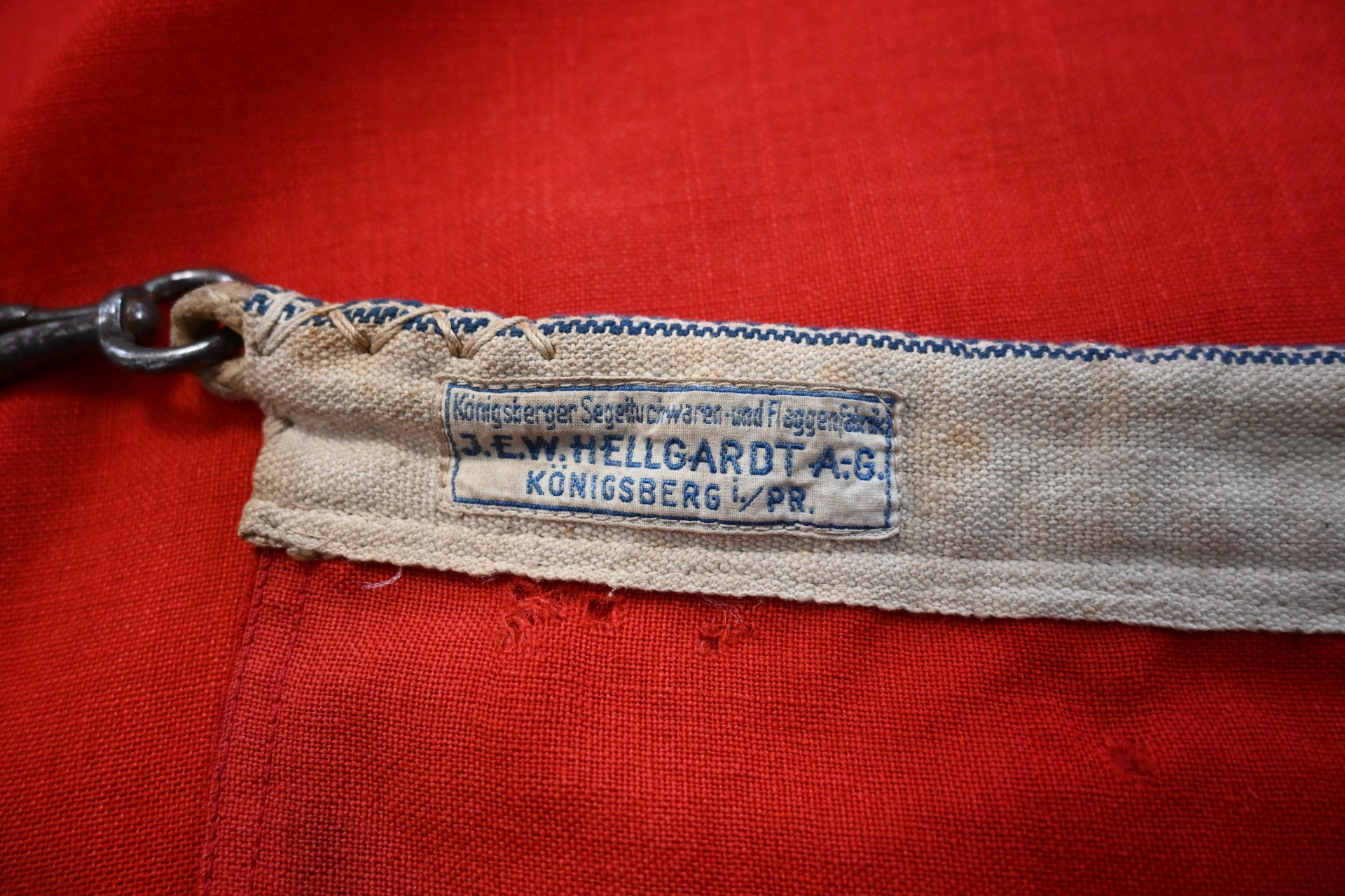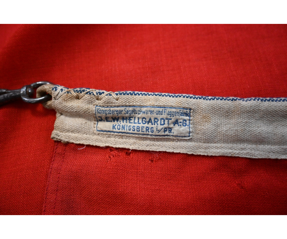 The overall condition is good. It has very nice used patina, only a couple of tiny holes. Its complete with carbine hooks and nicely labeled by the maker: 'Königsberger Segelkickwaren-und flaggenfabrik, J.E.W. Hellgardt A.-G.' from 'Köningsberg i./pr.'