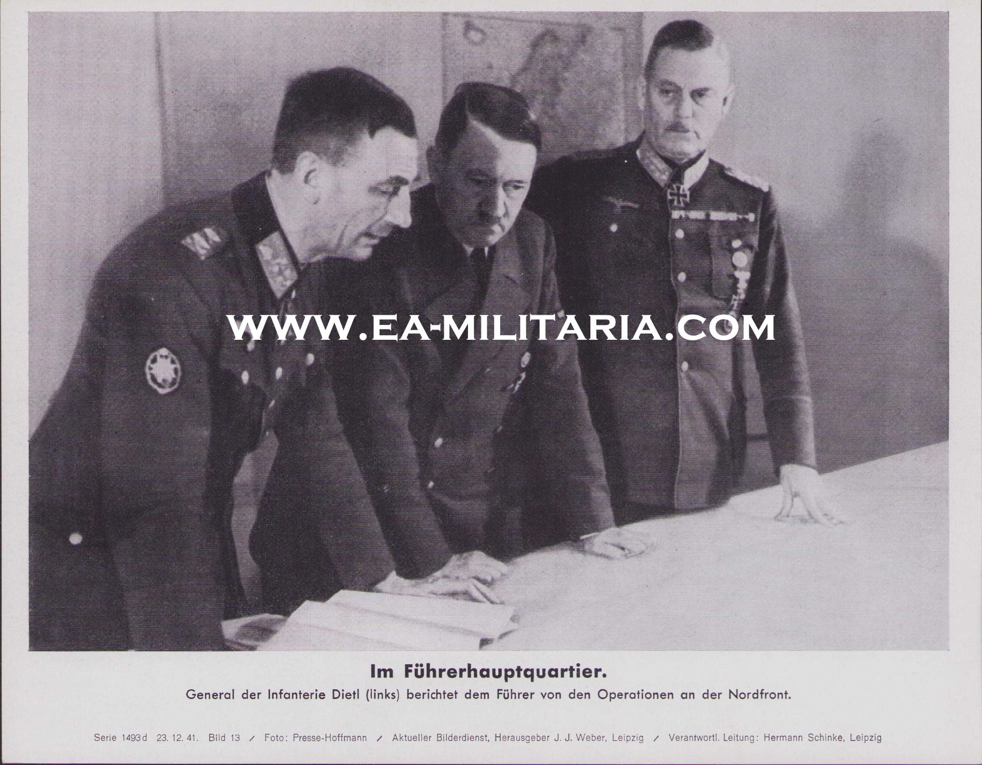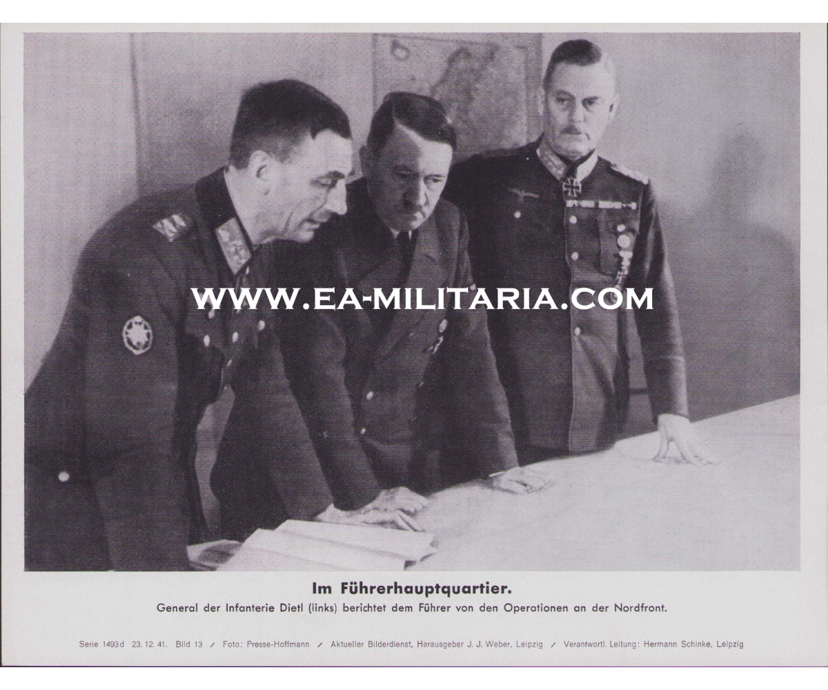 The photo shows overall normal signs of storage wear. Here General der Gebirgstruppe Dietl is giving a situation report to Hitler about the Nordfront campaign. Hitler is accompanied by Wilhelm Keitel.