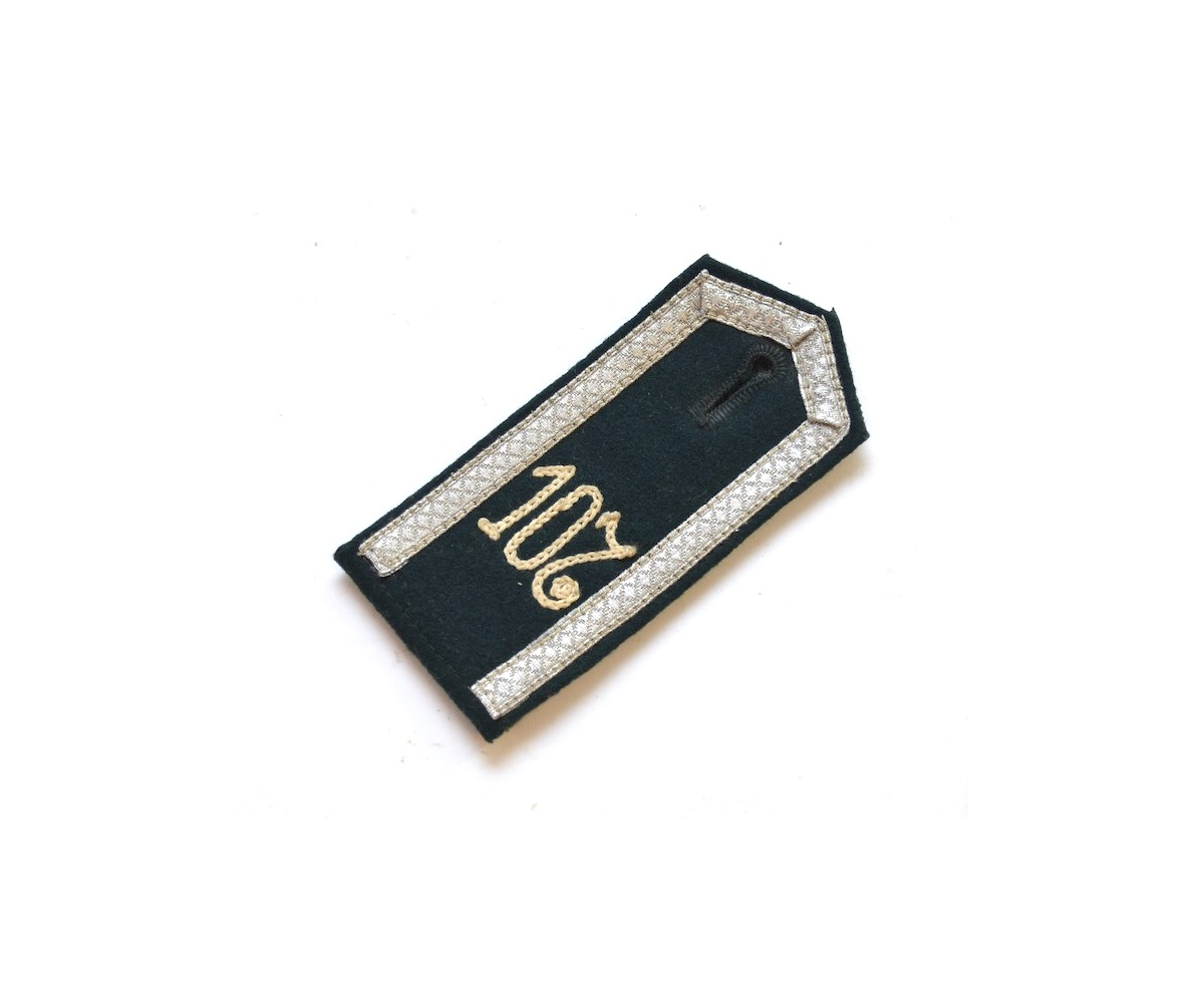 This early strap is made from bluish-dark-green cloth and is in used but good condition. It belonged to an 'Unteroffizier' from 'Infanterie Regiment 107' (hence the white chain-stitched embroidered '107'). It meassures: 5,3cm x 11,5cm