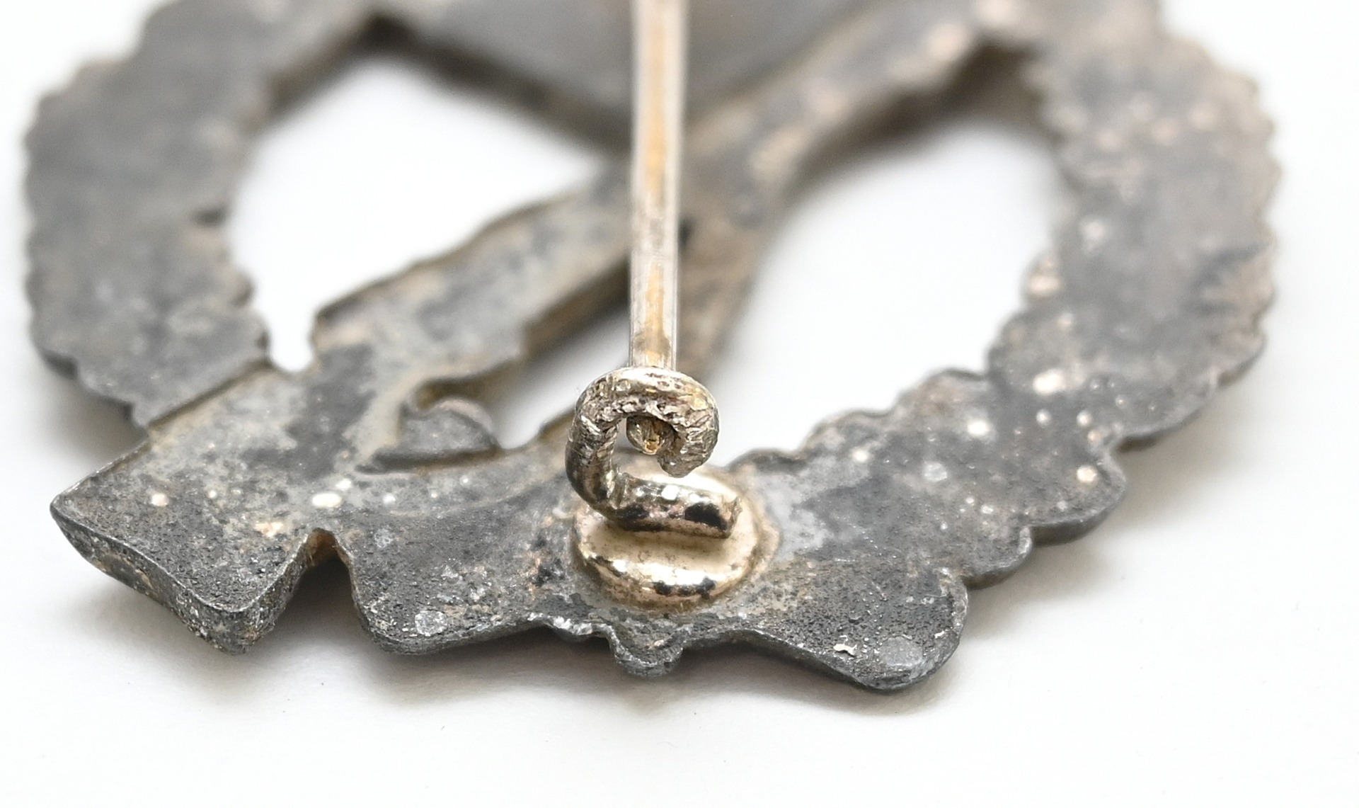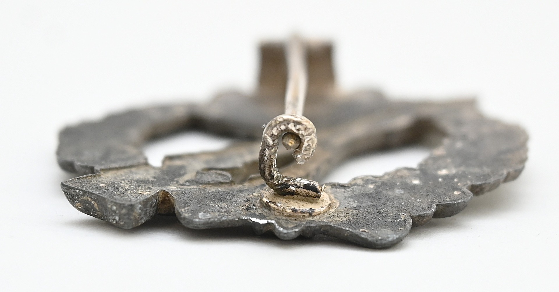 The badge shows overall normal signs of wear. It still contains approx 65% of its original silver finish. It's complete with pin and catch on the back, however the pin is stuck in the catch. With some effort this could be fixed.