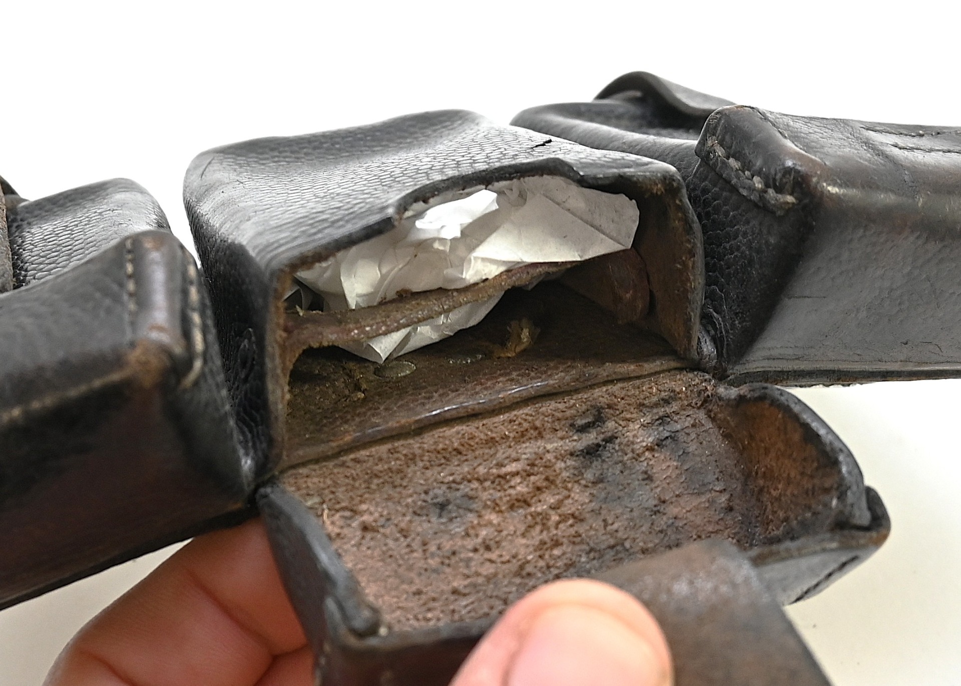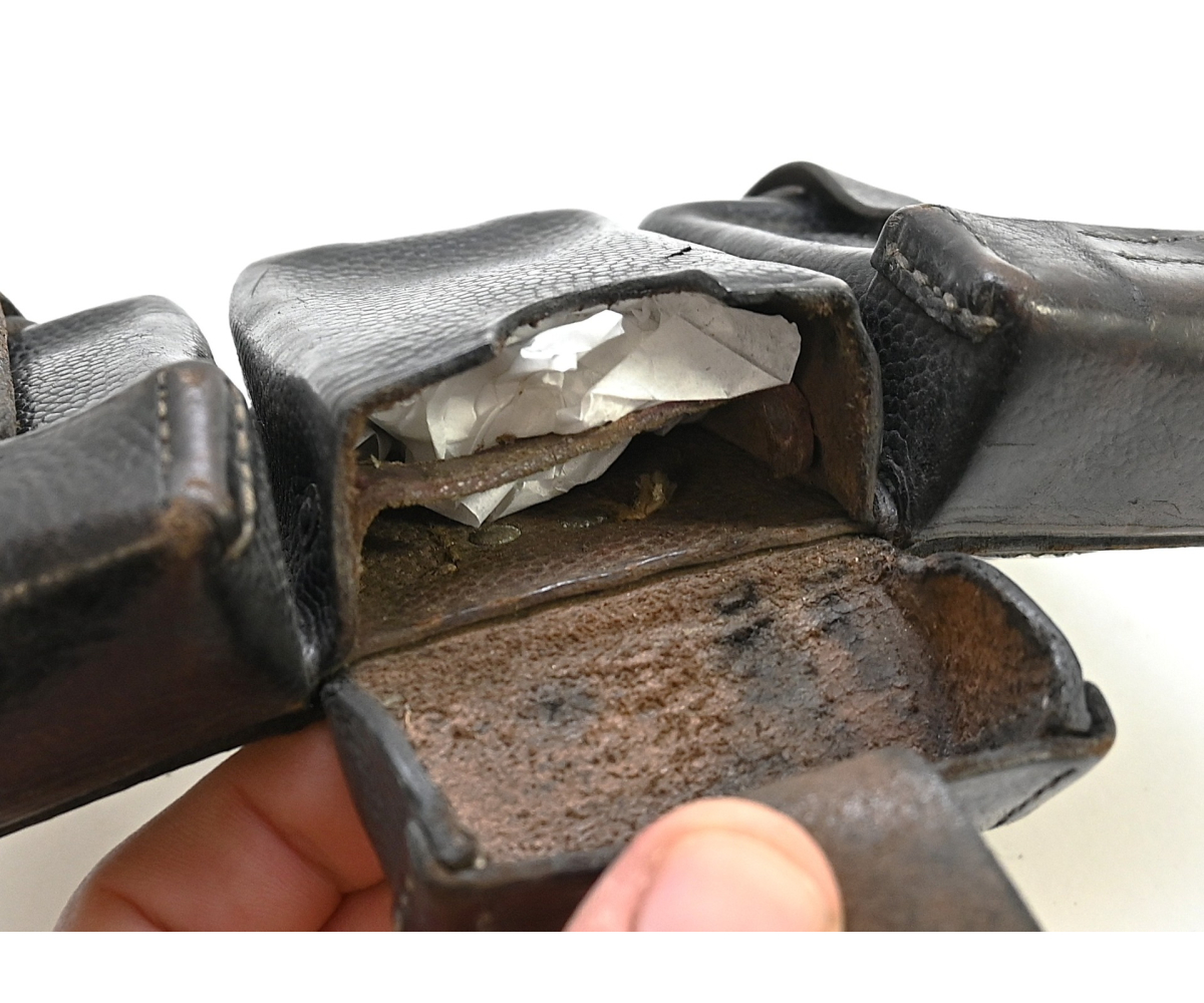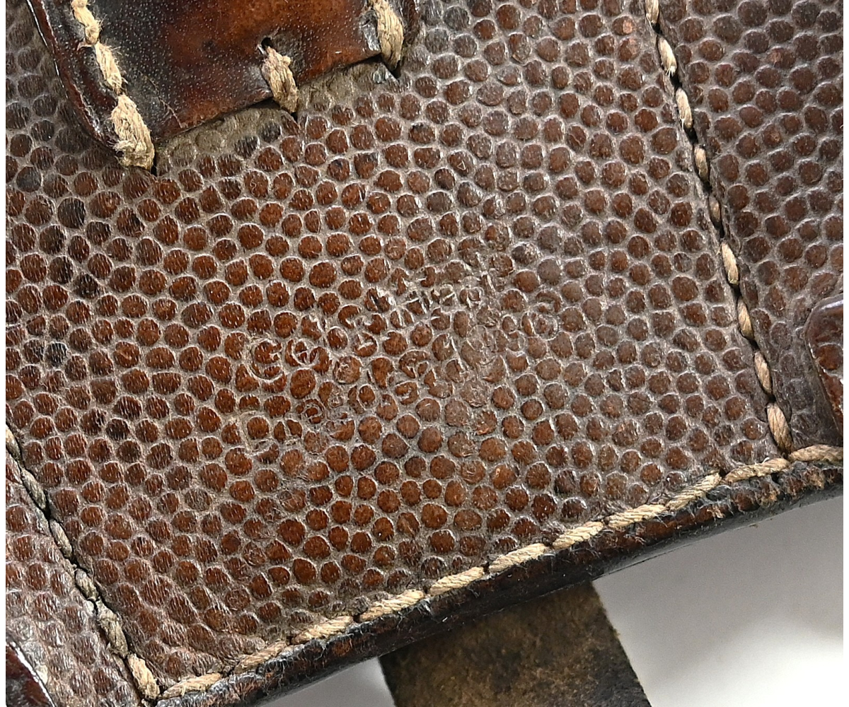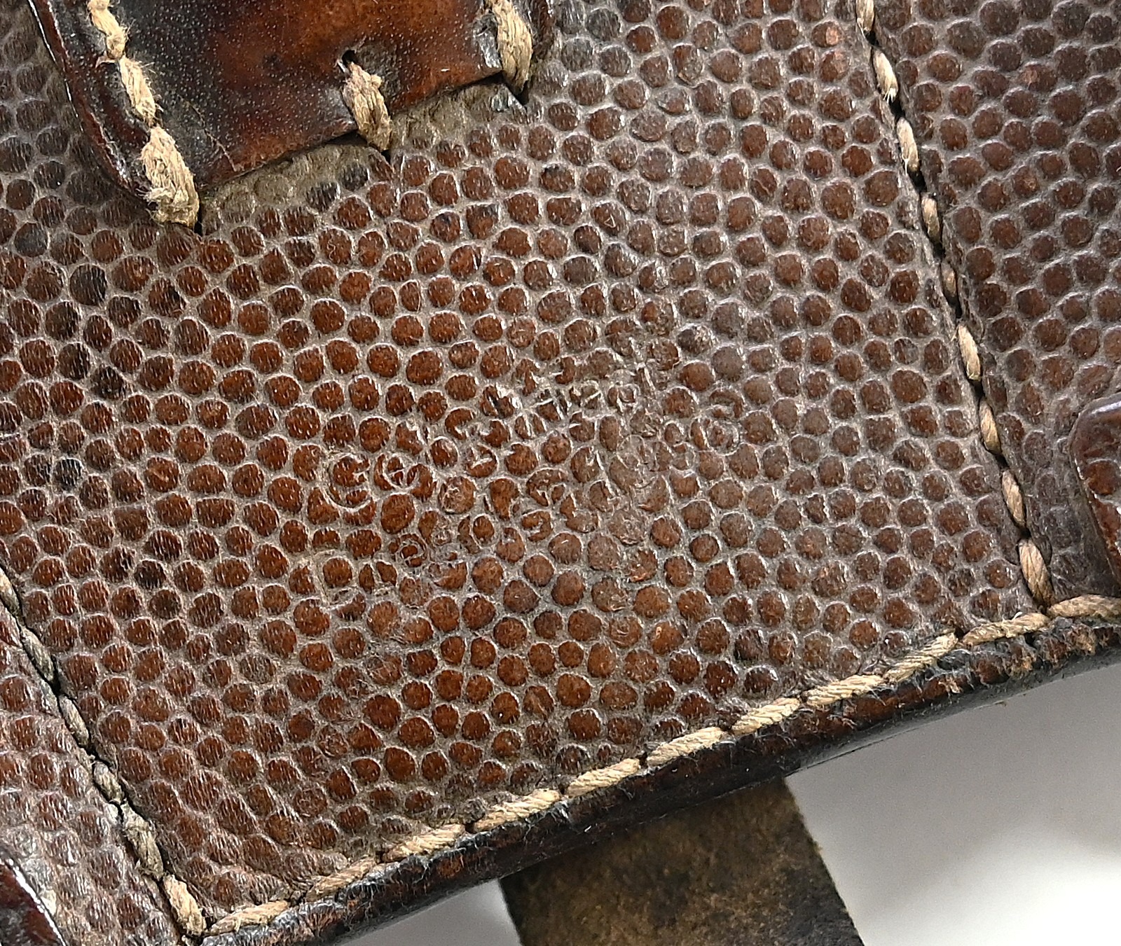 The pouch shows overall normal signs of wear. The leather is supple and solid. All the partitions in each compartment are present. Marked on the back by the maker 'Gebr.Hast' from Dresden and dated 1936.