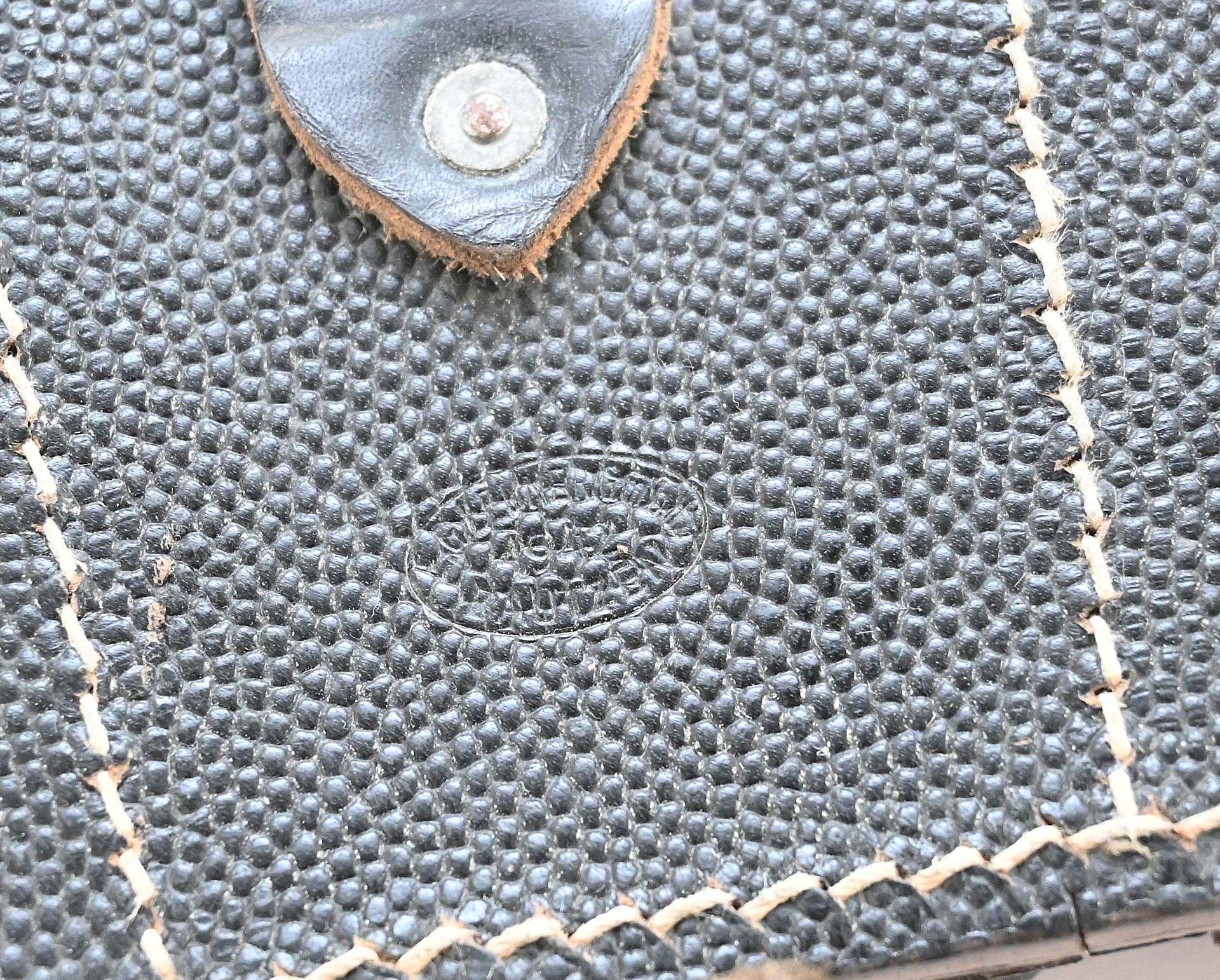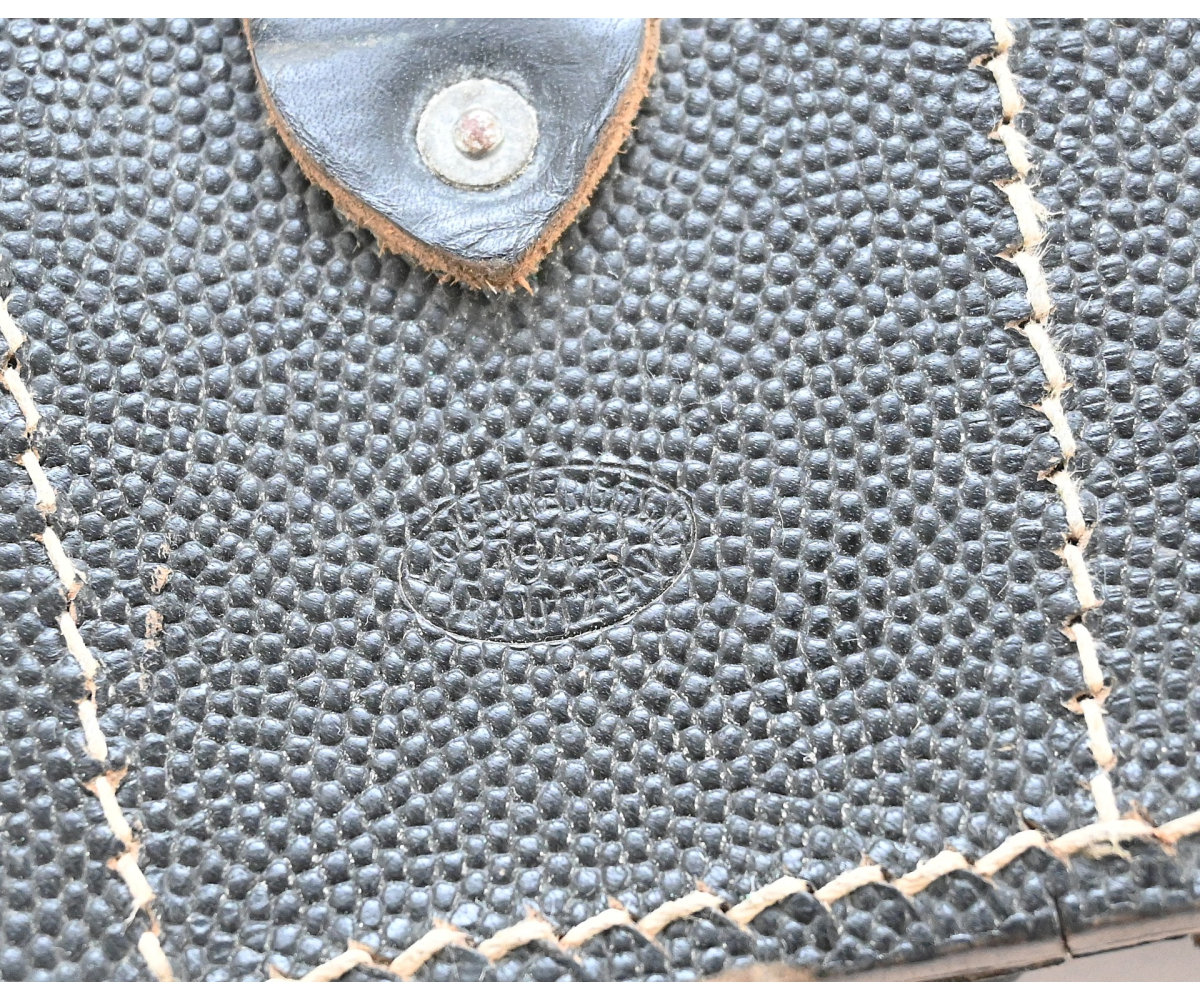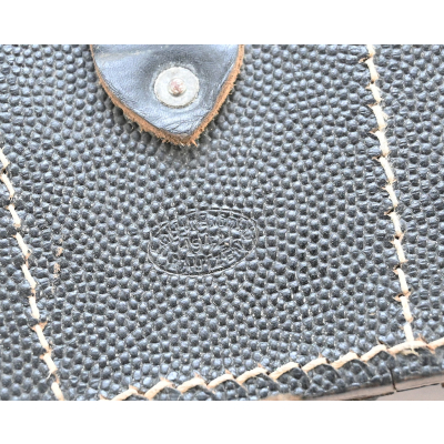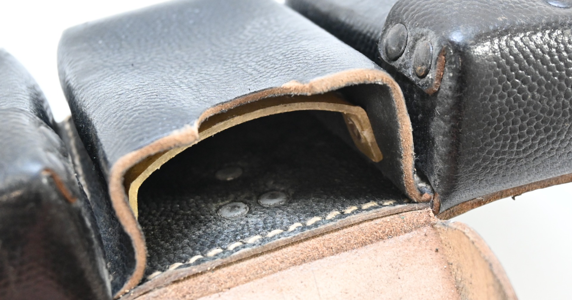 The pouch shows overall normal signs of wear. The leather is supple and solid. All the partitions in each compartment are present. It's marked by the maker and dated 1942.