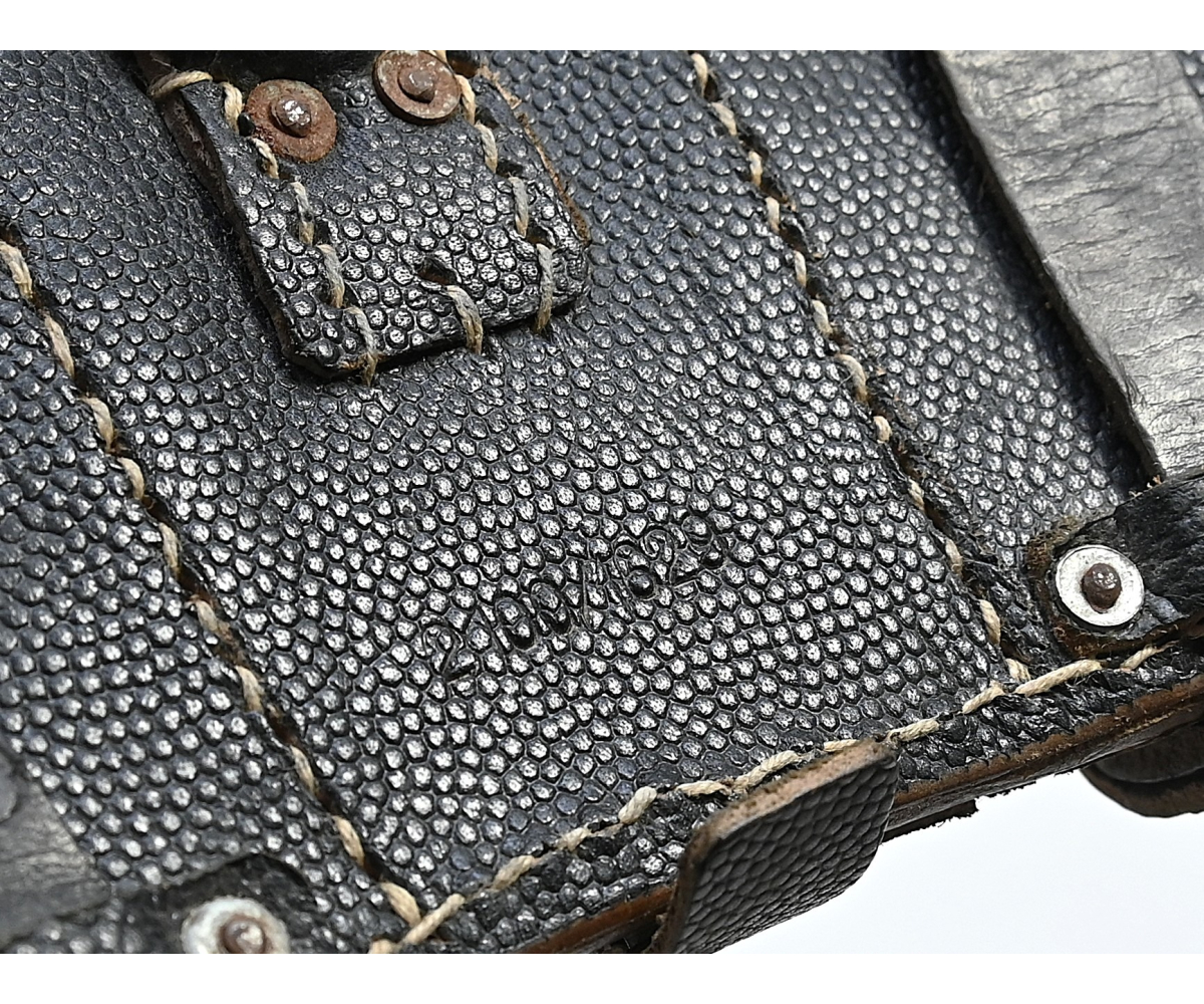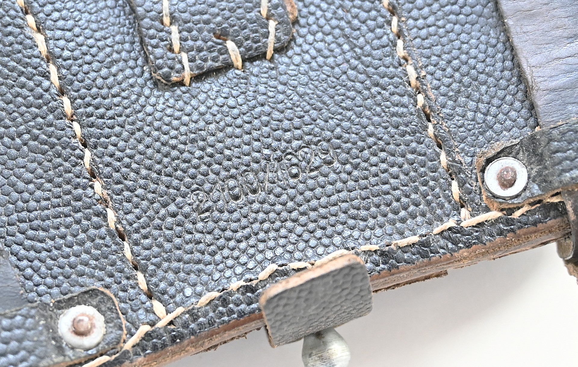 The pouch shows overall normal signs of wear. The leather is supple and solid. All the partitions in each compartment are present. It's marked with a rare short RBNr. 2100/1629 which was made by a manufacturer in France/Elsaß.