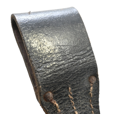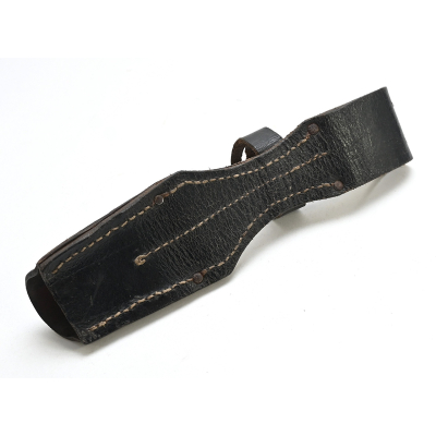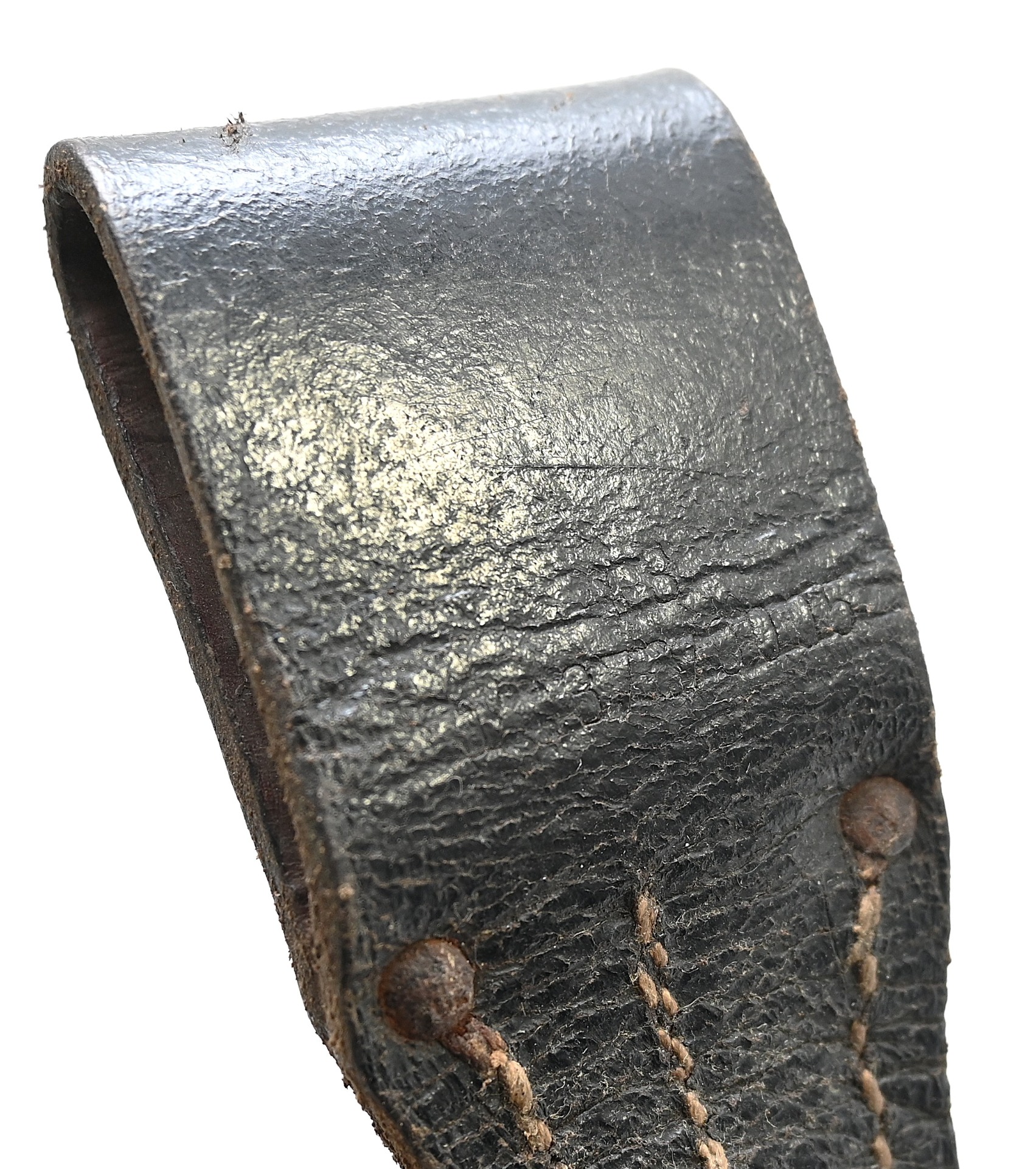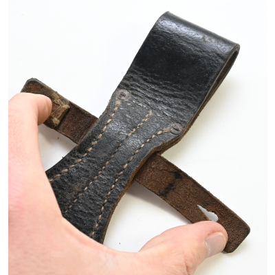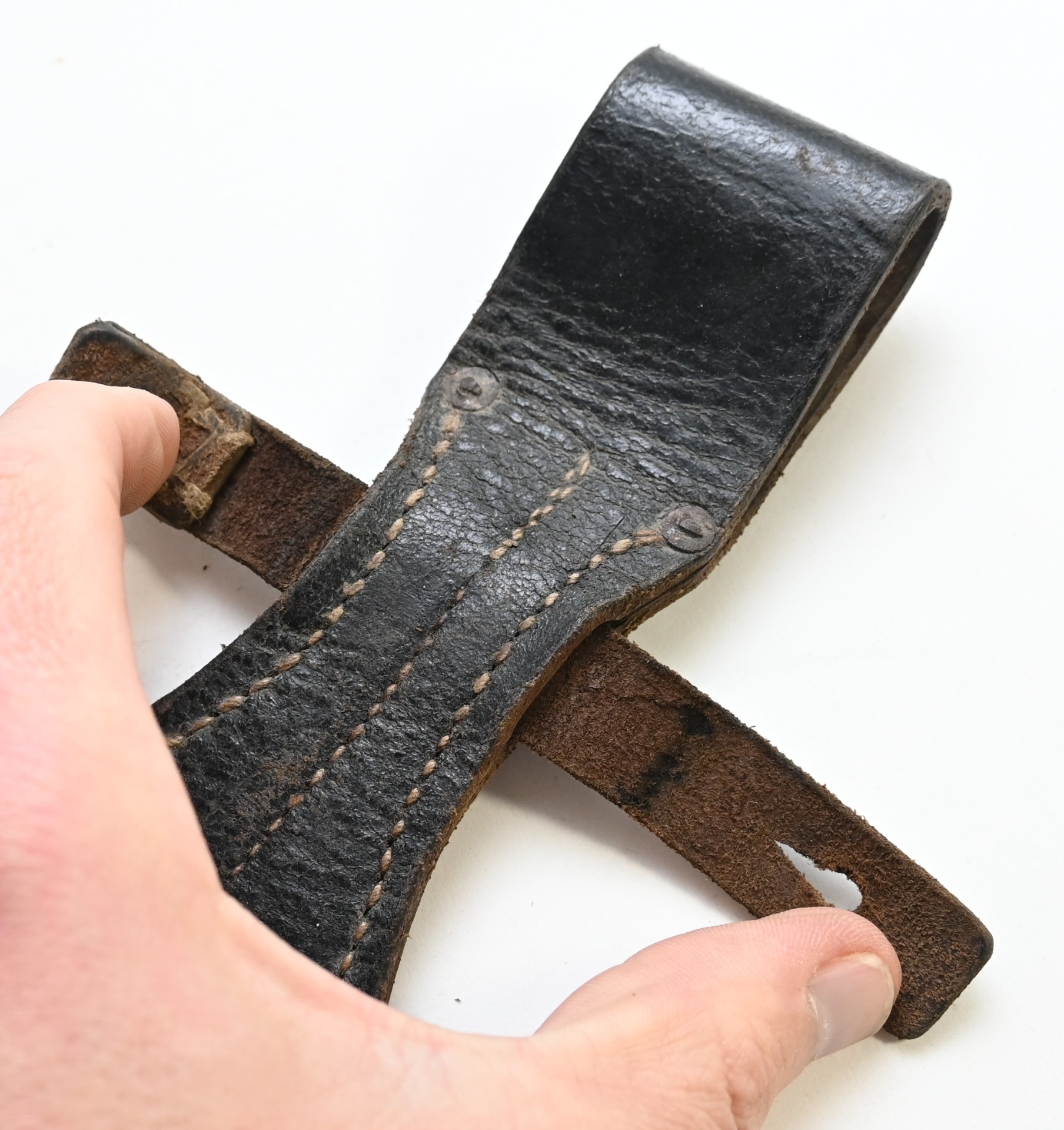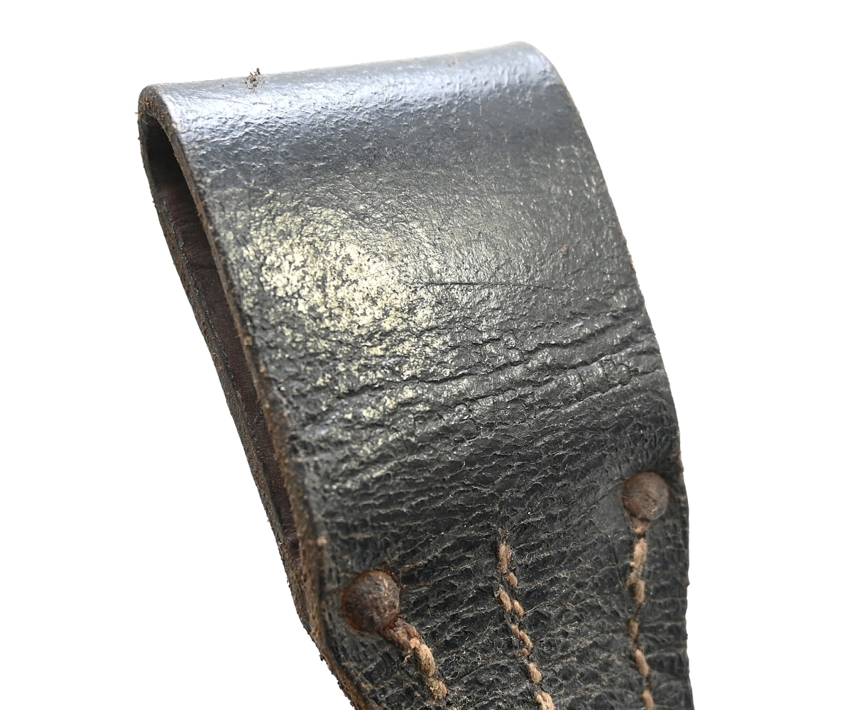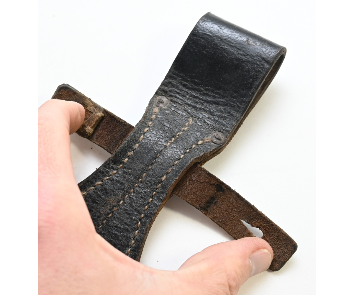 The frog shows overall normal signs of use. Its complete with retaining strap and the leather is supple and solid. It's marked with a RBNr. on the back.
