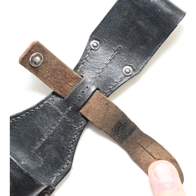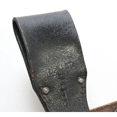 The frog shows overall signs of wear. The leather is supple and solid. It comes with a brown leather retaining strap which was added later. We got it like this and leave it up to the buyer what to do with it. It sits firm in place. On the back the frog is marked by the manufacturer 'TEXLED' from Litzmannstadt and dated 1943. TEXLED is short for Textil- und Lederverwertung and was an SS lead factory that used slave labourers to produce equipment for the Wehrmacht and the SS.