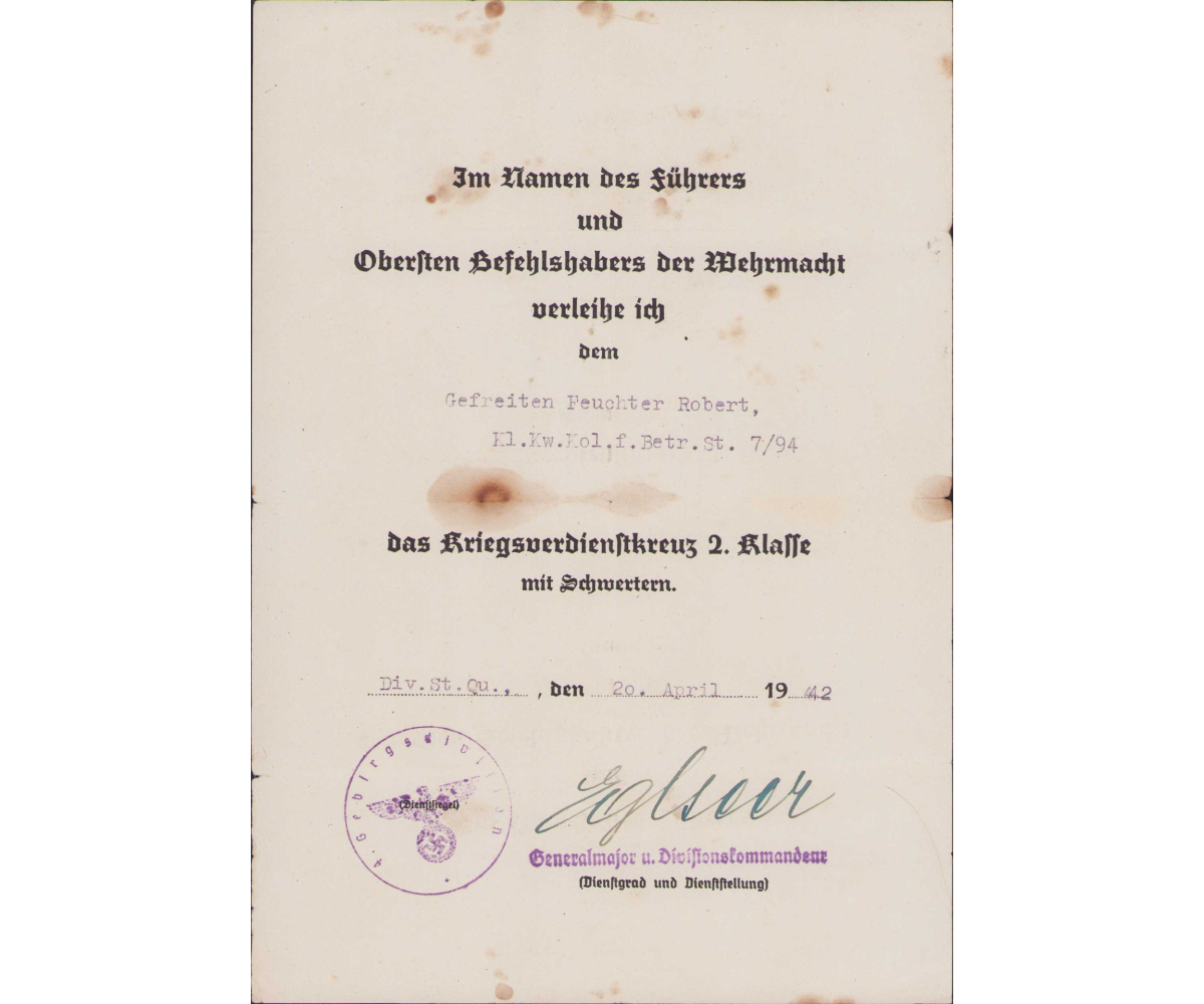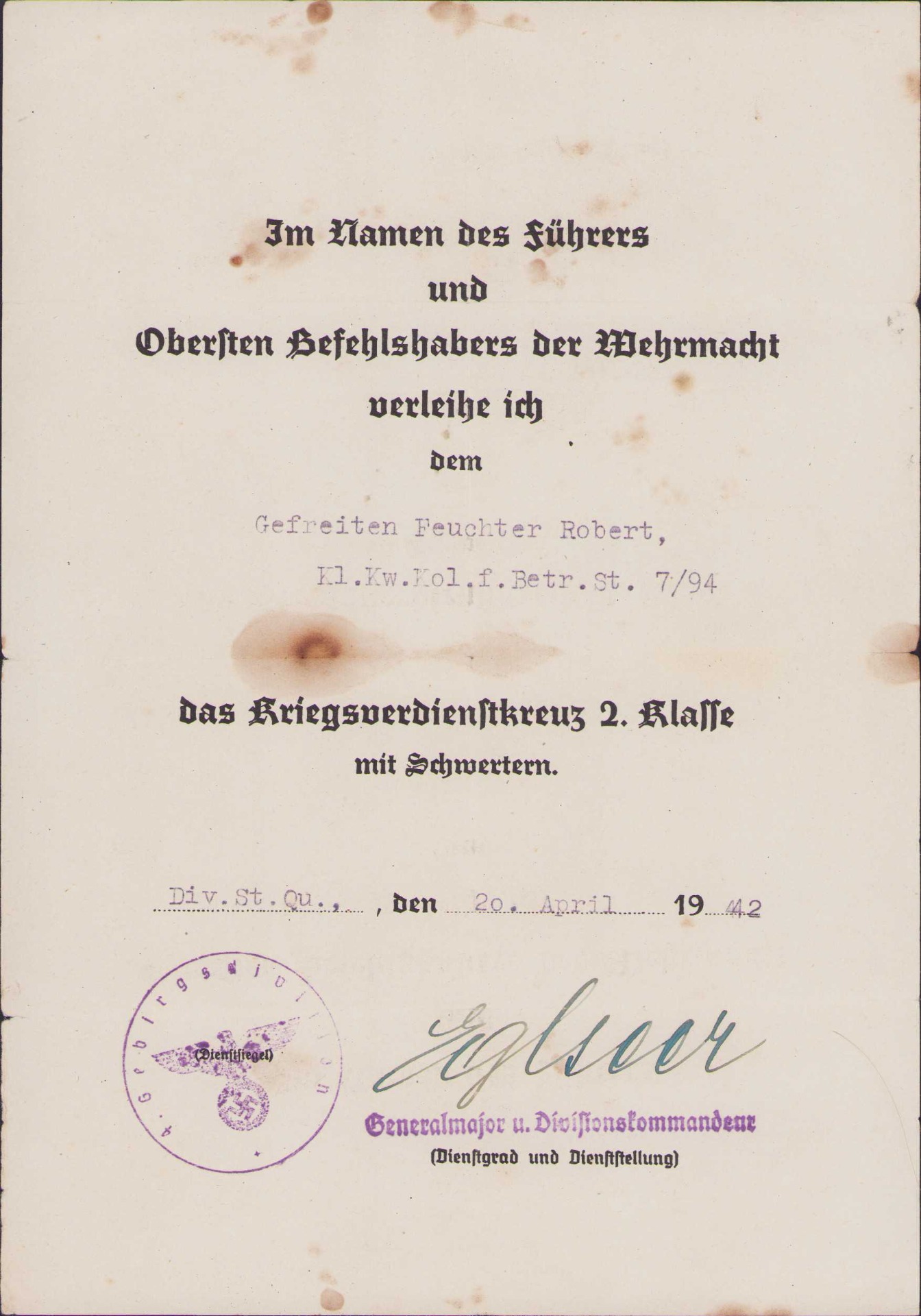 The document shows overall normal signs of wear. Folded a couple of times, but everything is solid. The medal was awarded to Gefreiten Robert Feuchter who served in the 7.Kleine Kraftfahr Kolonne für Betriebsstoff 94 (Betriebsstoff is Fuel). This unit was part of the Gebirgs-Divisions-Nachschubführer 94 of the 4.Gebirgs-Division, also know as the Enzian-Division.