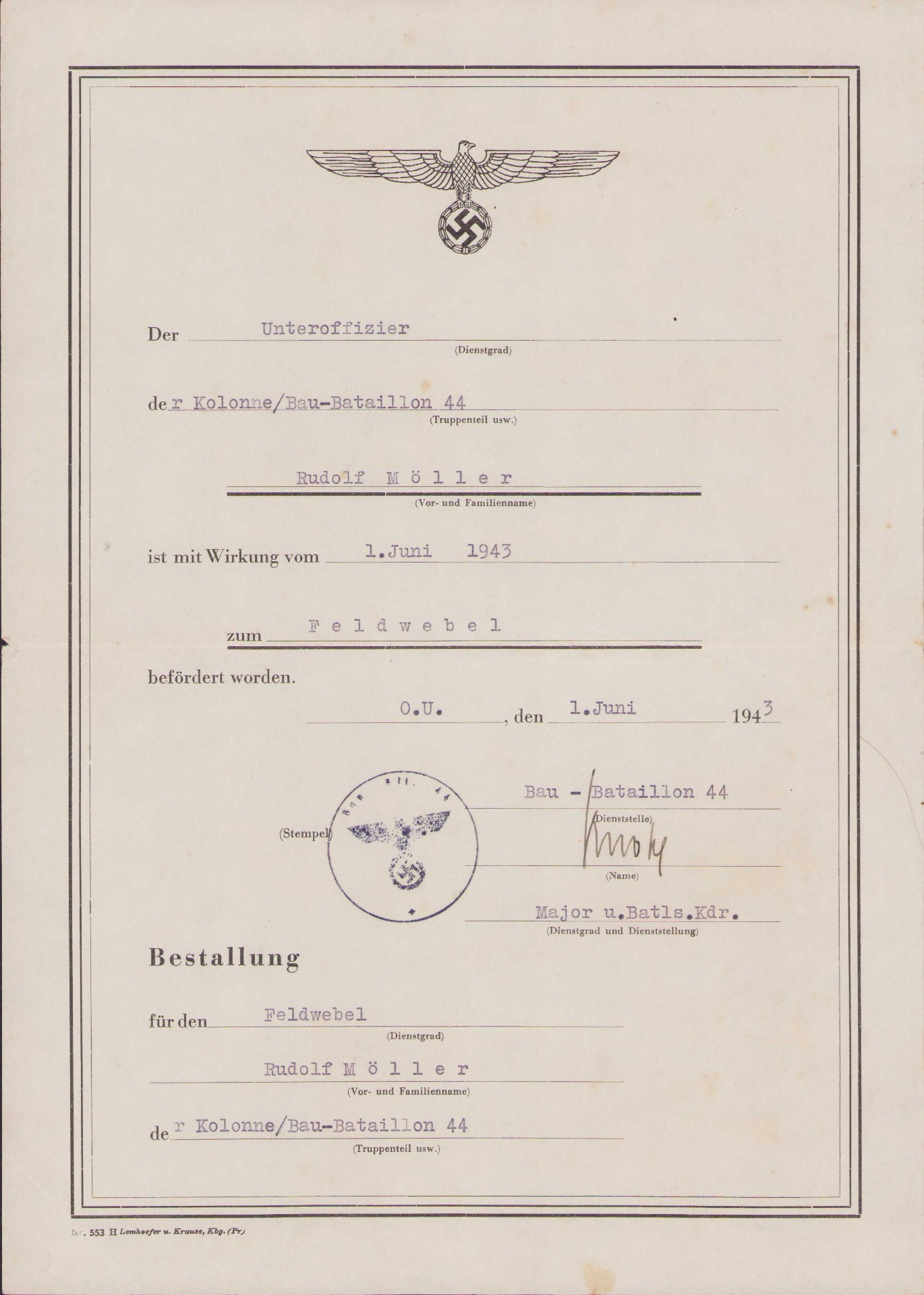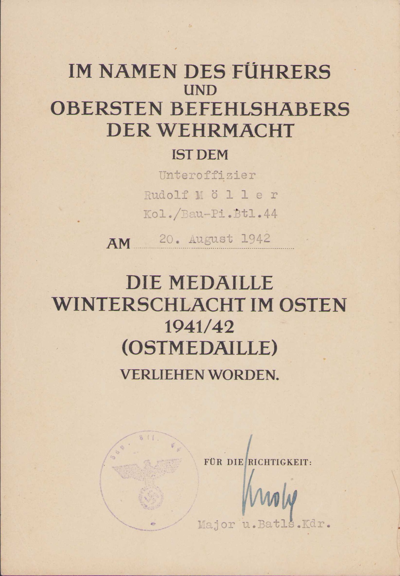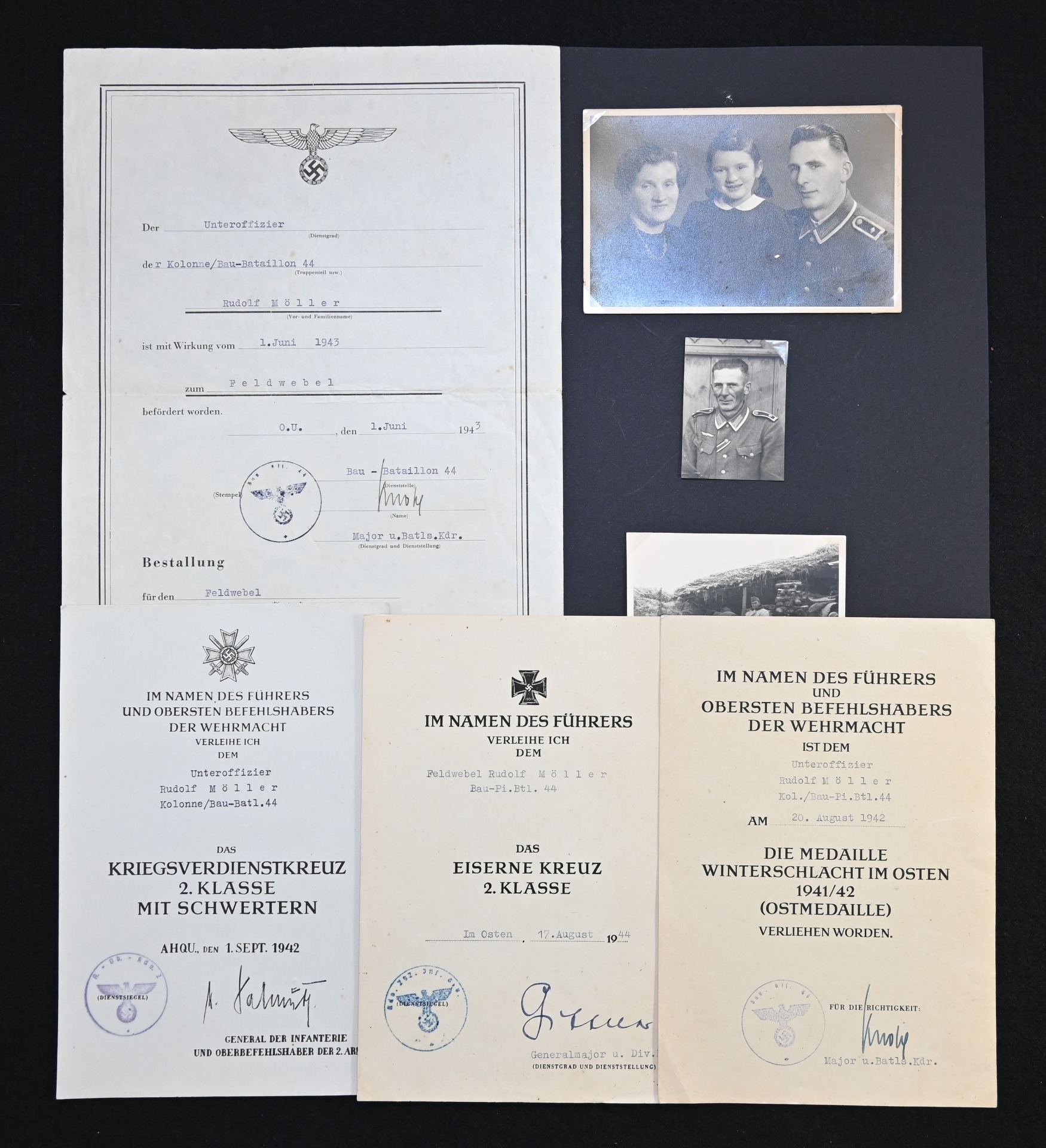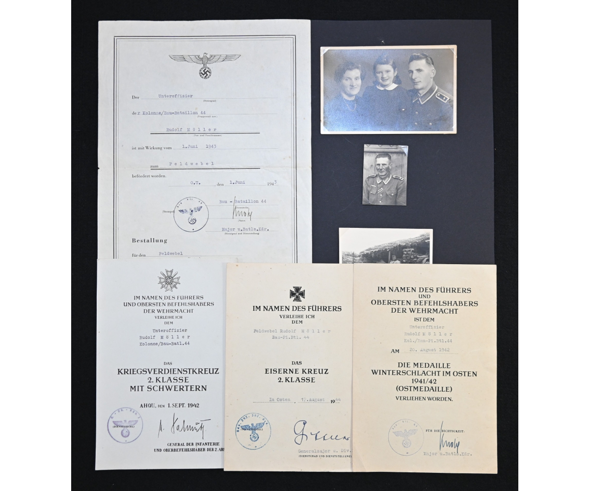 The grouping shows overall normal signs of wear. All solid and no damages. It's nemad to a Feldwebel Rudolf Müller who served in the Kolonne Bau Bataillon 44. This unit was formed in late August 1939 and saw it's first action during the invasion of the west. From June 1941 onwards it participated in the eastern campaign.