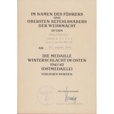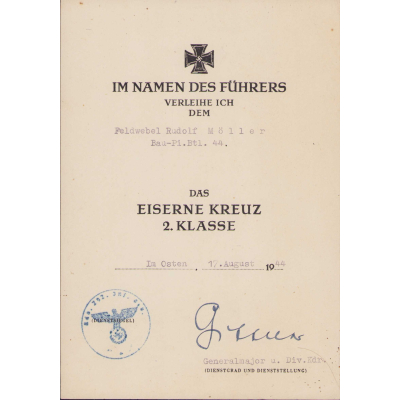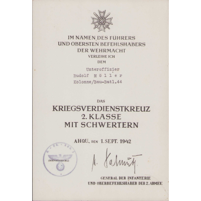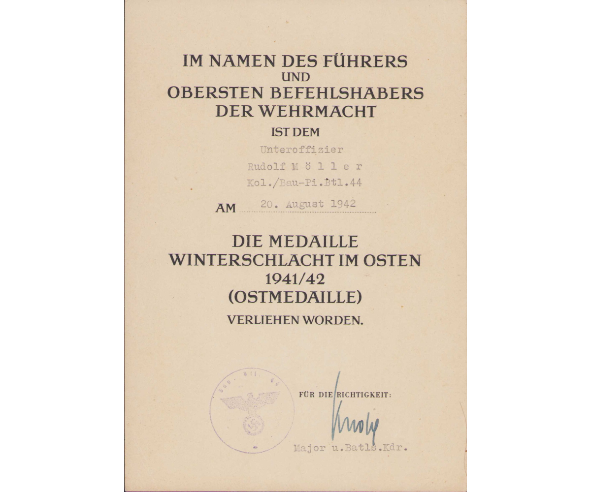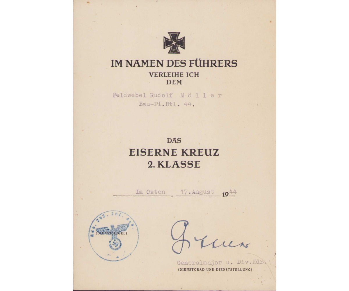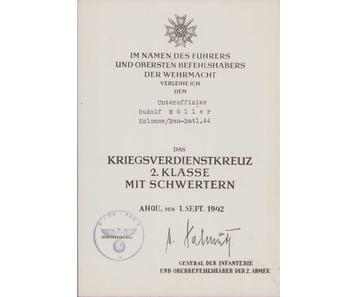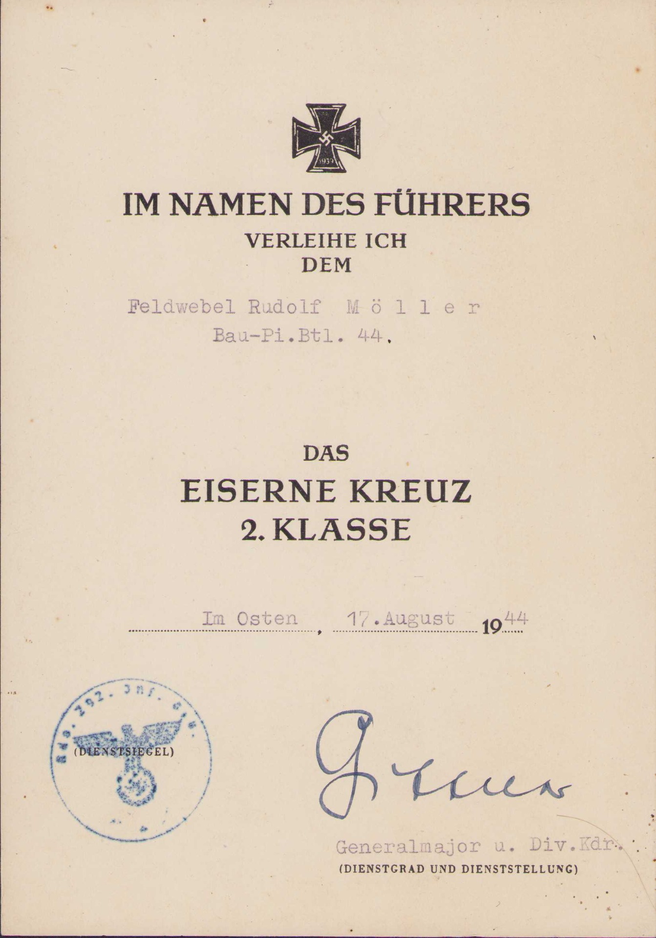 The grouping shows overall normal signs of wear. All solid and no damages. It's nemad to a Feldwebel Rudolf Müller who served in the Kolonne Bau Bataillon 44. This unit was formed in late August 1939 and saw it's first action during the invasion of the west. From June 1941 onwards it participated in the eastern campaign.