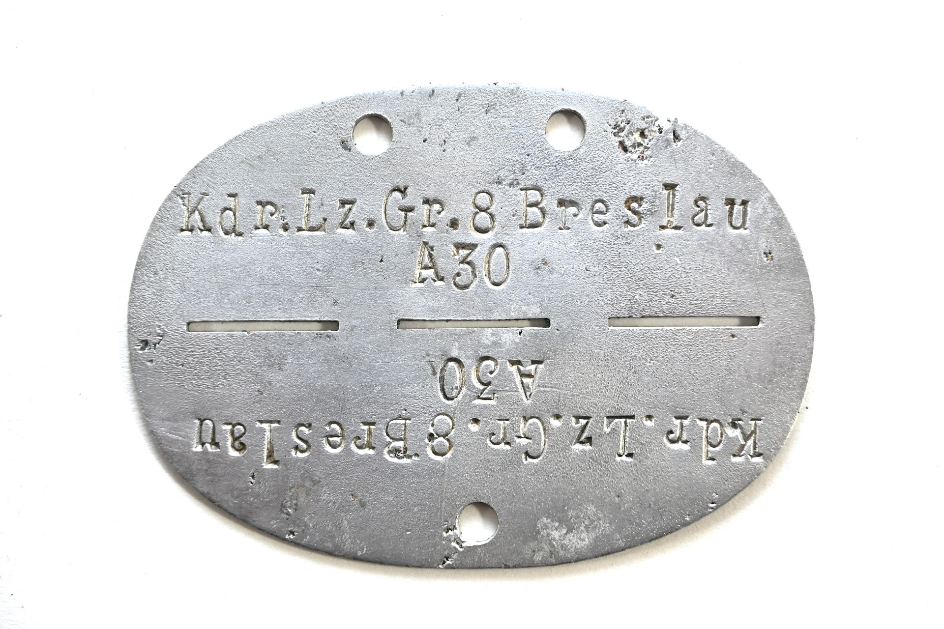The tag or 'Erkennungsmarke' shows overall normal signs of wear. It belonged to a member who served/worked within Kommandeur Luftzeugamt Gruppe 8 Breslau.