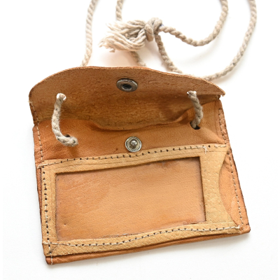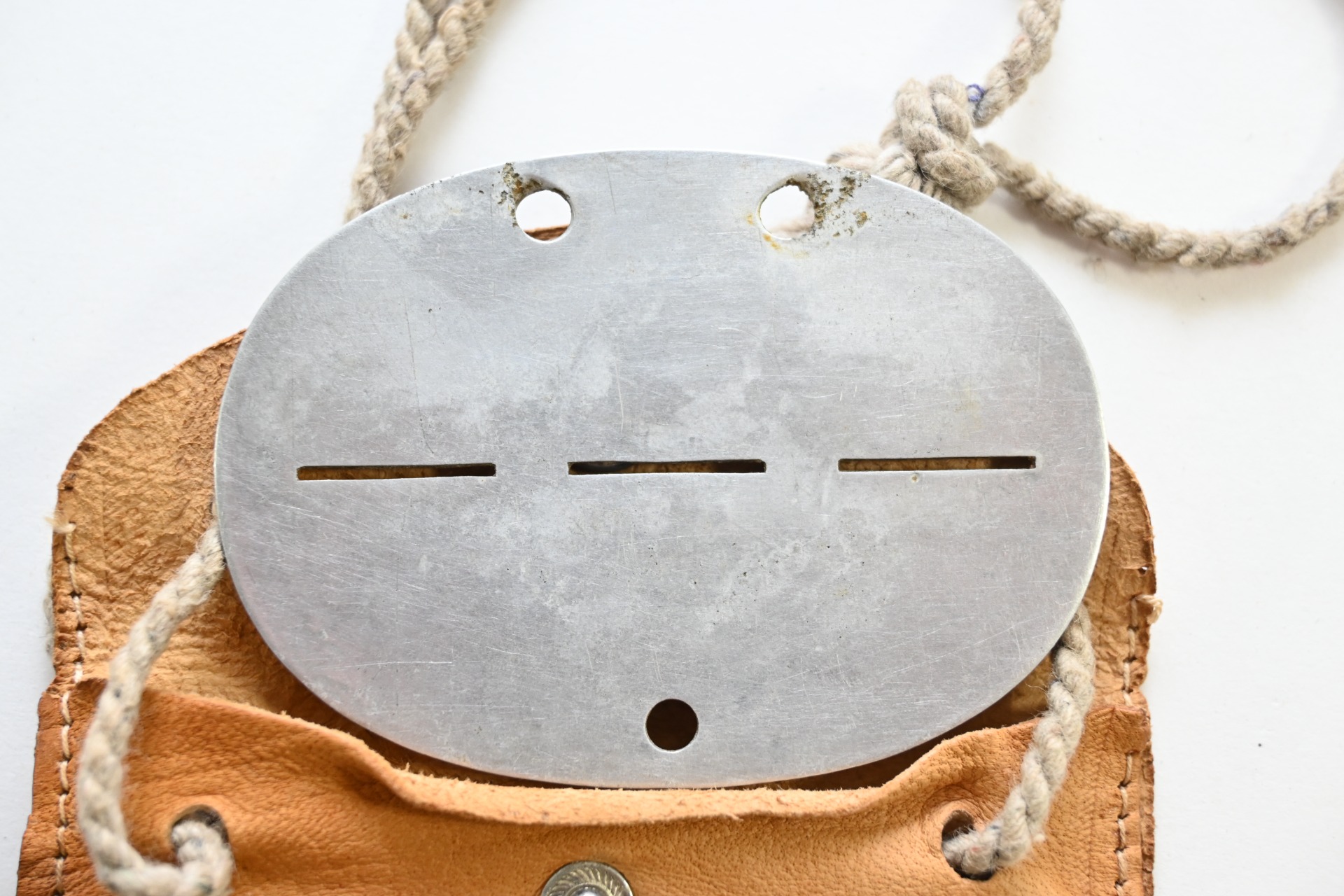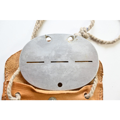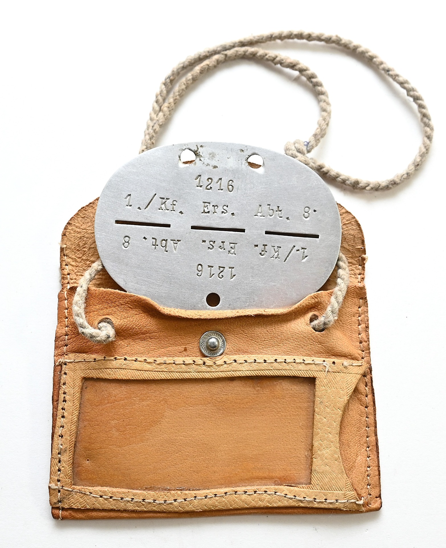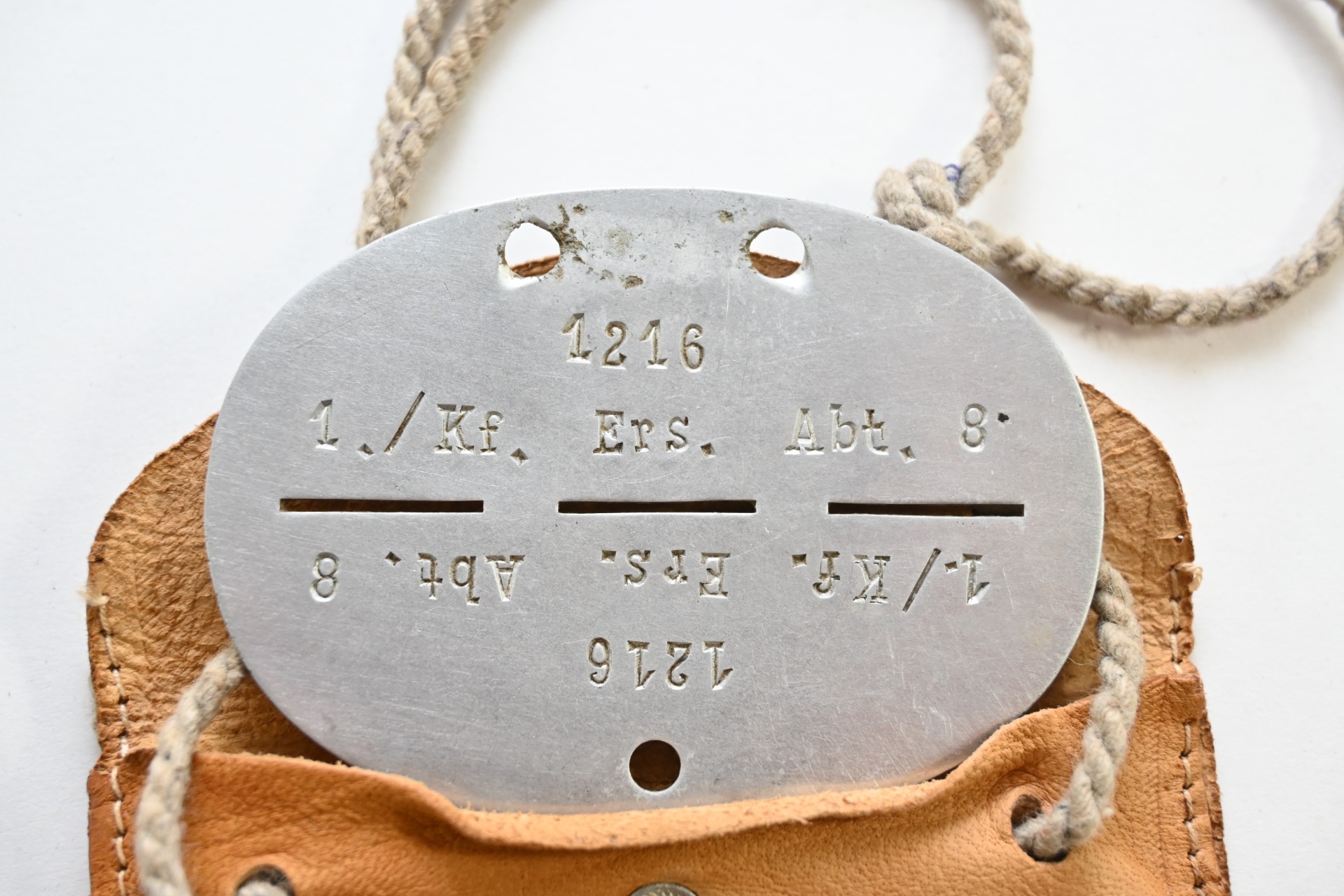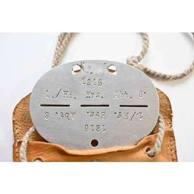 The tag and pouch show overall normal signs of wear. It belonged to a soldier who was drafted in the 1.kompanie Kraftfahr Ersatz Abteilung 8. The pouch has been modifid by a soldier and an additional setcion has been attached on the front of the pouch. It comes with its original neckcord.