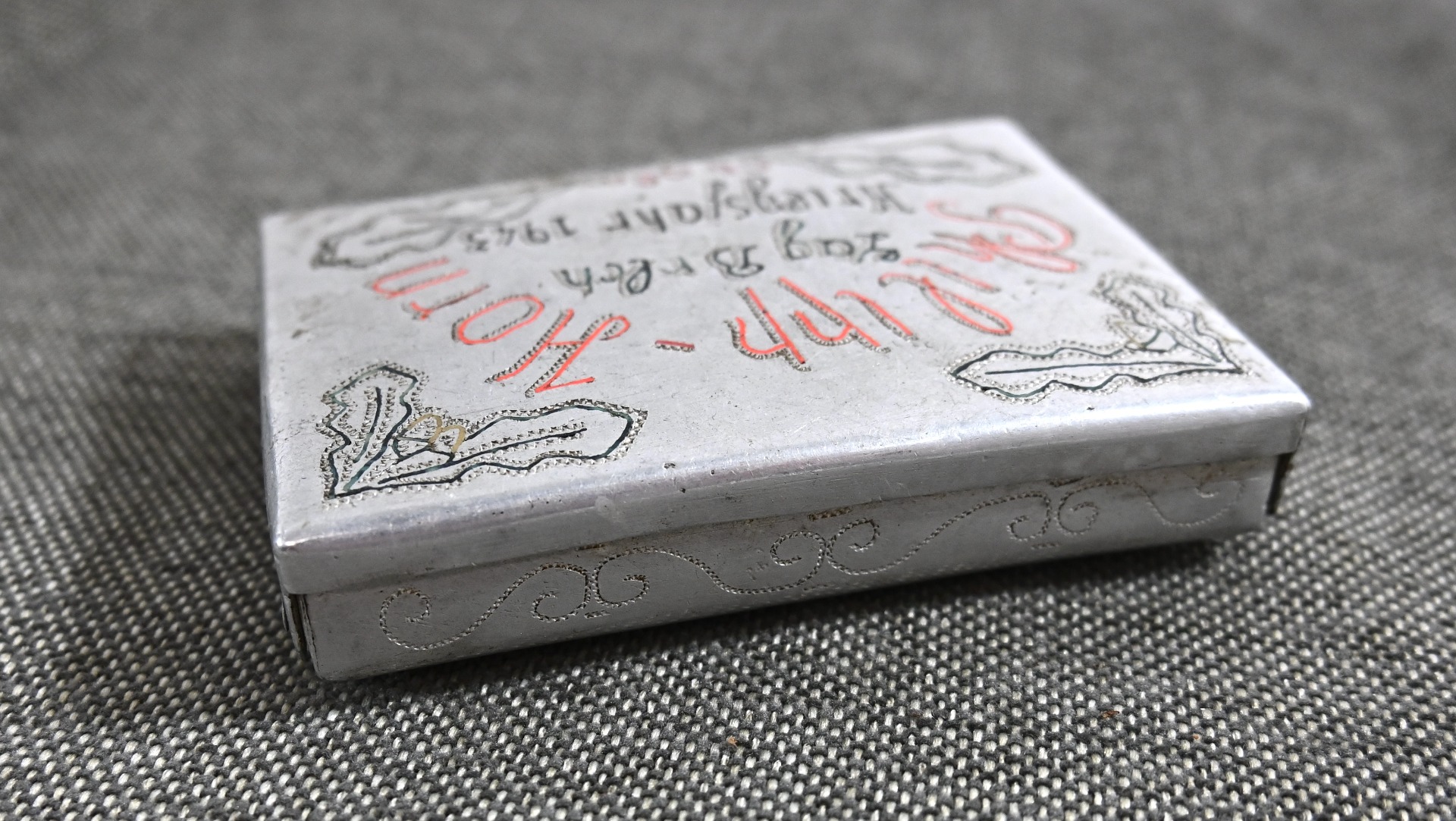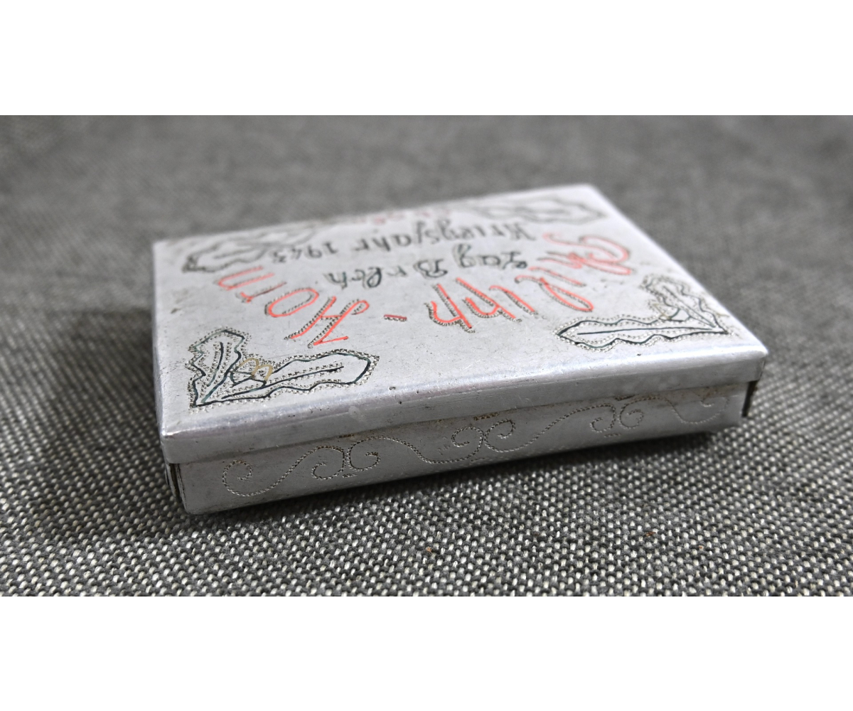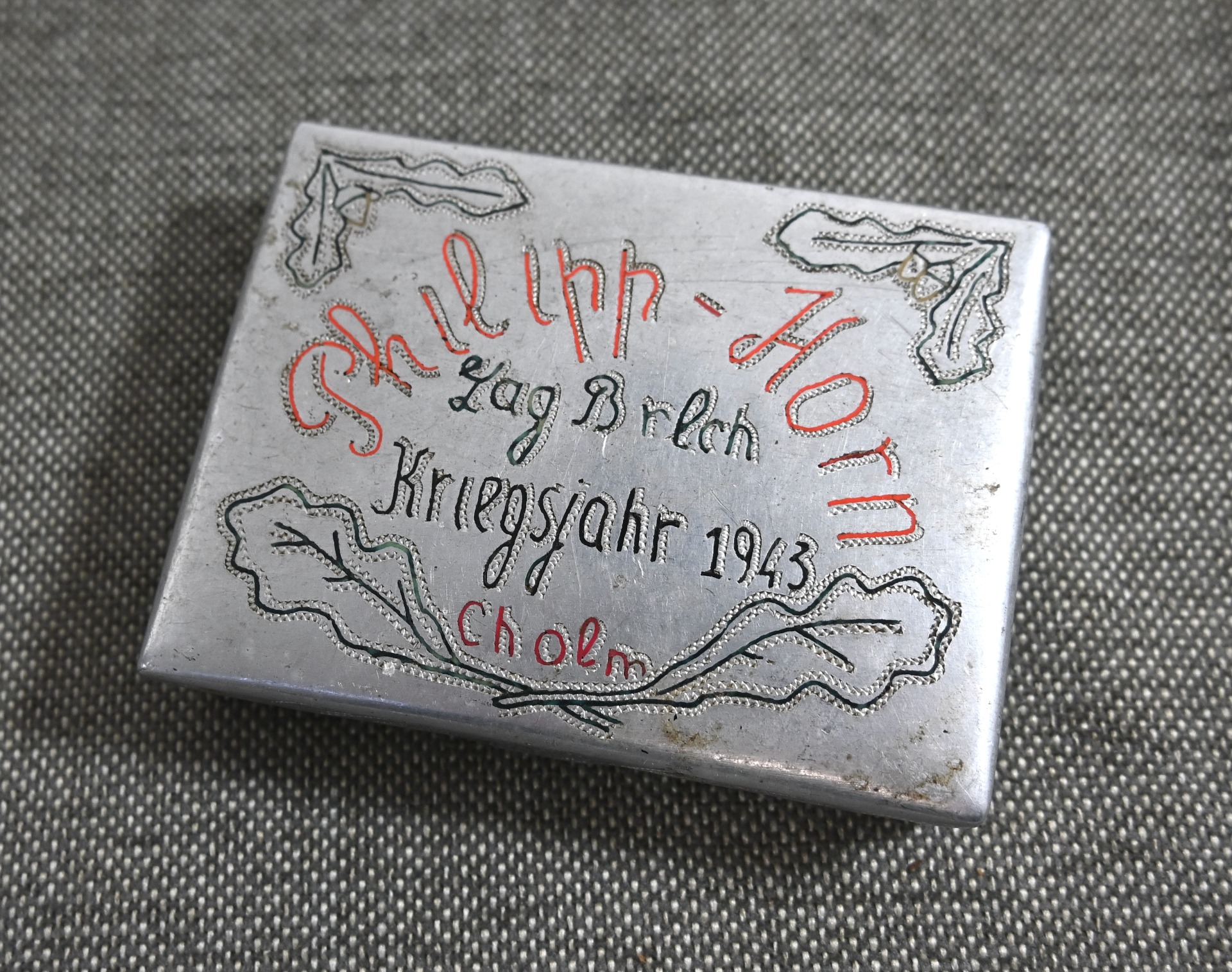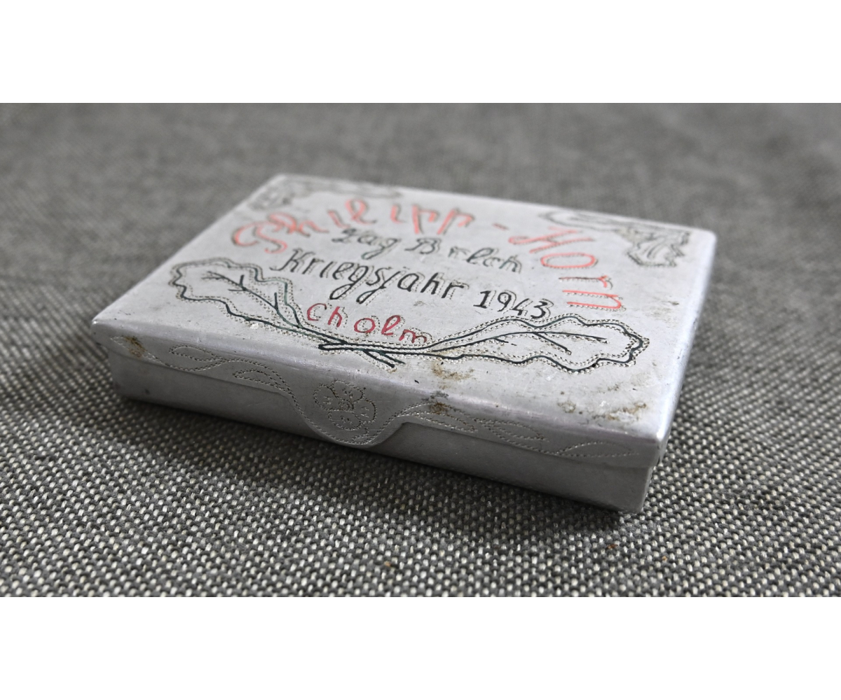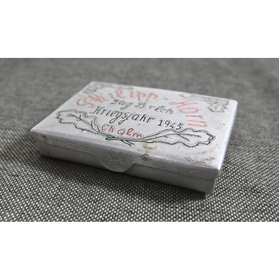 The case shows normal signs of wear. Nicely marked with the name of the soldier, 'Philipp Horn', as well as the prisoner-of-war camp where he was held, 'Lag Brlch' (Cholm, Russia), in the year '1943'.