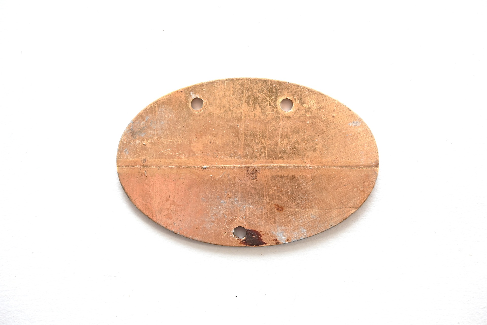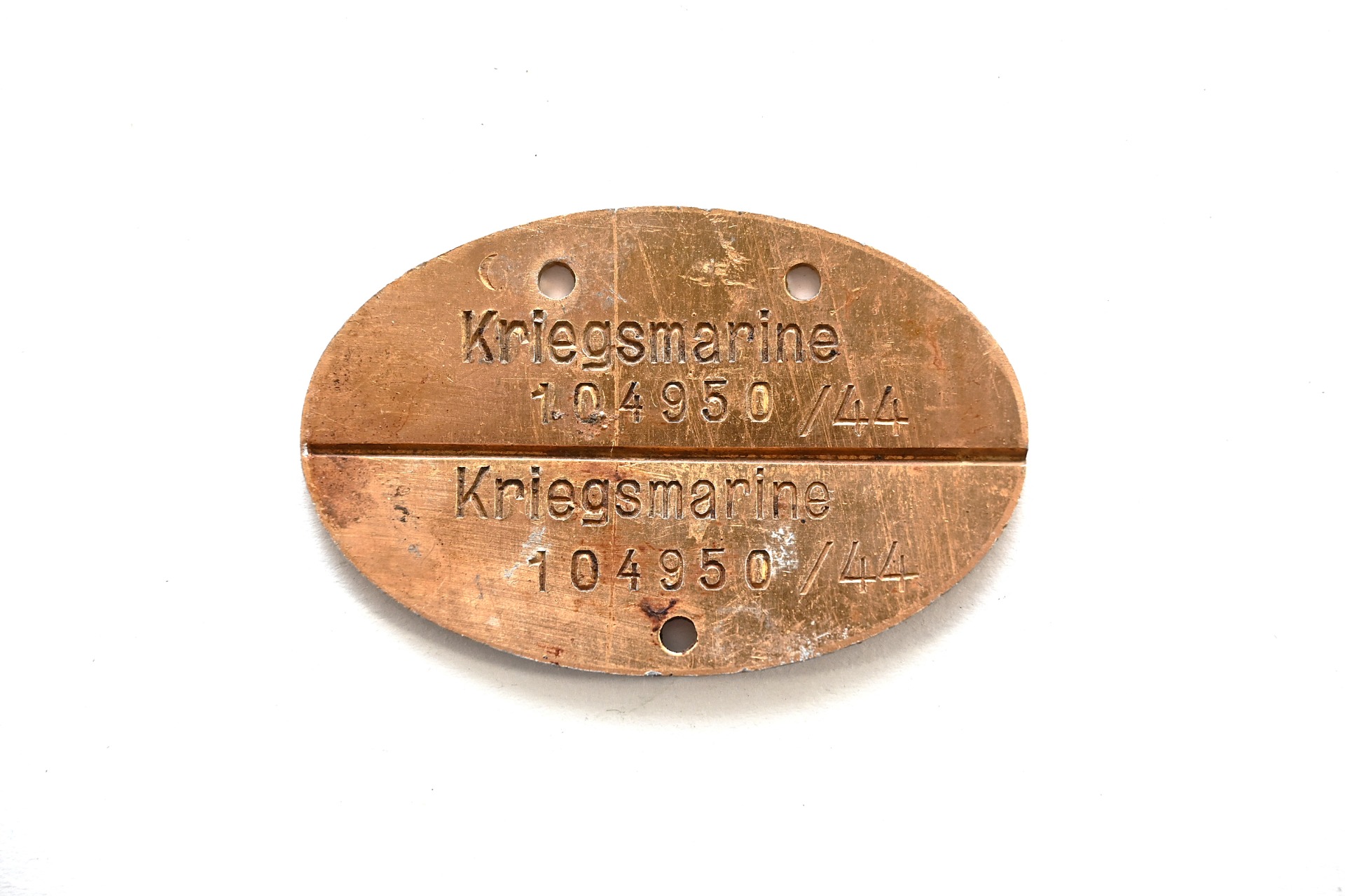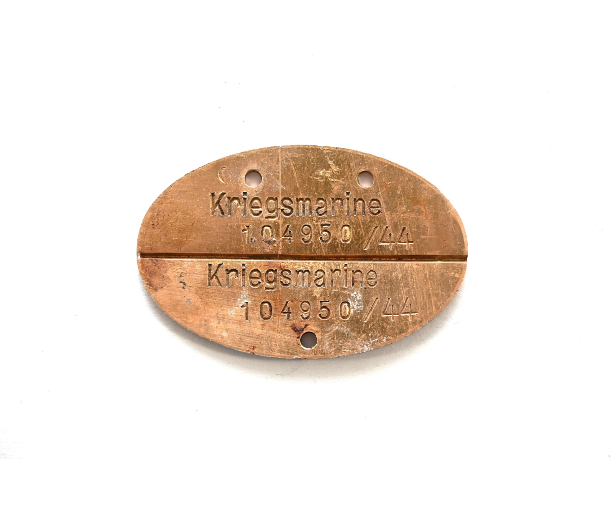 The tag or 'Erkennungsmarke' shows overall normal signs of wear. All of its gilding is present. It belonged to a sailor who was drafted within the Kriegsmarine in the year 1944.