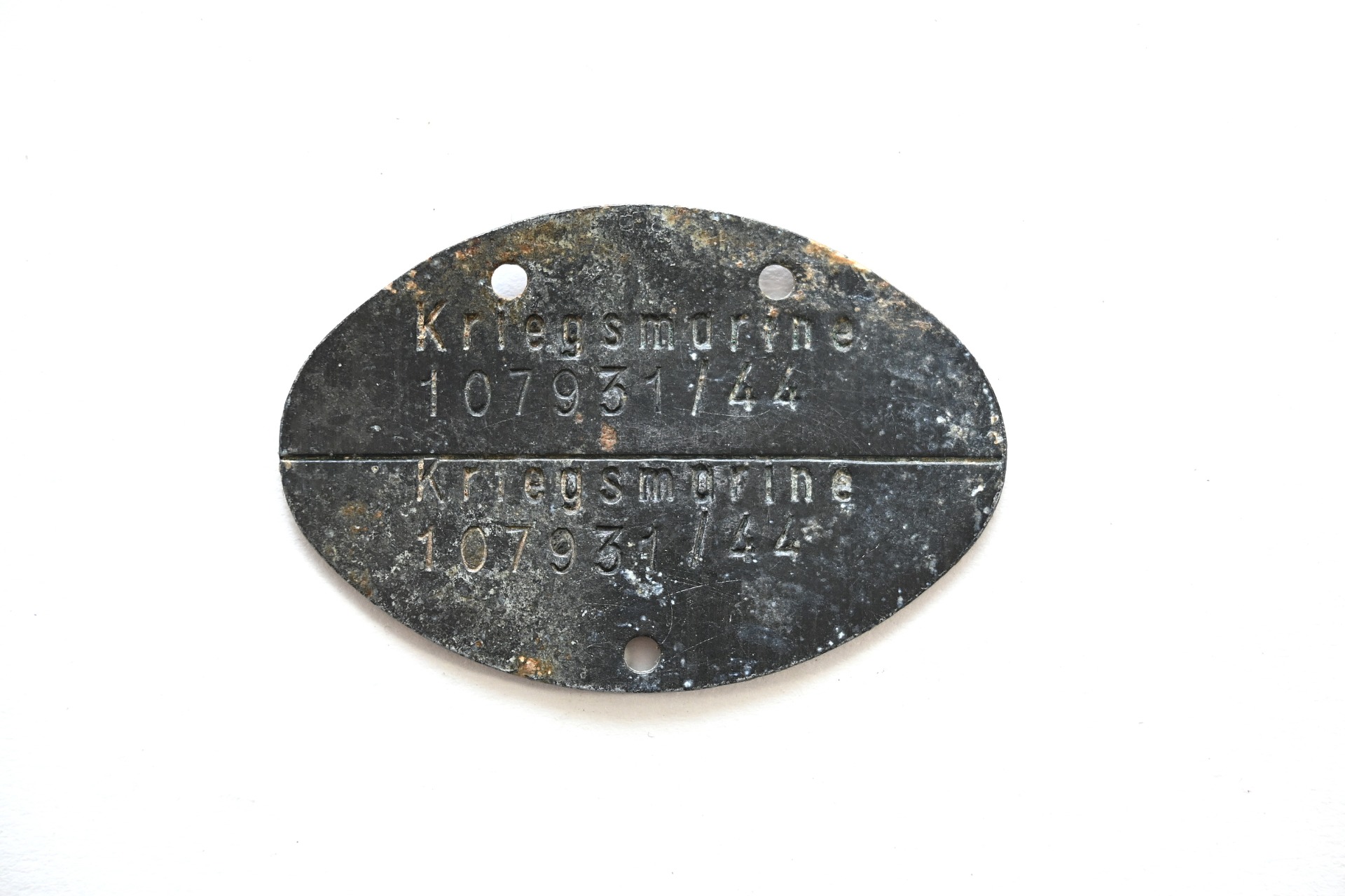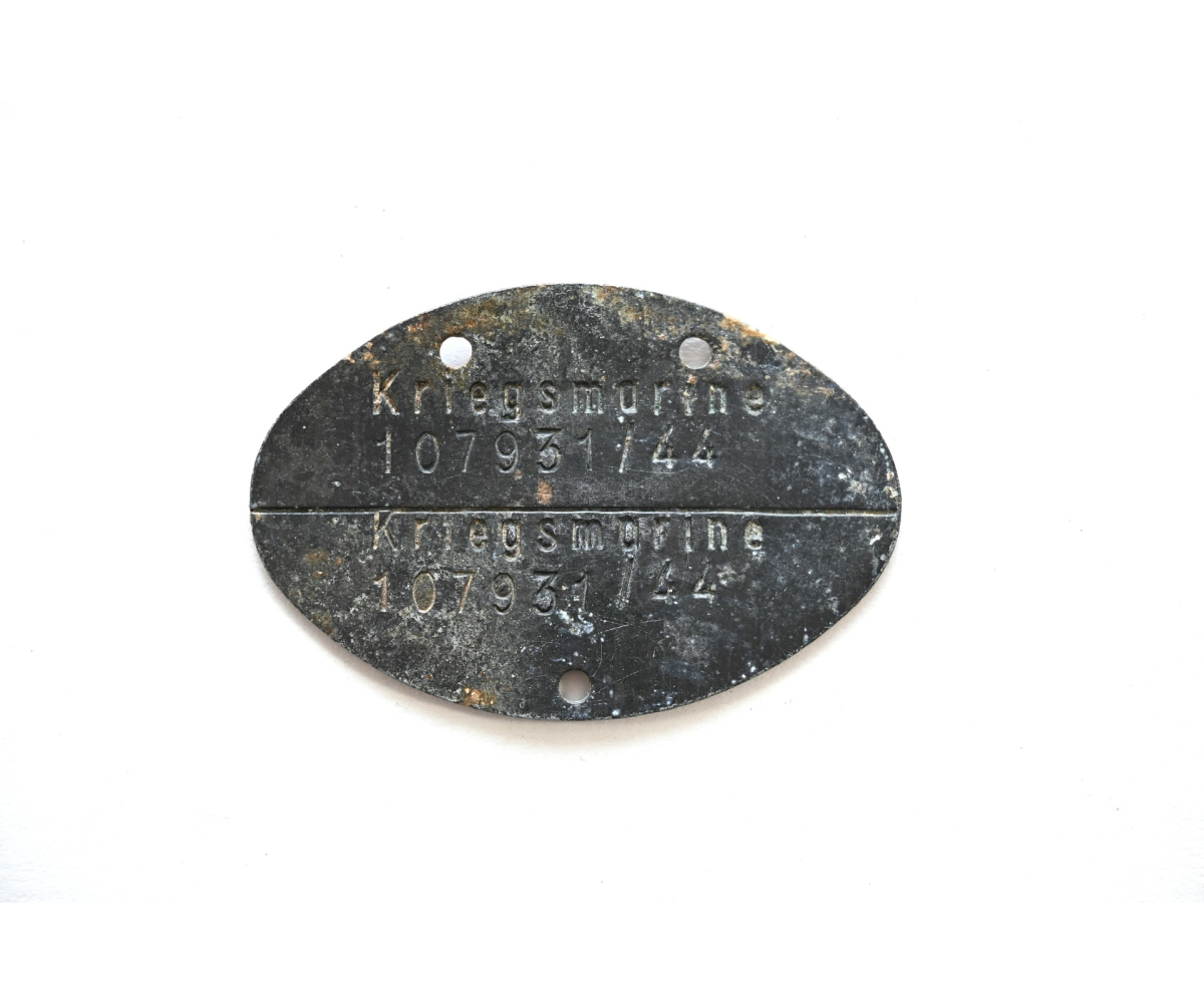 The tag or 'Erkennungsmarke' shows overall signs of wear. It belonged to a sailor who was drafted within the Kriegsmarine in the year 1944.