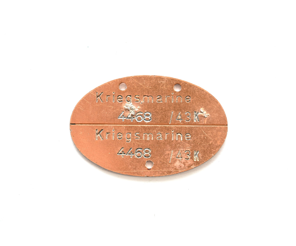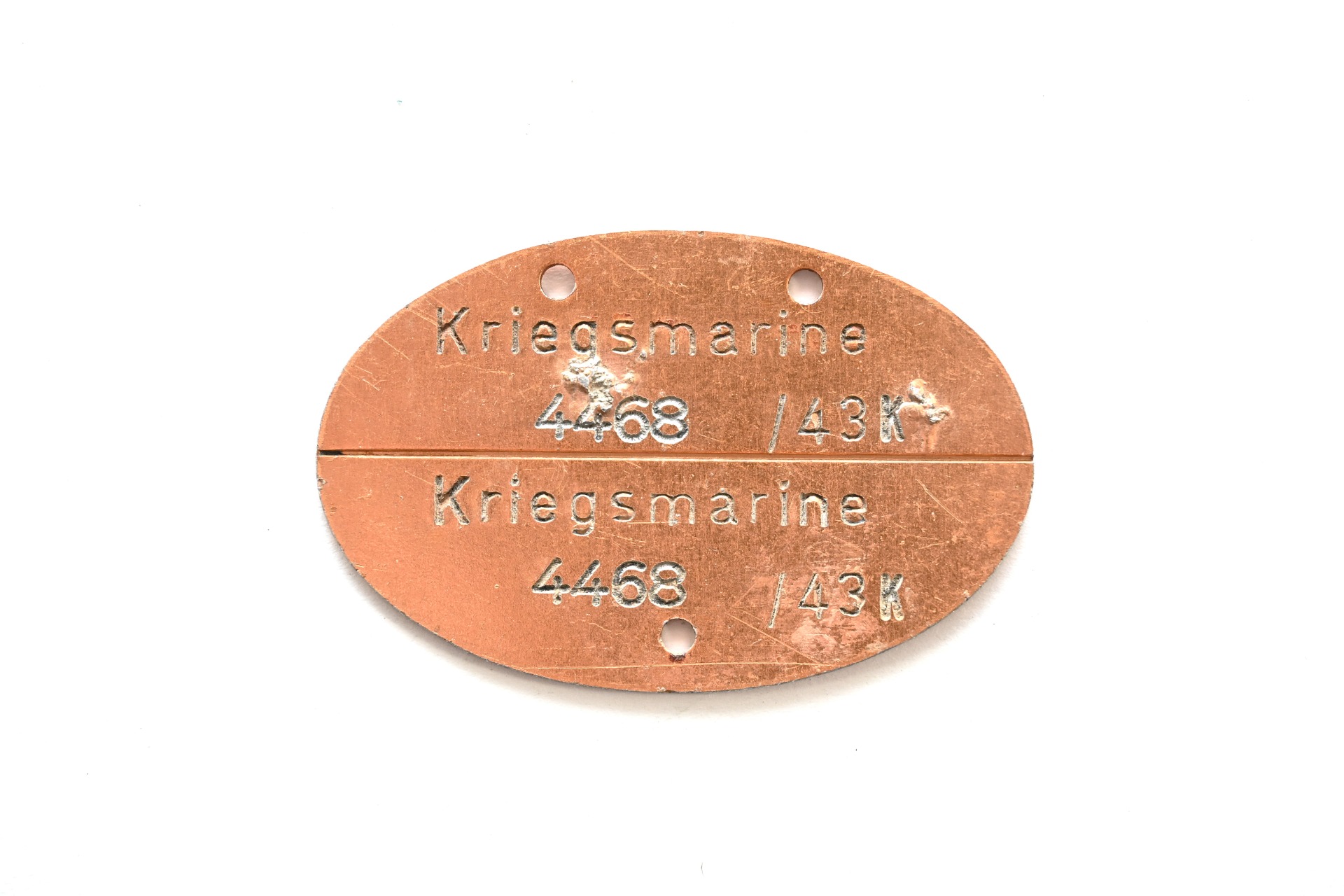 The tag shows overall normal signs of wear. All of the golden finish is present. Its marked with 'Kriegsmarine', the personal number, '43' which means year 1943 and the letter 'K' which stands for Küstendienst Land.