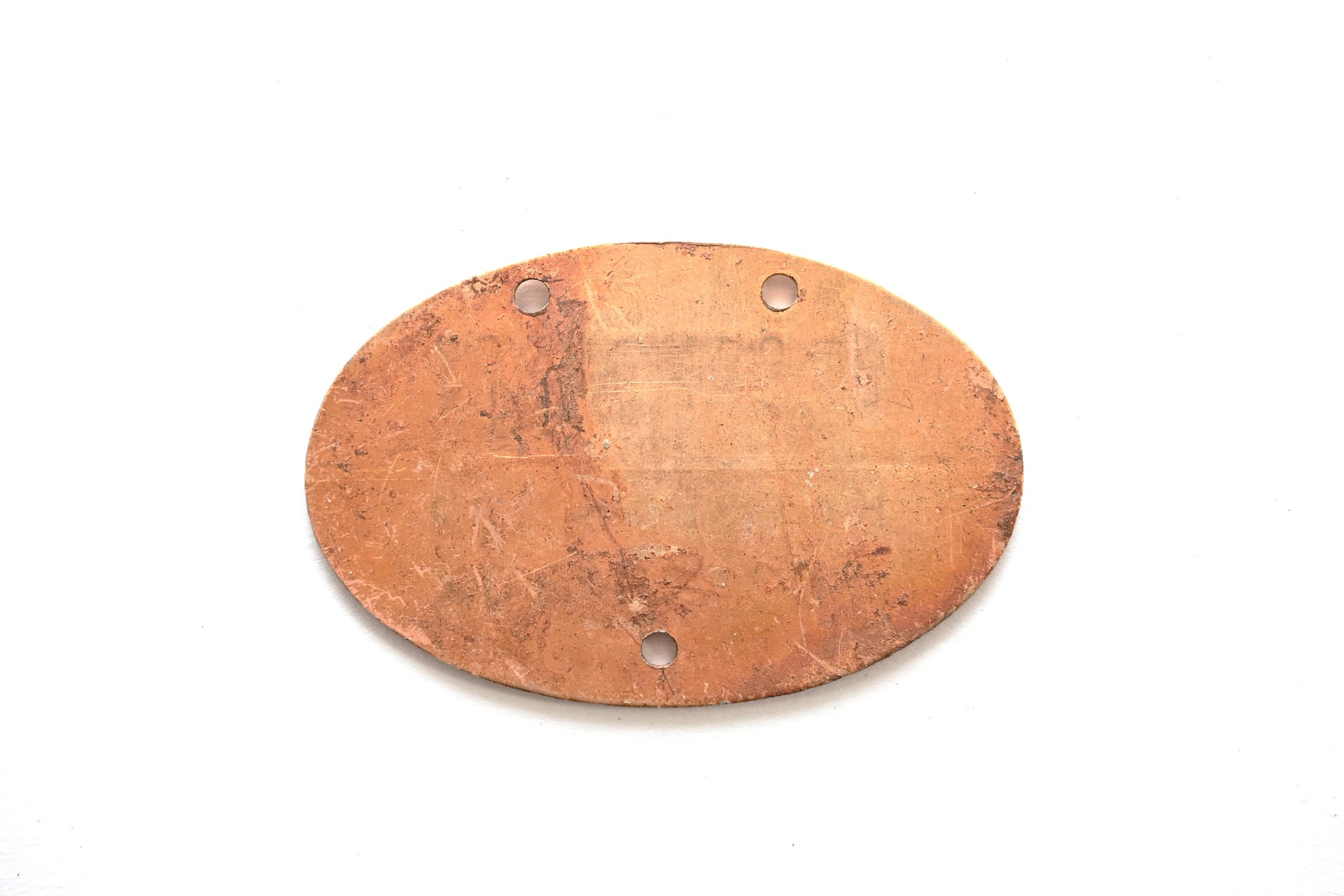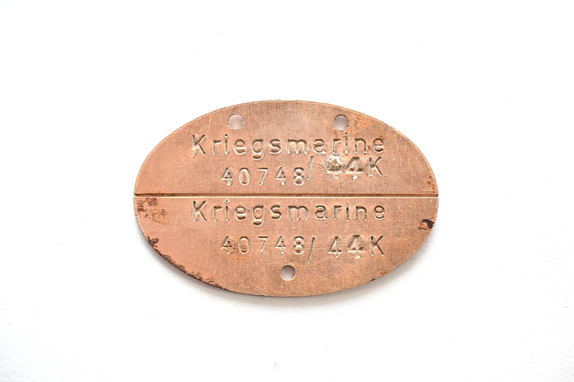 The tag shows overall normal signs of wear. All of the golden finish is present. Its marked with 'Kriegsmarine', the personal number, '44' which means year 1944 and the letter 'K' which stands for Küstendienst Land.