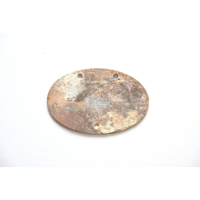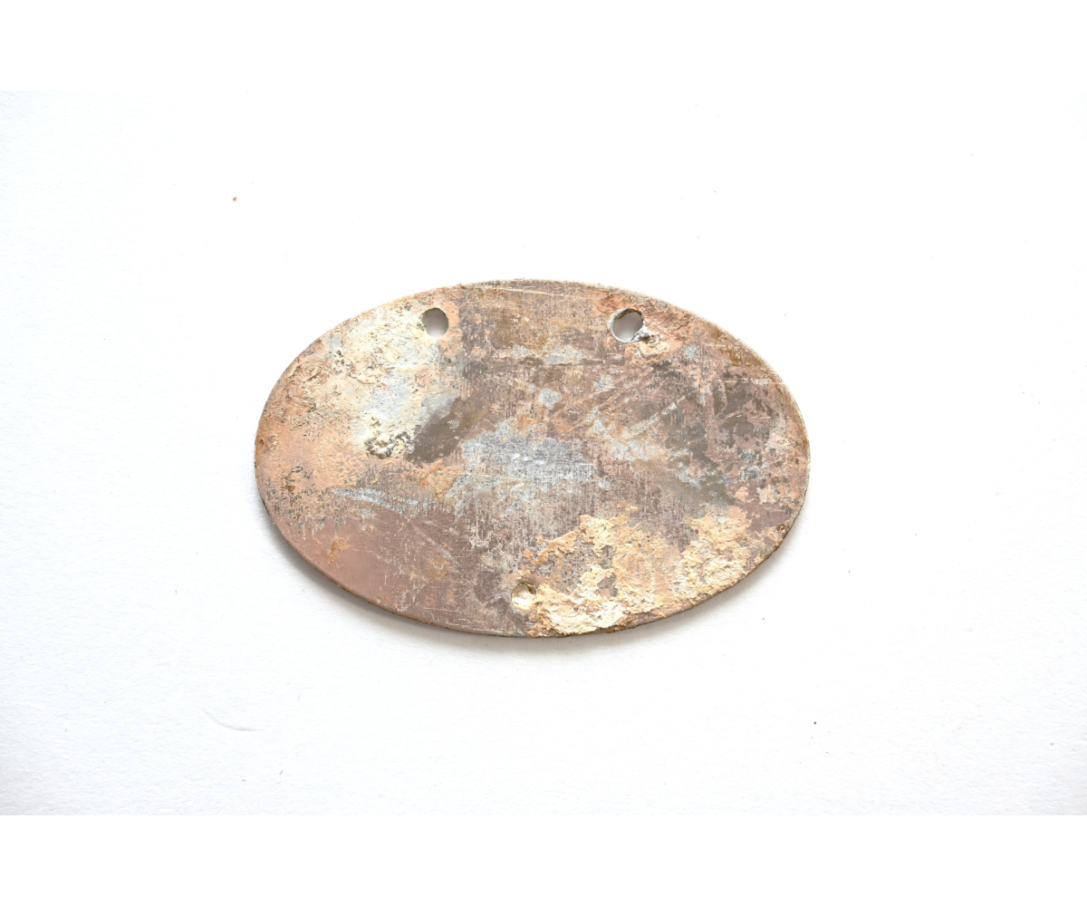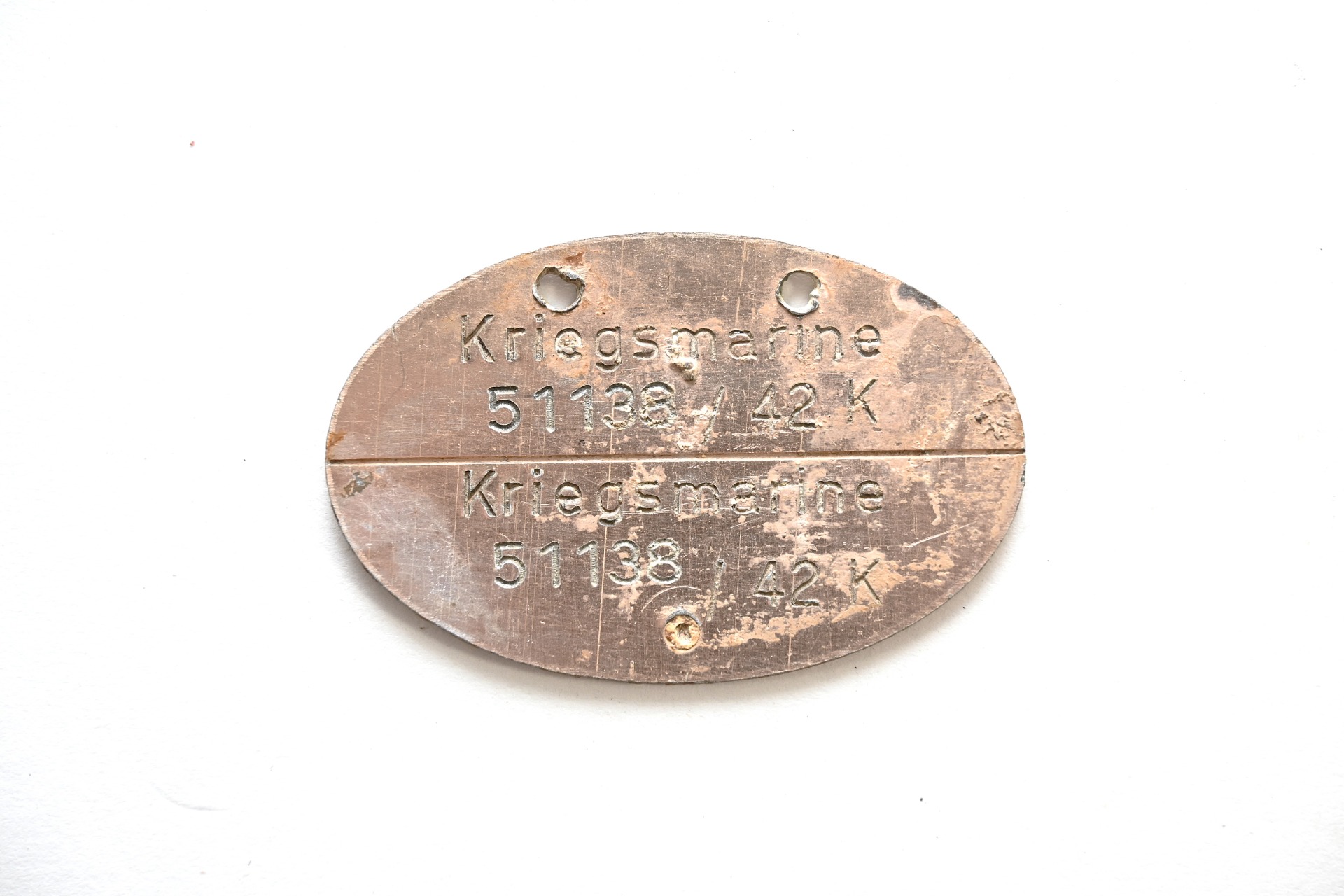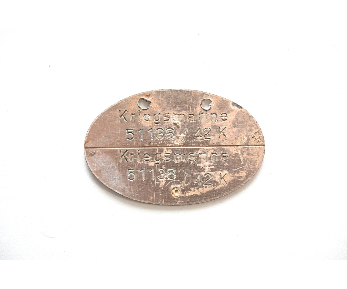 The tag or 'Erkennungsmarke' shows overall signs of wear. Some of the gilding is present, but faded. Its marked with 'Kriegsmarine', the personal number 51136, '42' which means year 1942 he enlisted and the letter 'K' which stands for Küstendienst Land.