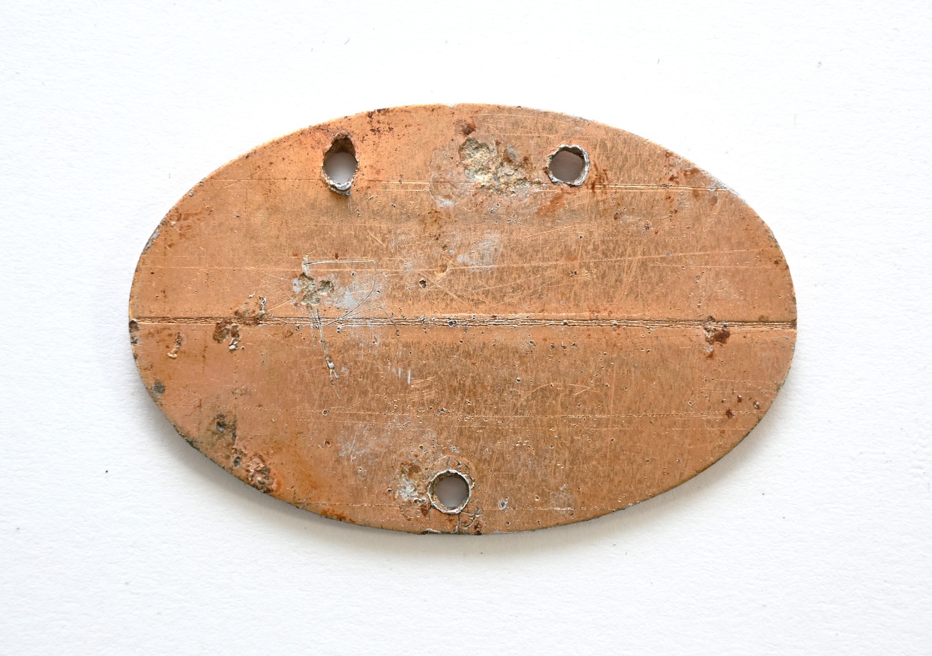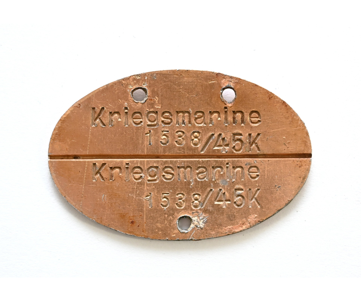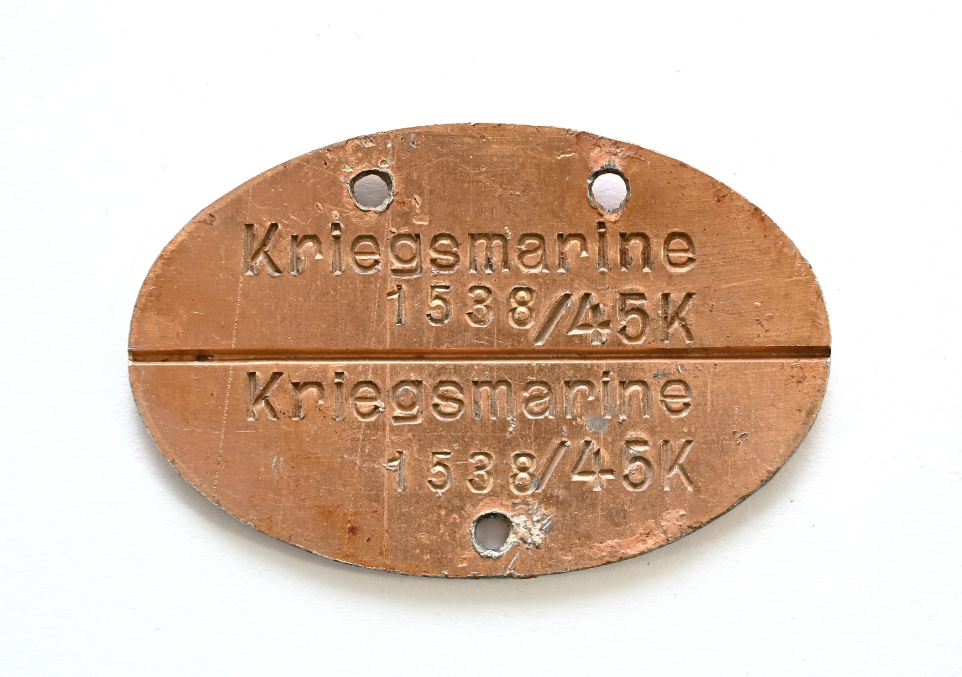 The tag shows overall normal signs of wear. All of the golden finish is present. Its marked with 'Kriegsmarine', the personal number, '45' which means year 1945 and the letter 'K' which stands for Küstendienst Land.