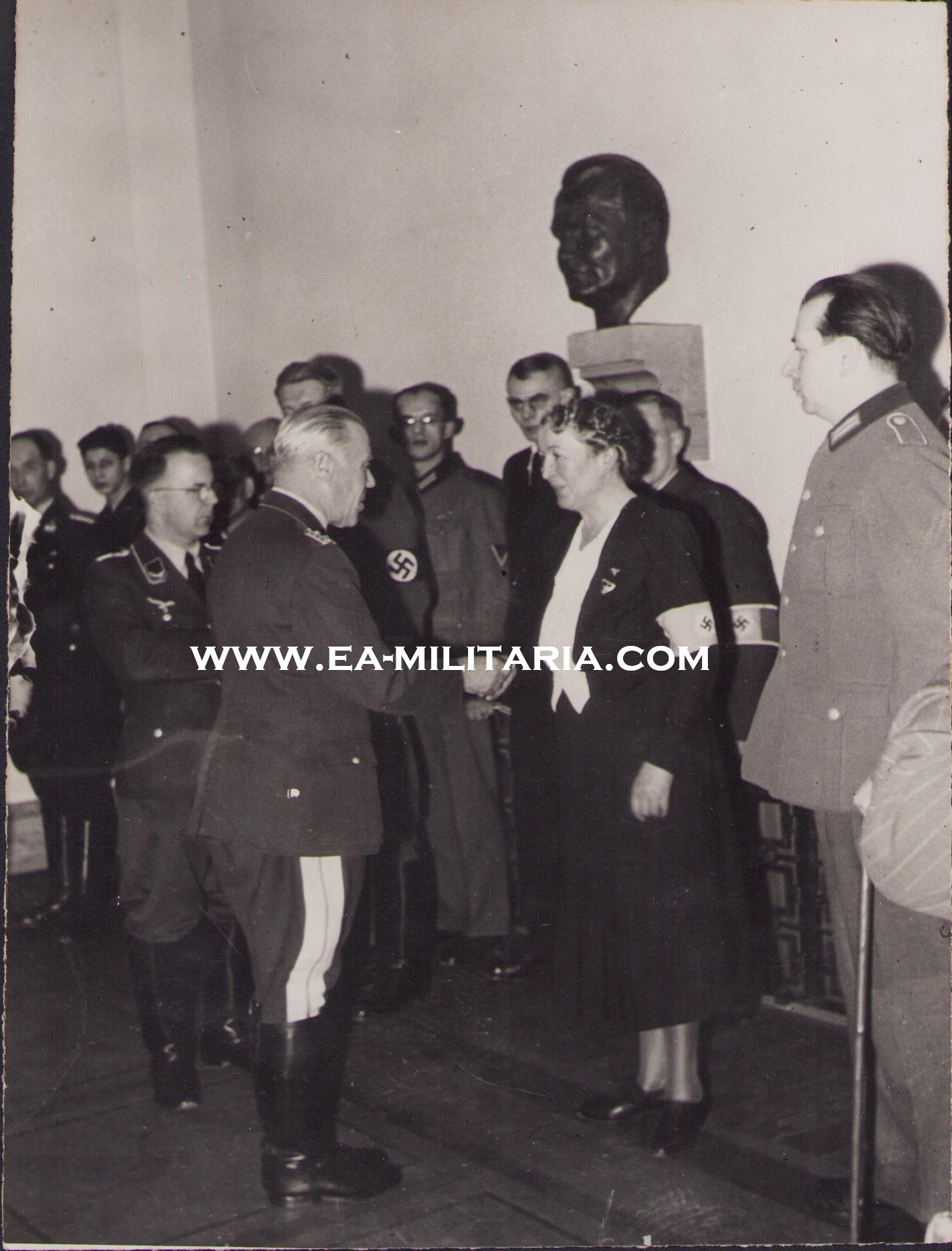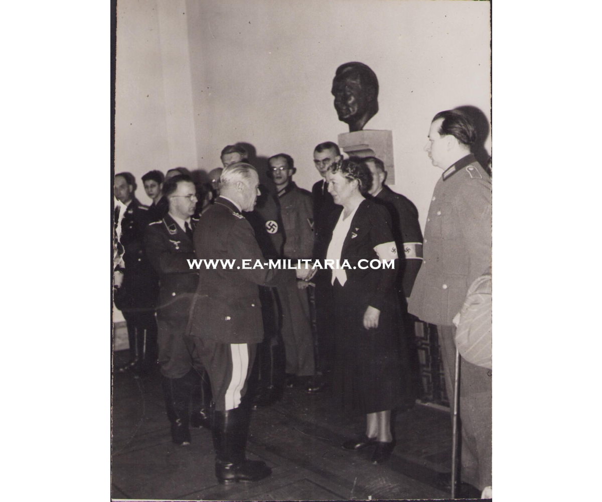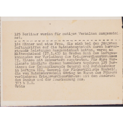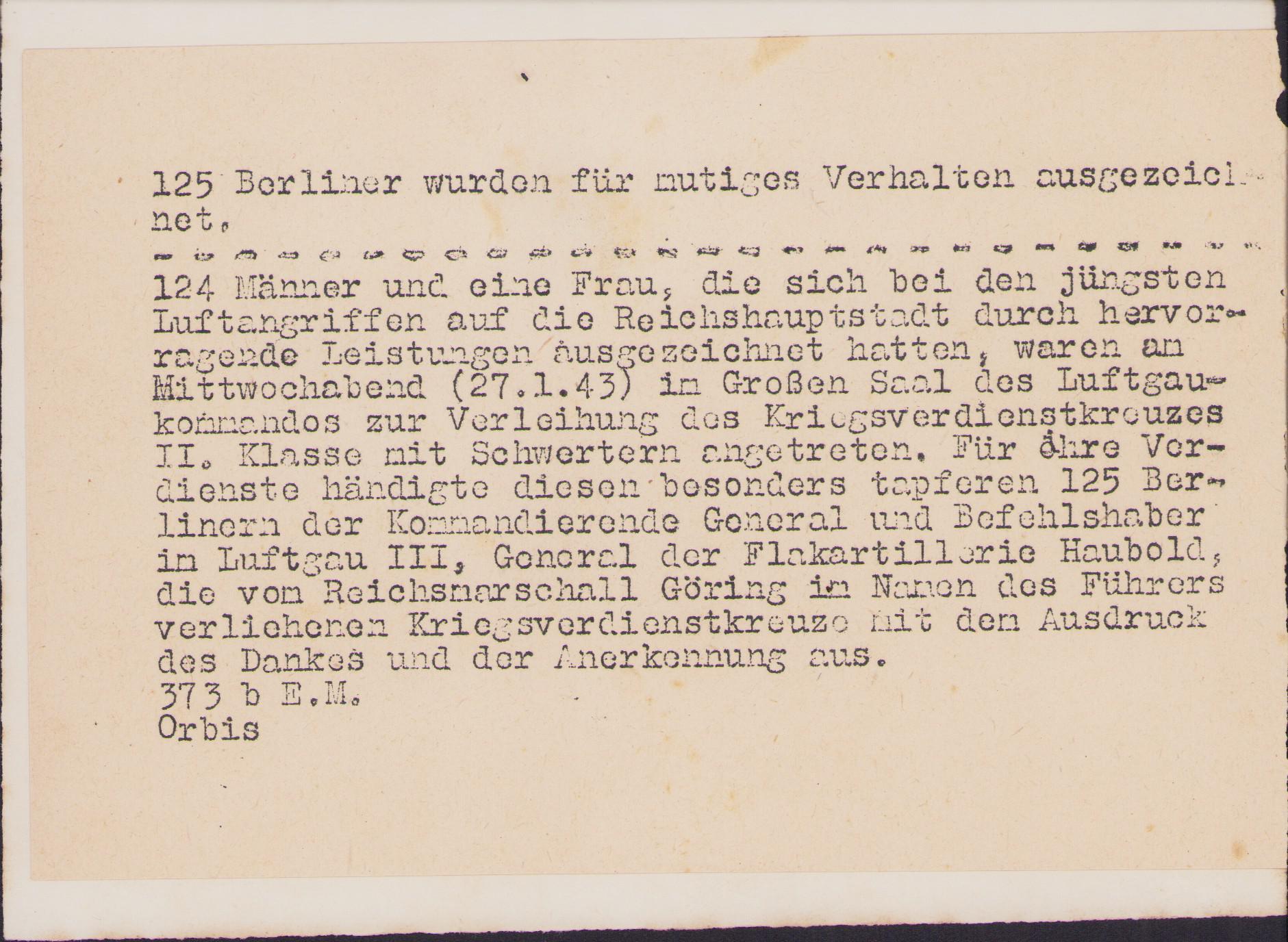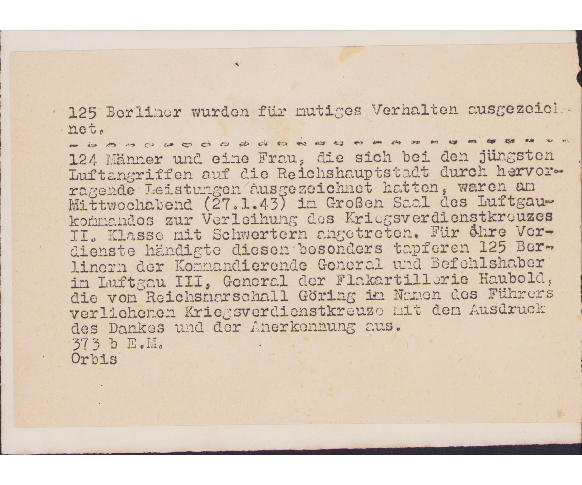 The photograph shows overall normal signs of storage wear. It's complete with paper caption on the back. It was taken during a Kriegsverdienstkreuz 2.Klasse mit Schwertern award ceremony that took place on the 27th of January 1941. The medal was award to 124 men and 1 woman (see picture) because of their heroism during a air attack on Berlin.
