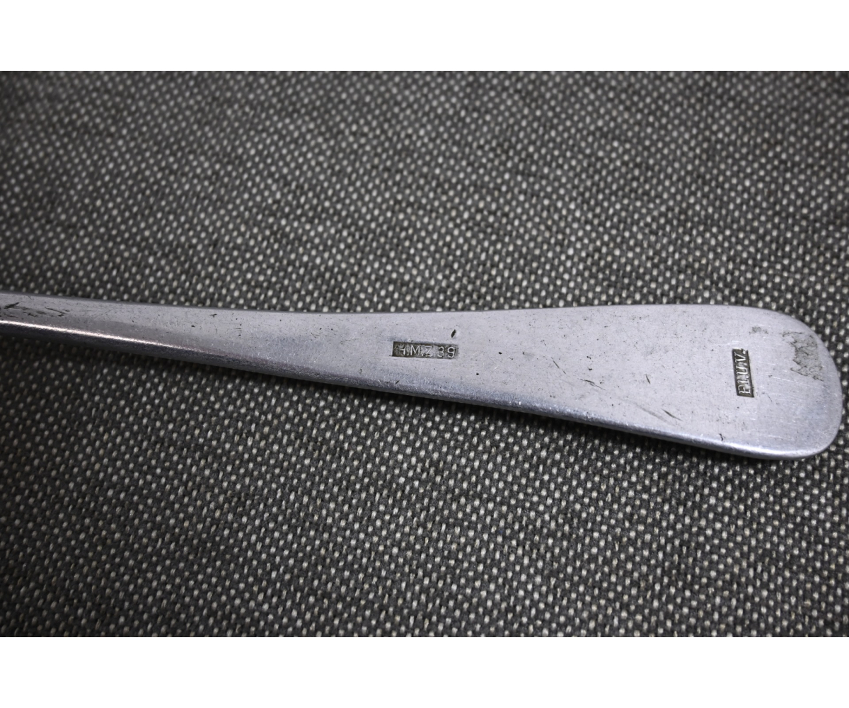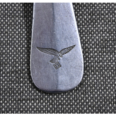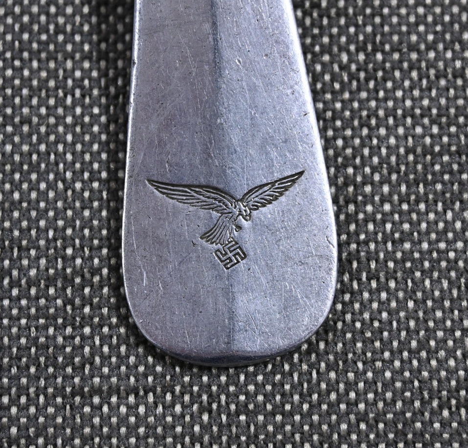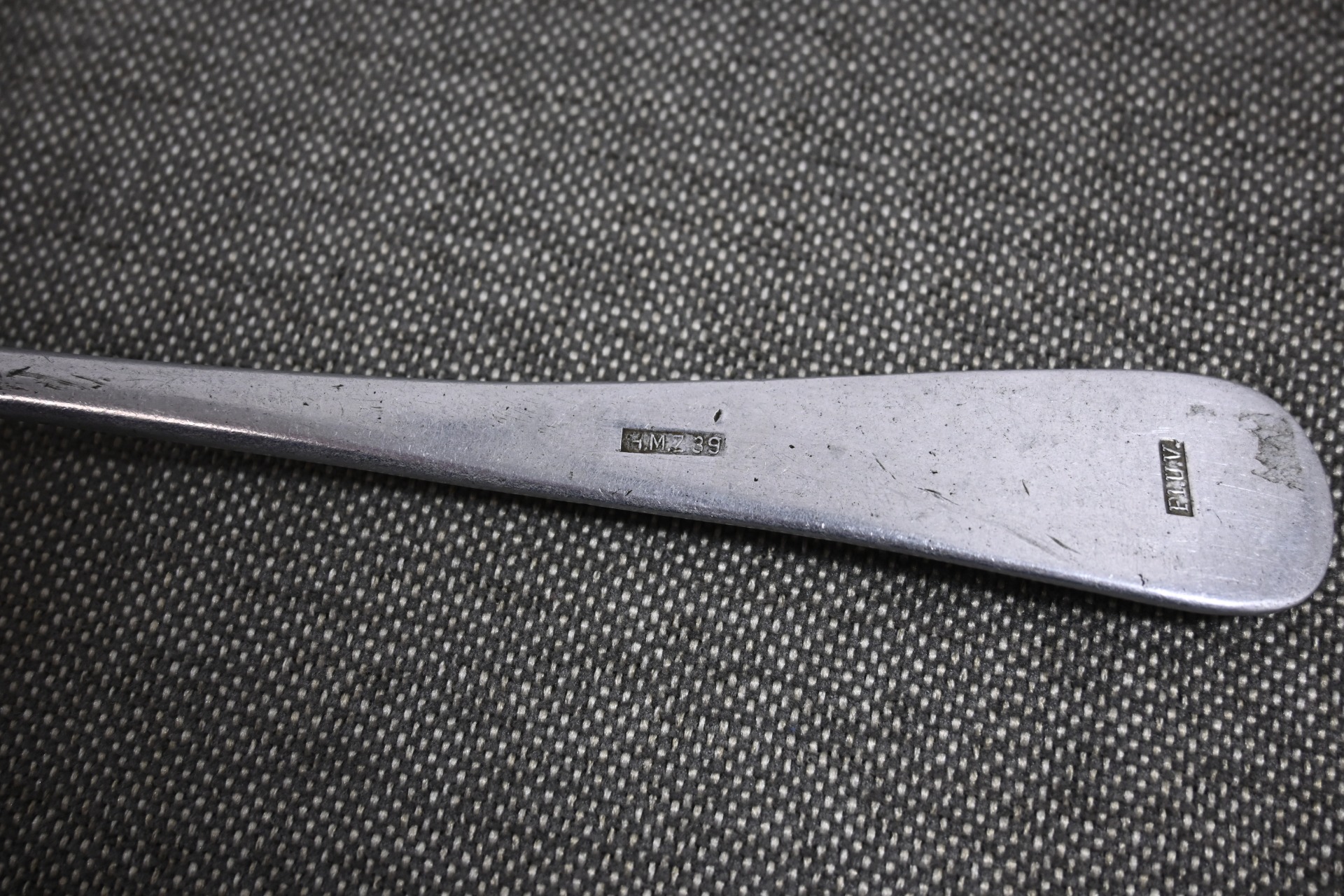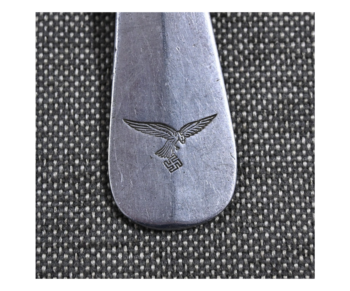 The spoon shows overall normal signs of wear. The handle is maker marked 'H.M.Z.', dated '1939' and marked 'F.L.U.V.'. The front of the handle is marked with the Luftwaffe eagle. Total length 30cms.