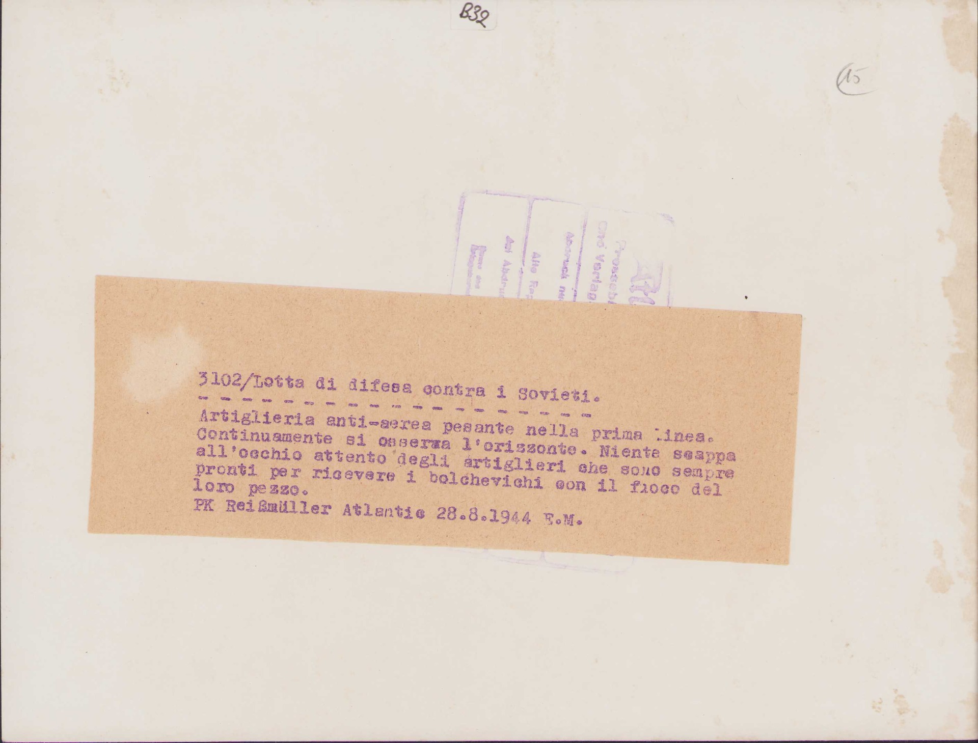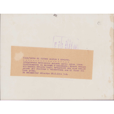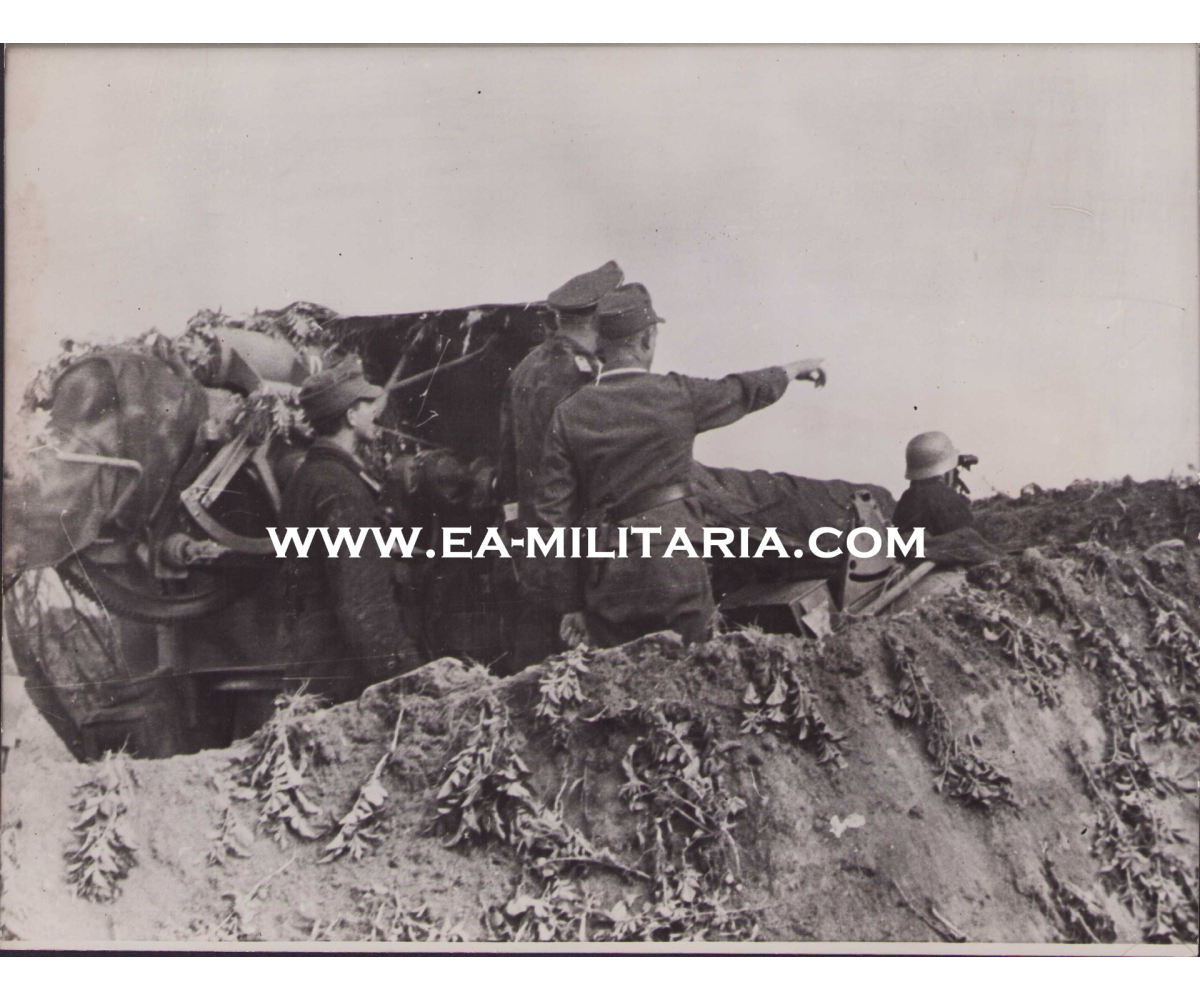 The photograph shows overall normal signs of wear. It's complete with (Italian) paper caption on the back. It shows a Flak gun crew scanning the horizon in search of a target. Photo was taken on the eastern front.