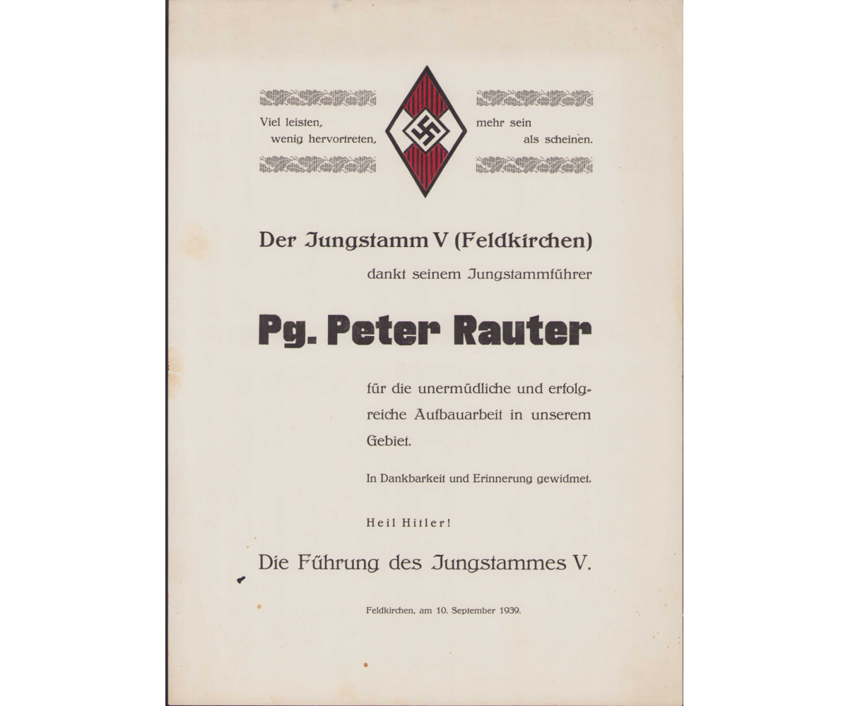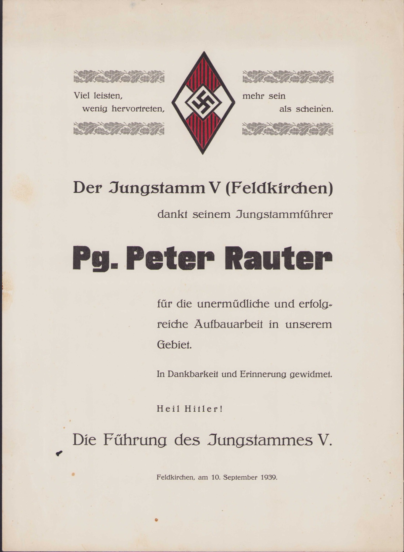 The document shows overall normal signs of wear. It was awarded to Jungstammführer Peter Rauter for his tireless and successful development work in our region. Issued on the 10th of September 1939.