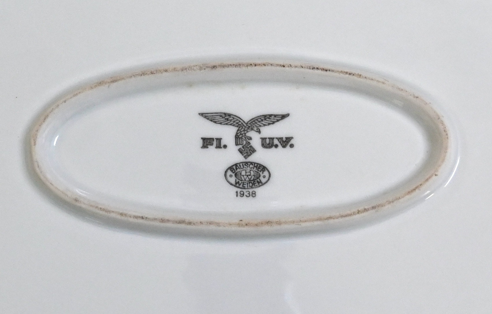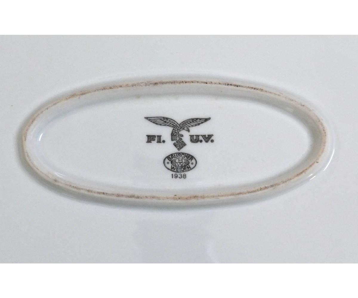 The platter shows overall normal signs of user scratches. The size is approx 40cms x 26,5cms. It's nicely maker marked by 'Bauscher' from 'Weiden' marked with the early 'droop-tail' Luftwaffe eagle and dated '1938'.