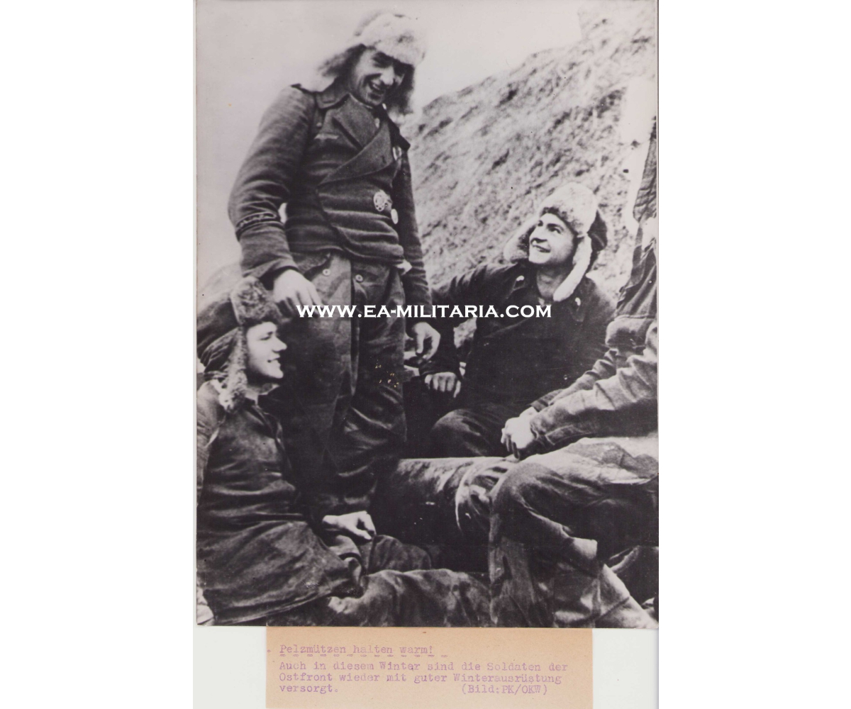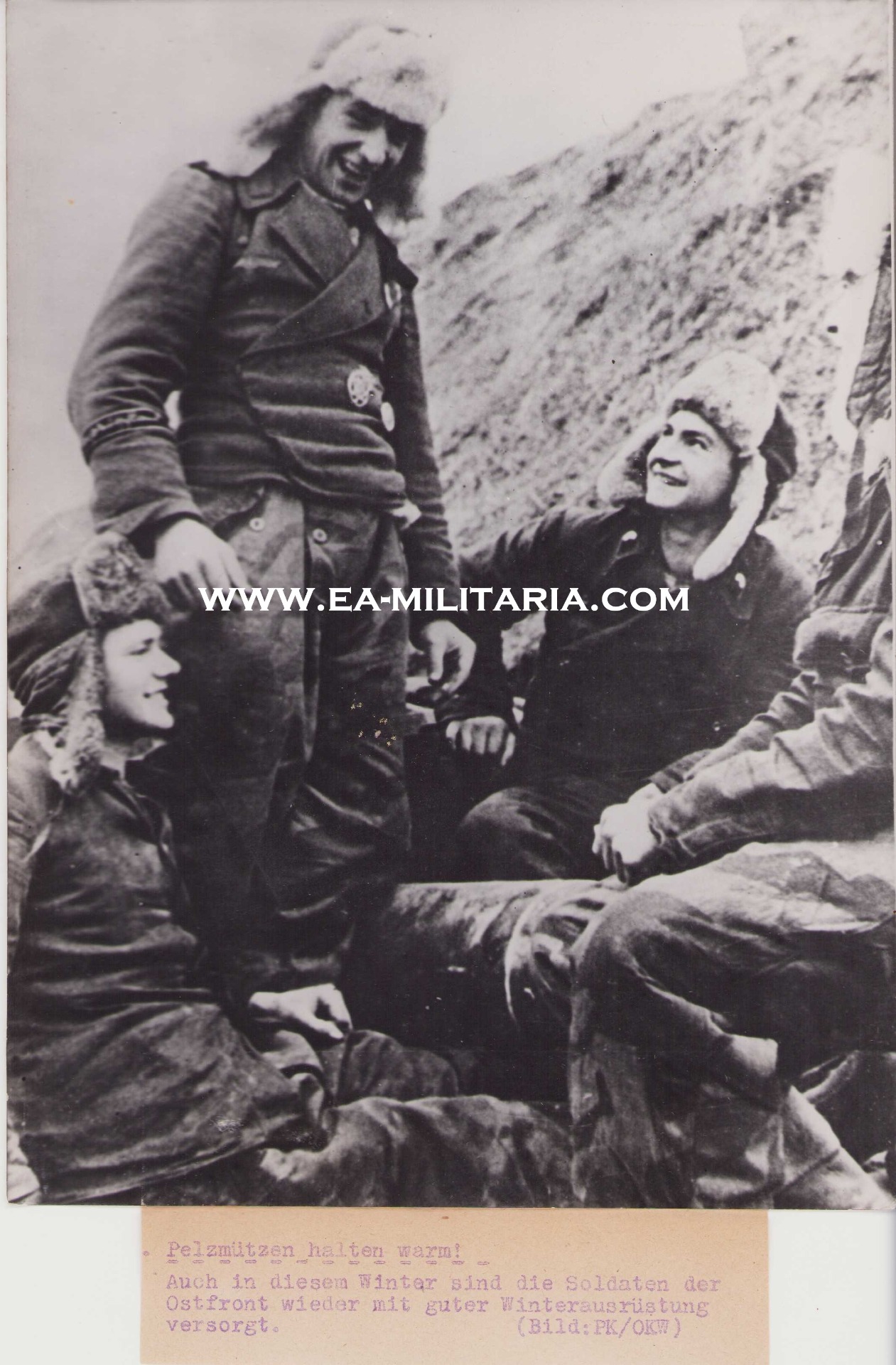 The photograph shows overall normal signs of wear. It's complete with paper caption attached to the bottom. The 4 Panzer soldiers are wearing their Winter Pelzmutzen. Note the Großdeutschland (sutterlin style) cuff title on the soldiers (the one standing) right arm.
