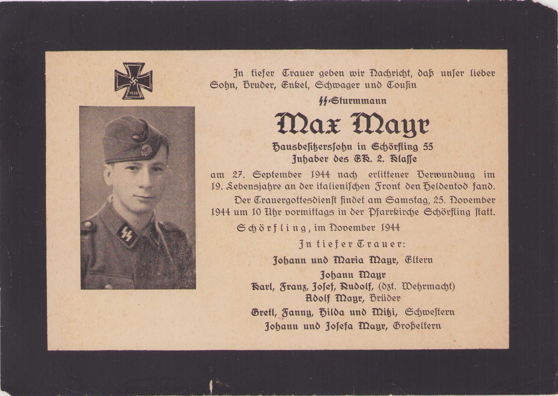 Death notice of Max Mayr who died in September 1944 in Italy.